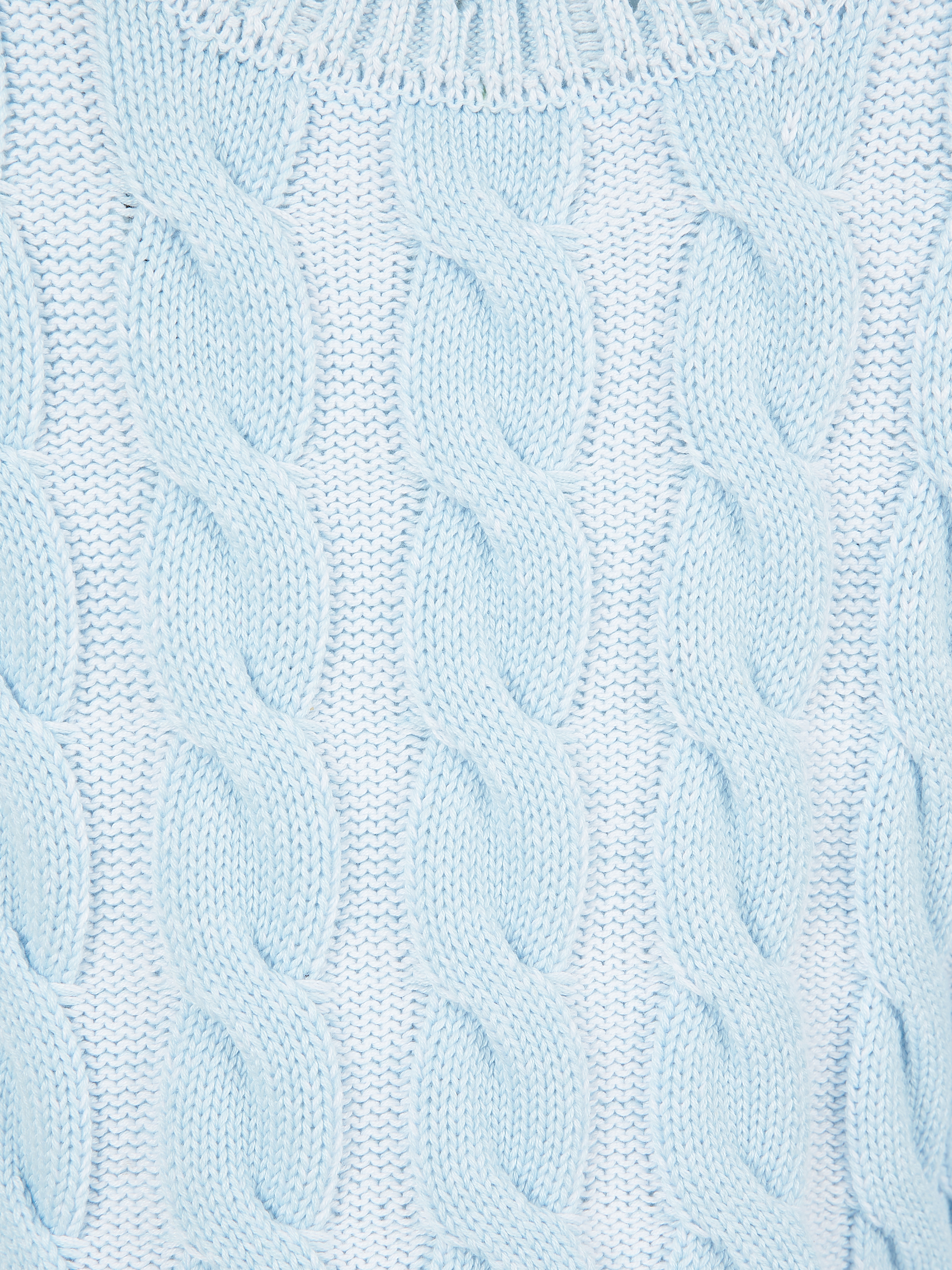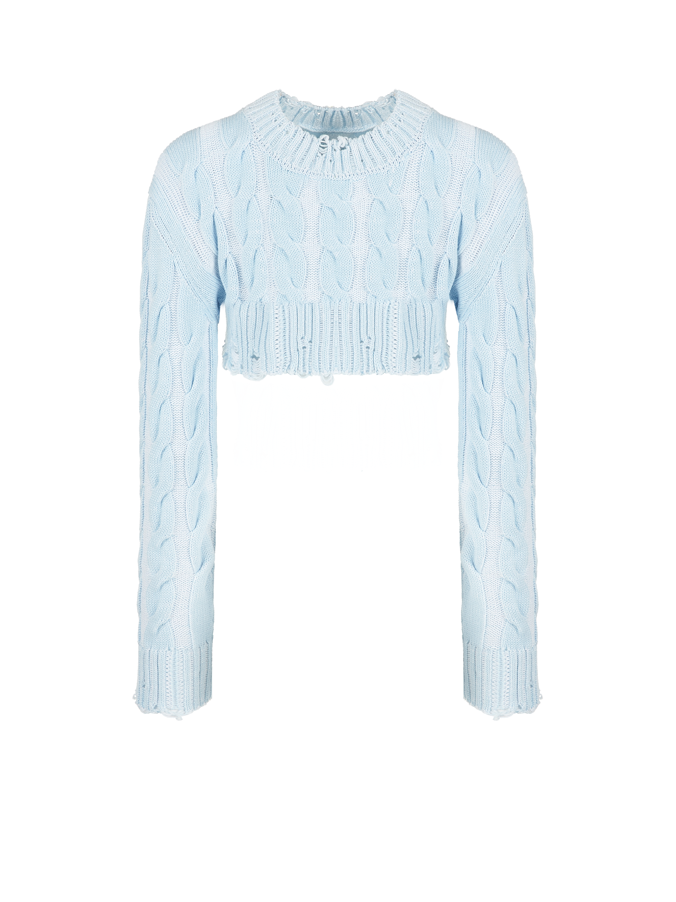 Light blue cropped sweater in a cotton blend with cables. The classic design looks fresh and modern thanks to the use of two shades of yarn and decorative rips that adorn the collar, hem, and cuffs. Mix and match with high-waisted jeans or trousers.