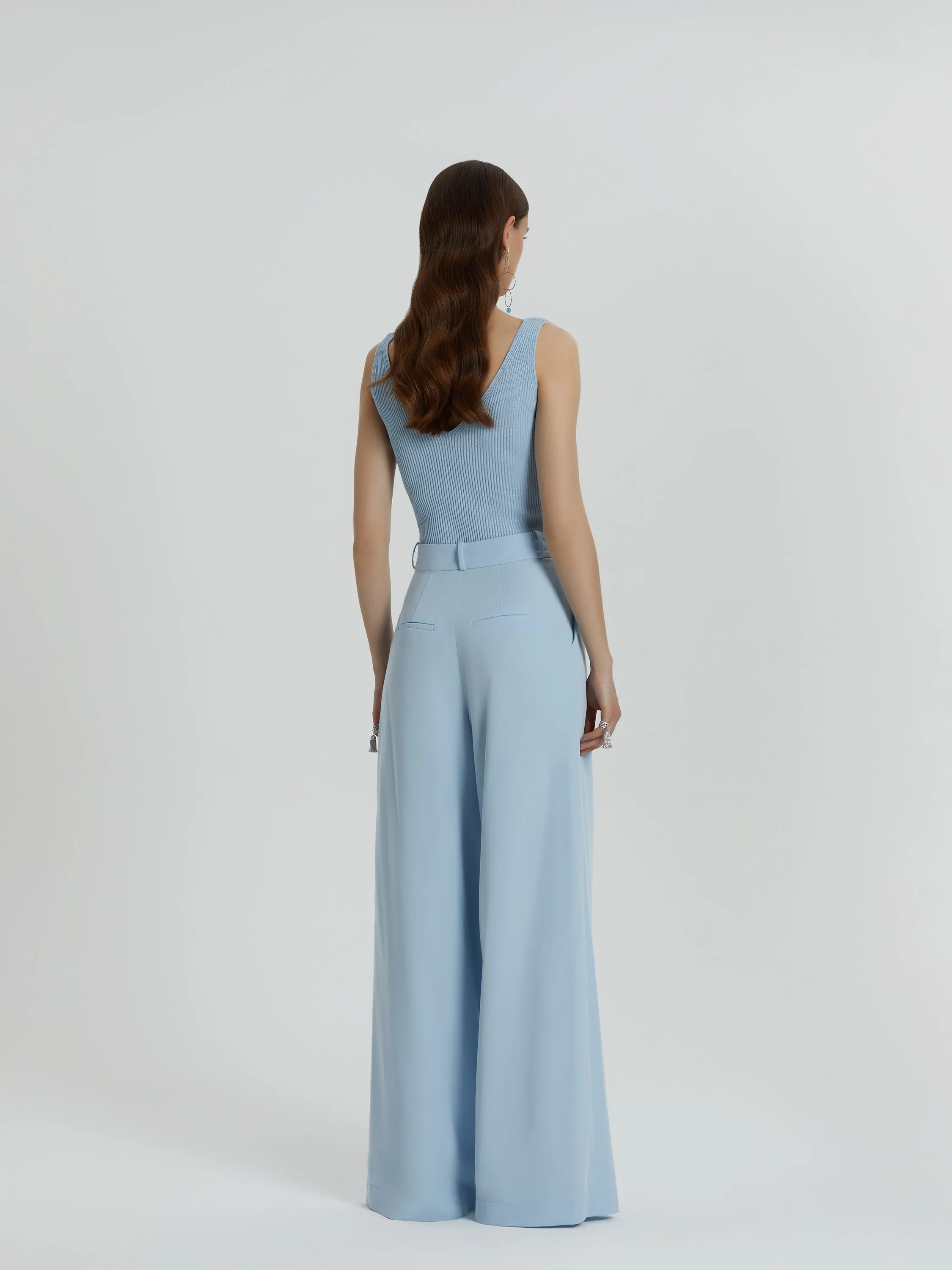 The light blue wide palazzo trousers with a high waist are made of matte suiting fabric and complemented with large pleats at the waist. Pair with the matching top trimmed with weightless feathers to create a romantic and elegant look. When purchasing the set, the price for this outfit will be automatically reduced.