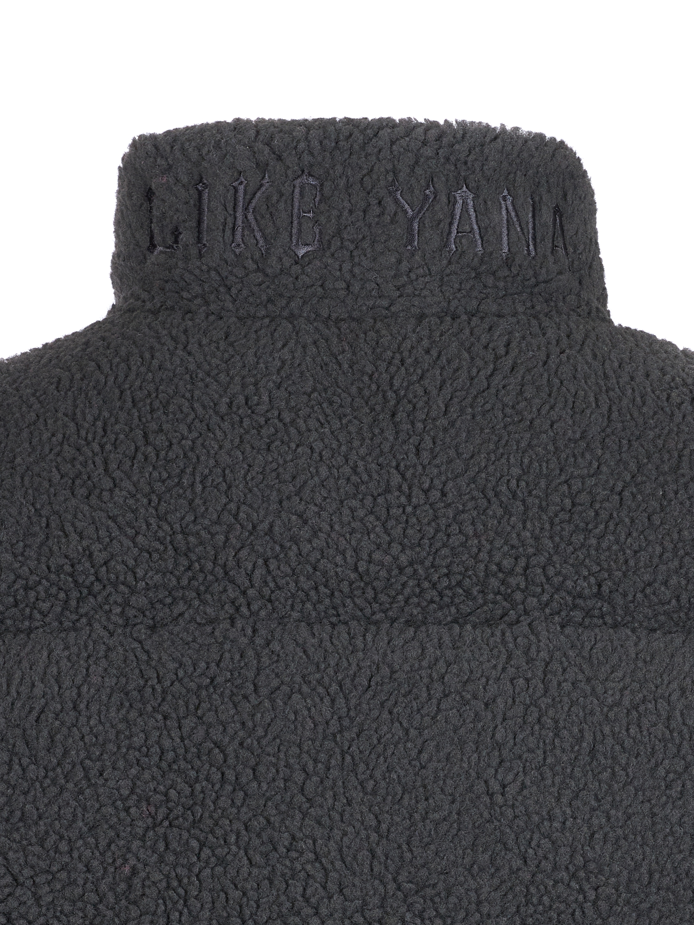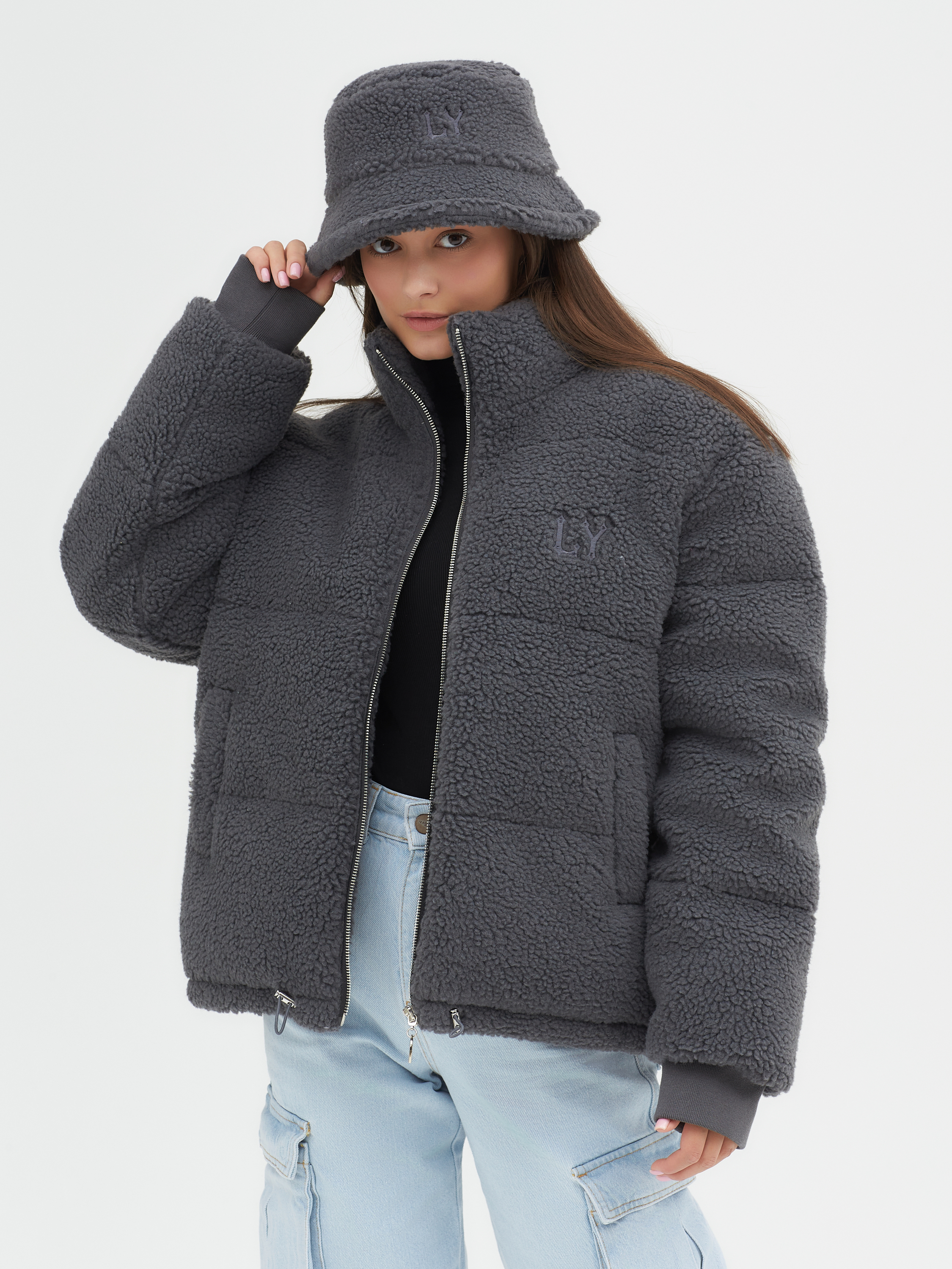 The short dark grey zip-up puffer jacket is made of teddy faux fur and complemented with branded embroidery on the chest and collar. High-quality synthetic down with a density of 420 g/m2 is used as insulation, which, combined with the outer layer of faux fur, allows you to wear the jacket at temperatures down to –30 degrees. The model is 173 cm tall.