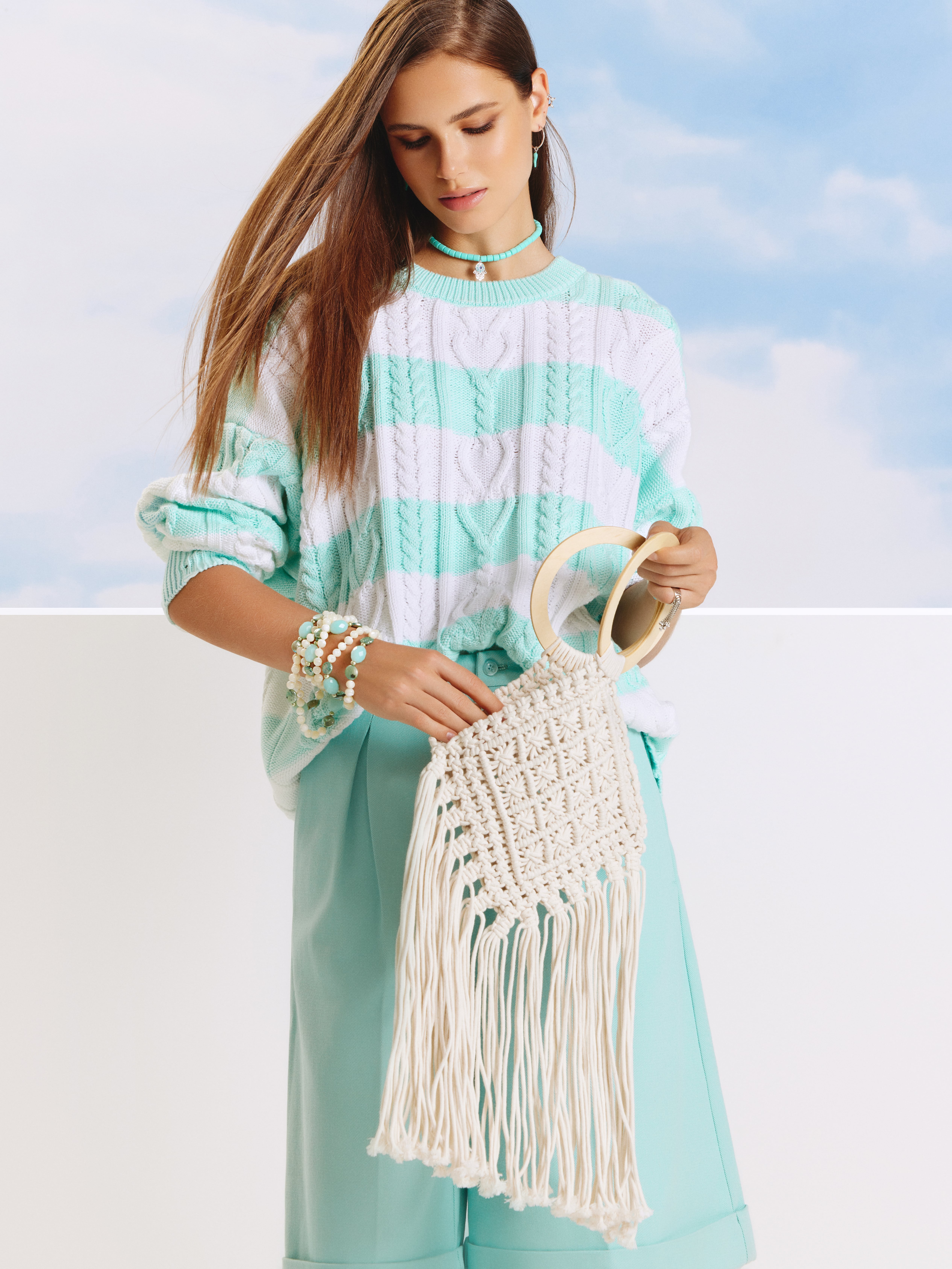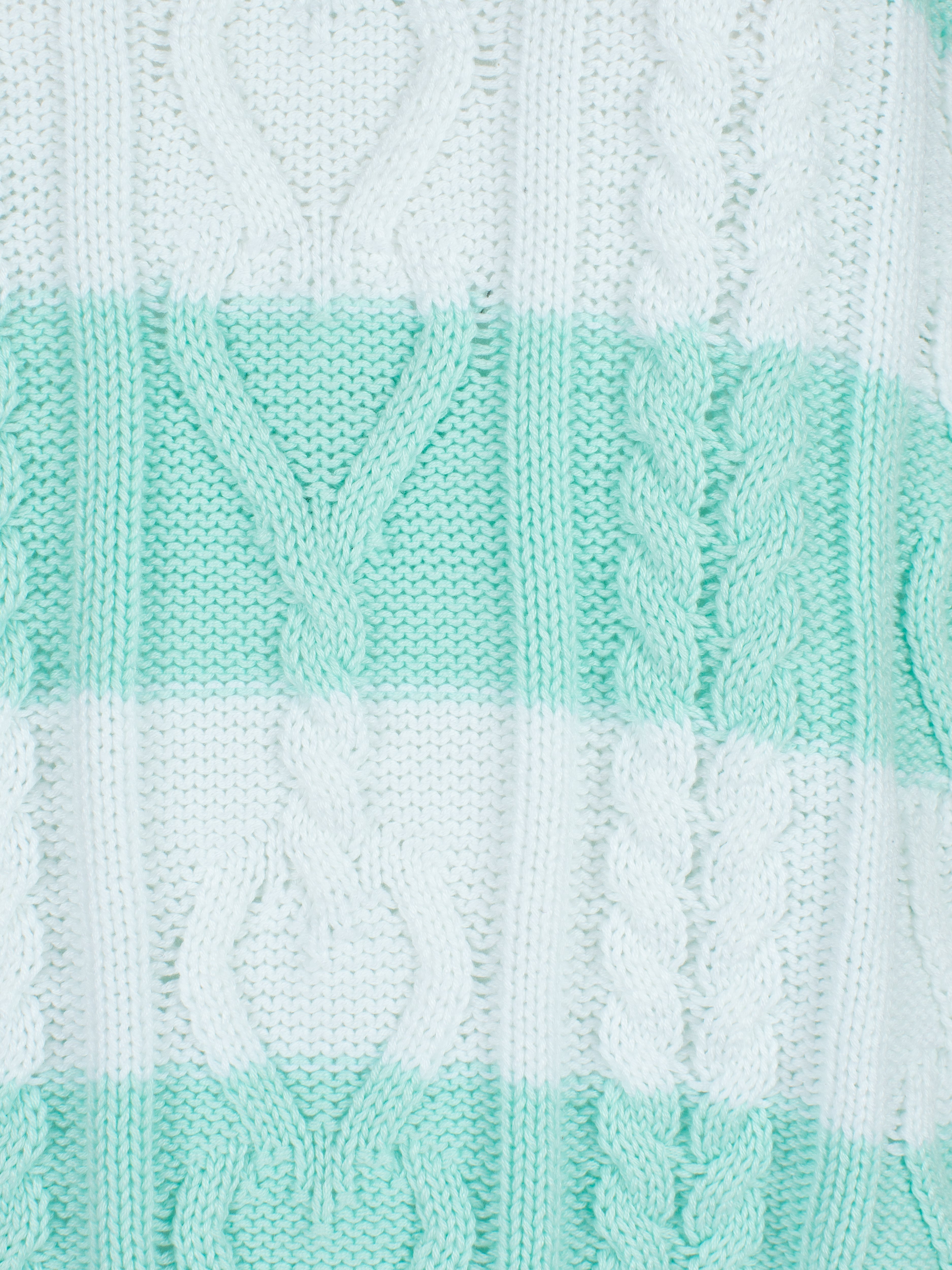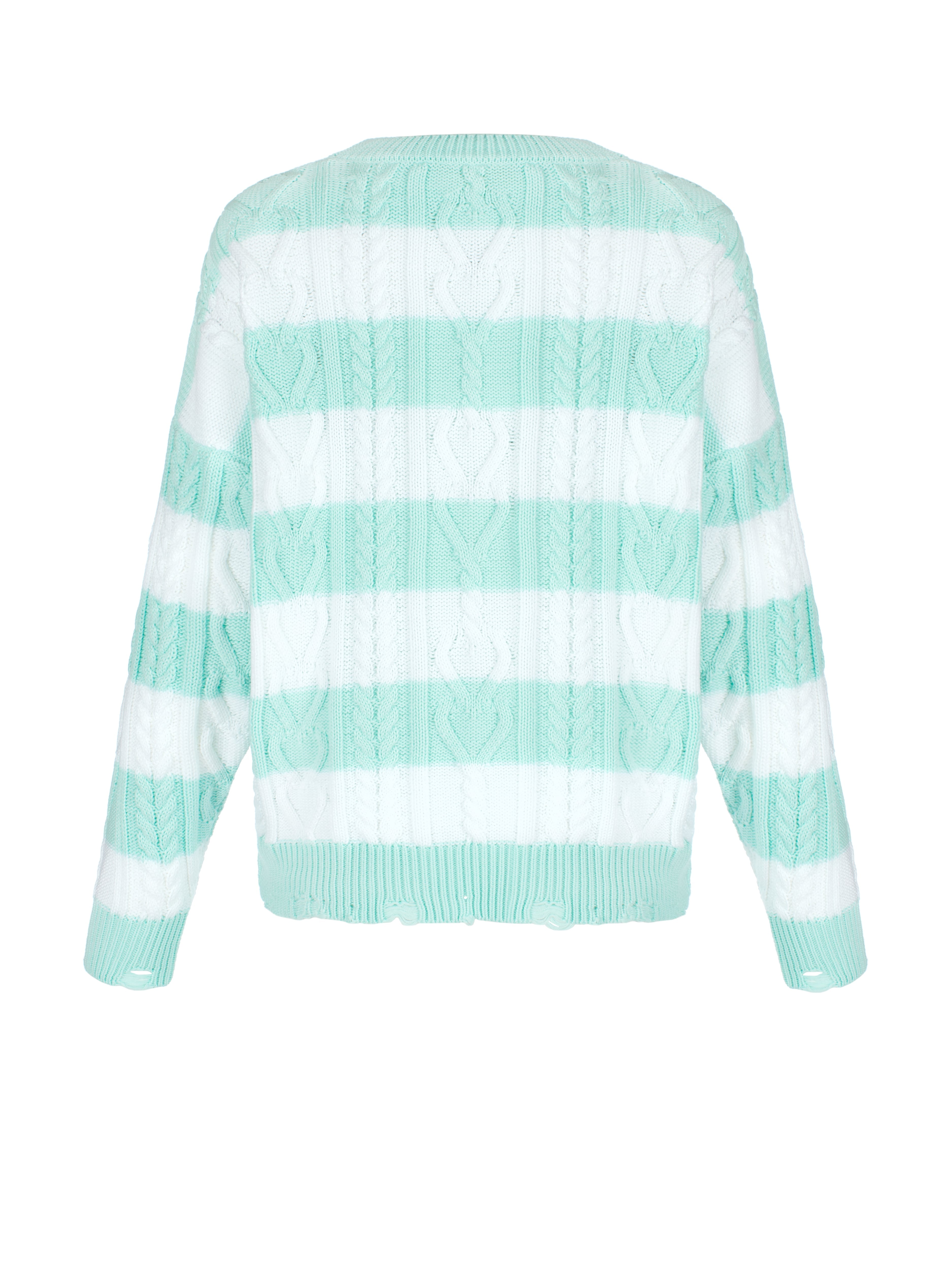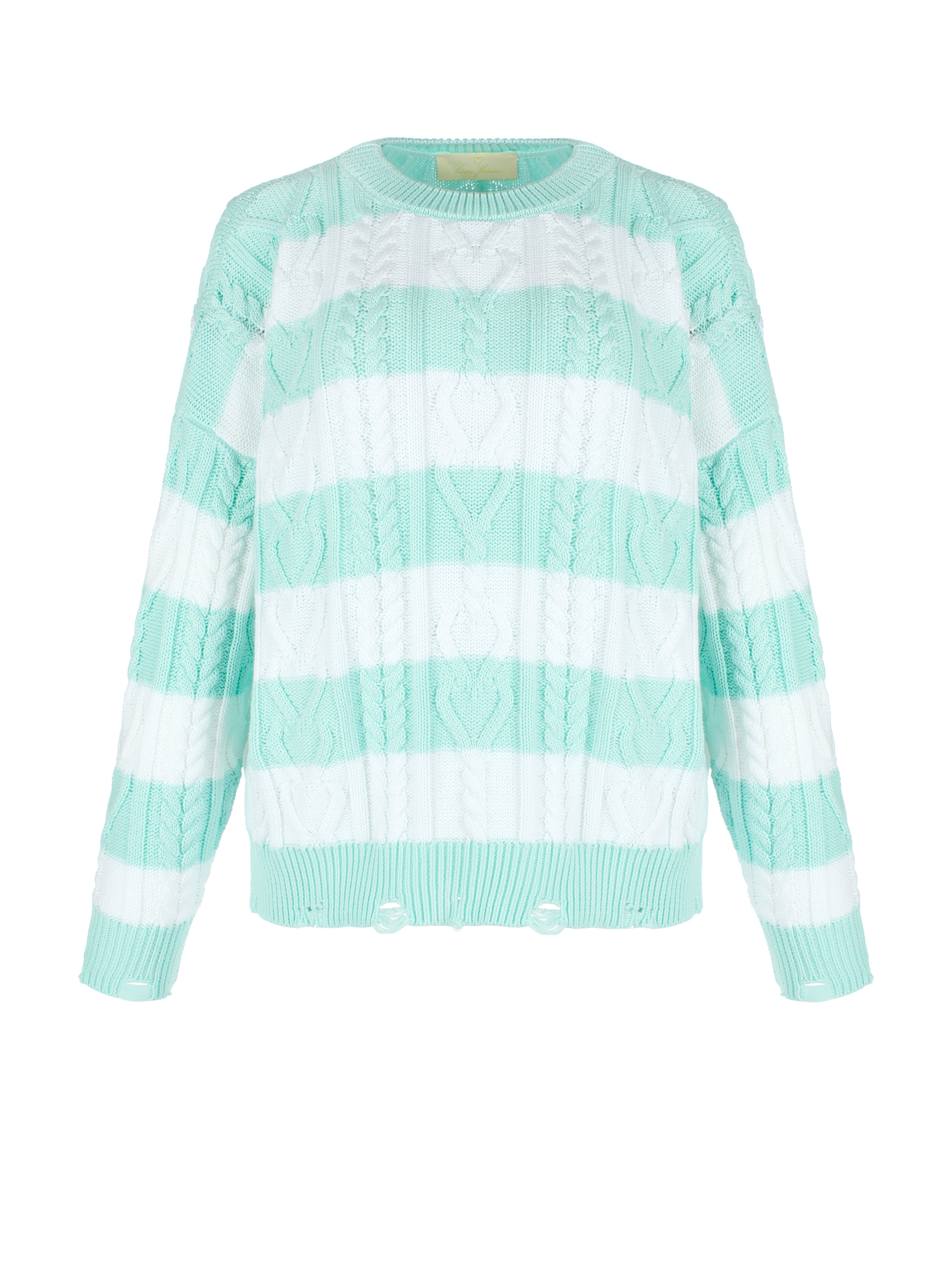 A lightweight oversized sweater in mint and white stripes made of cotton blend with a cable knit pattern. The classic design looks fresh and modern thanks to the dropped stitches that decorate the ribbing and cuffs.