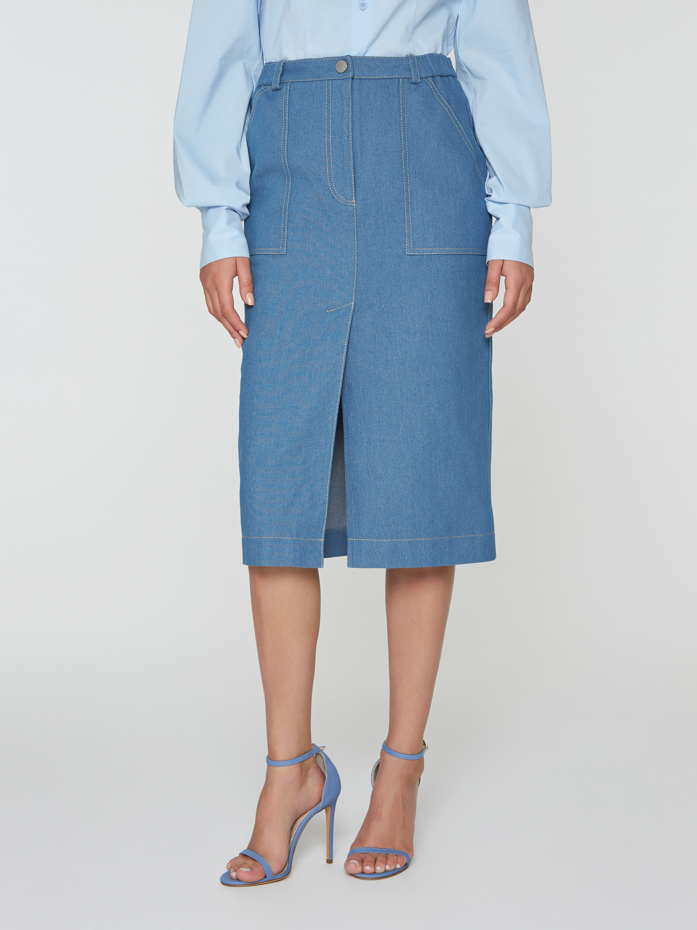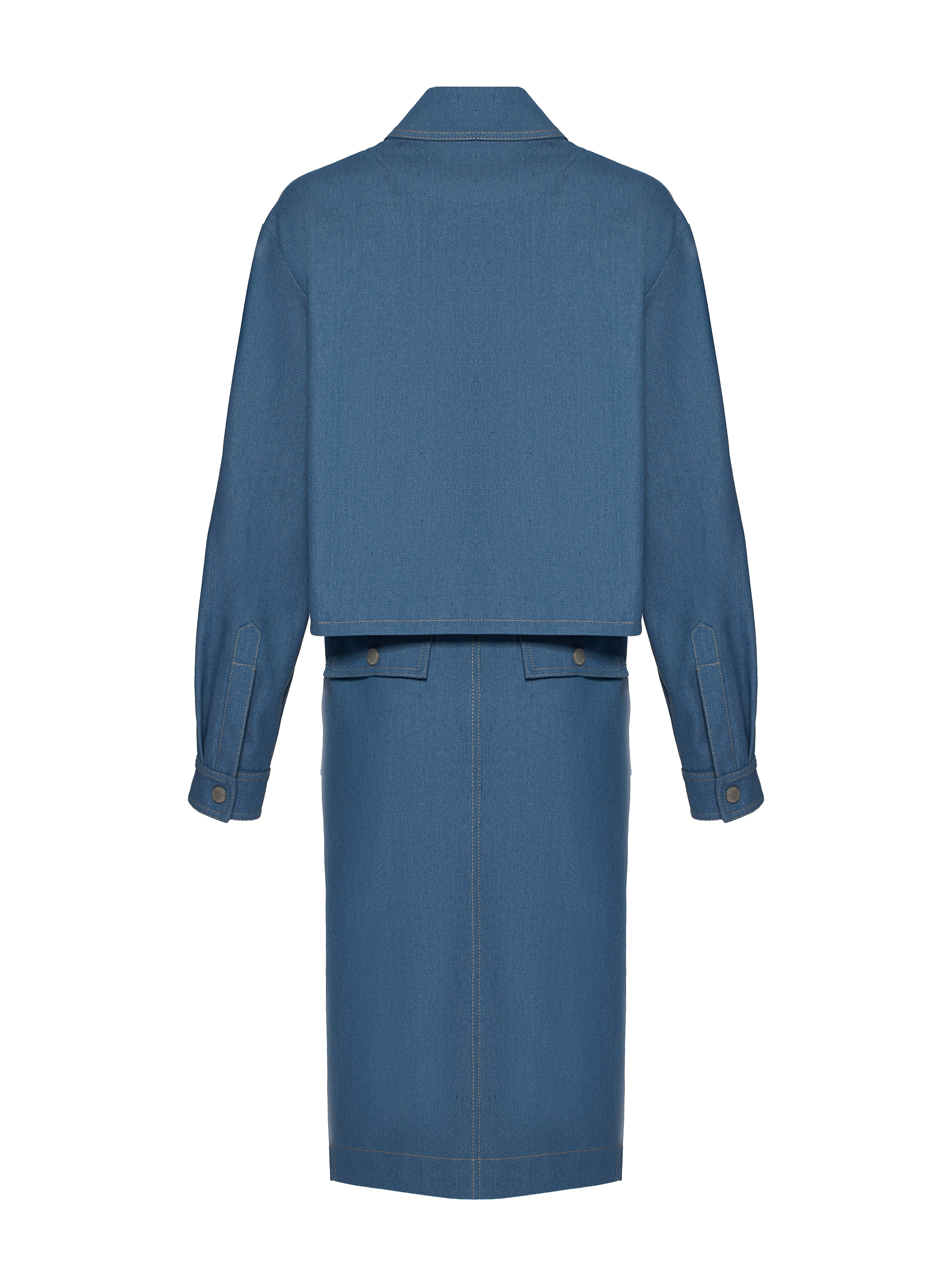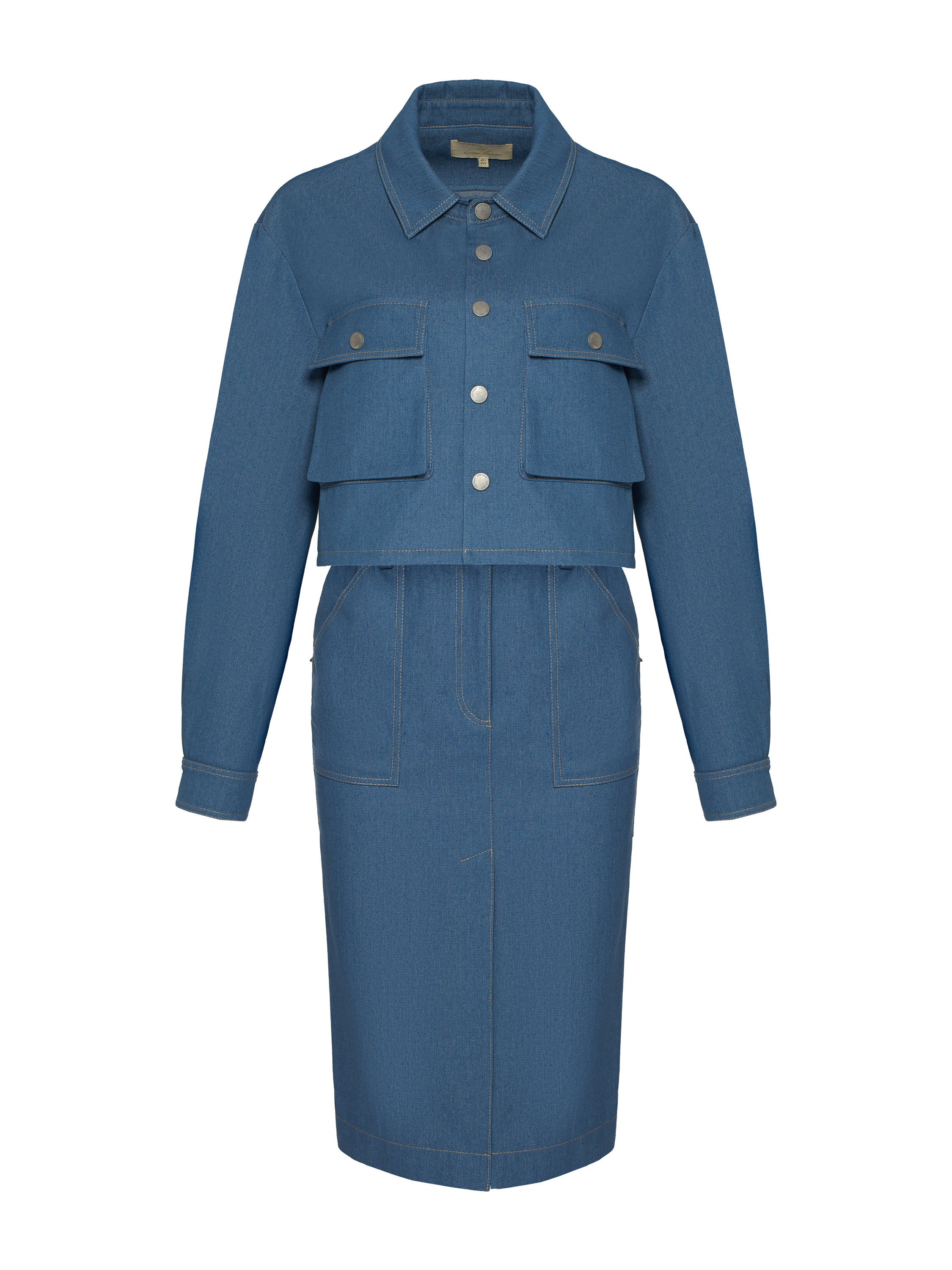 The blue two-piece suit is made of cotton denim. The material is practical and easy to care for, so denim garments keep their shape and maintain a flawless appearance. The oversized jacket with large chest pockets is complemented with a turn-down collar and contrasting golden seams. The midi skirt features side slit pockets and a front slit. On the model: size XS/S. Height: 173 cm.