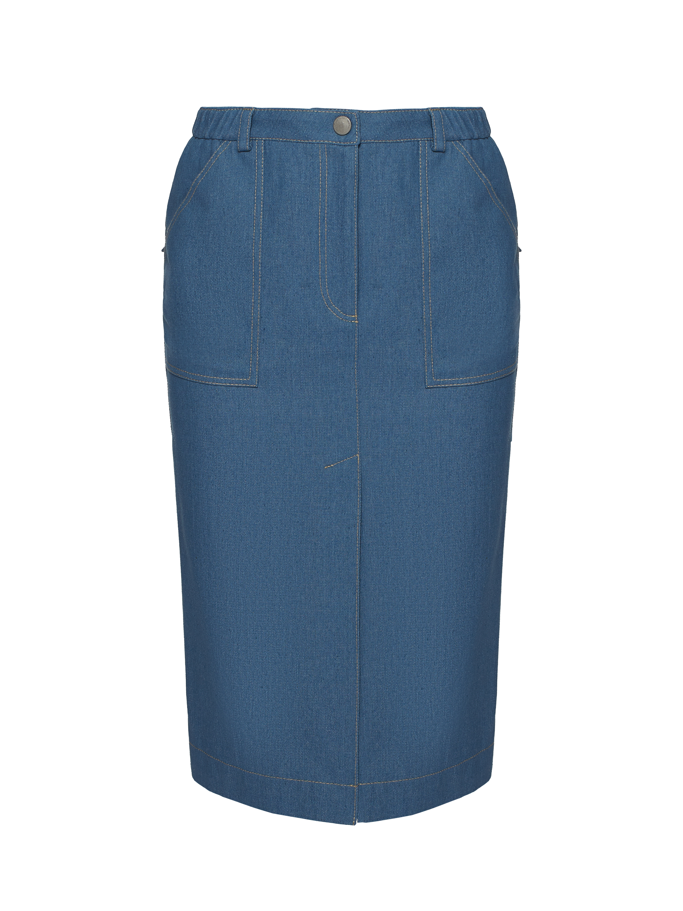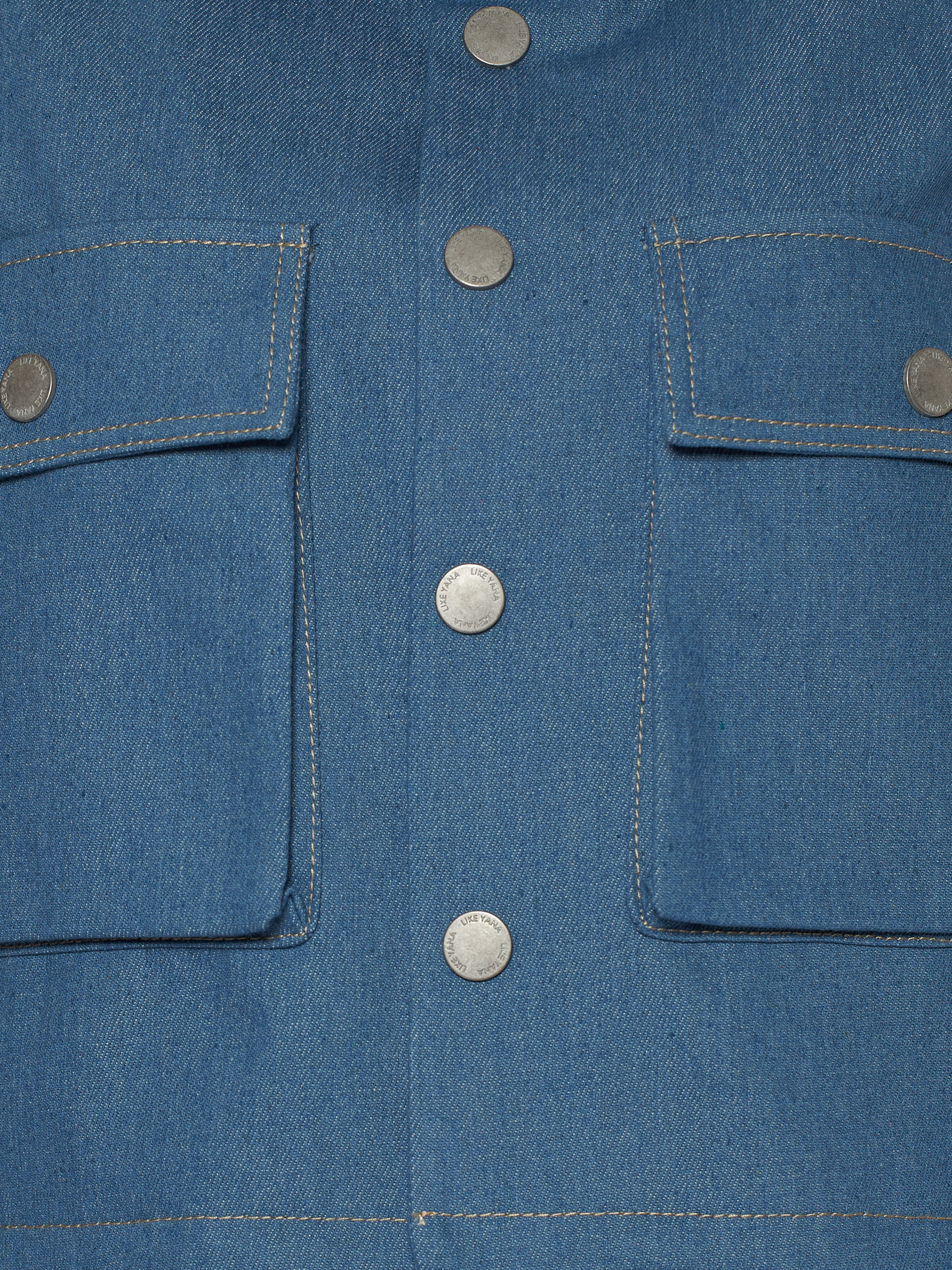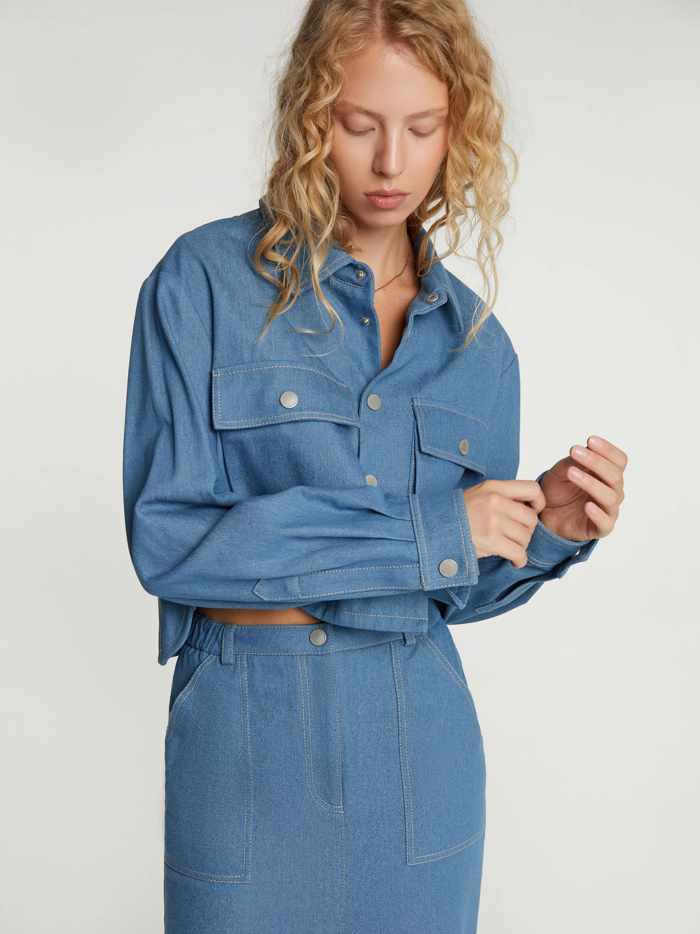 The blue two-piece suit is made of cotton denim. The material is practical and easy to care for, so denim garments keep their shape and maintain a flawless appearance. The oversized jacket with large chest pockets is complemented with a turn-down collar and contrasting golden seams. The midi skirt features side slit pockets and a front slit. On the model: size XS/S. Height: 173 cm.