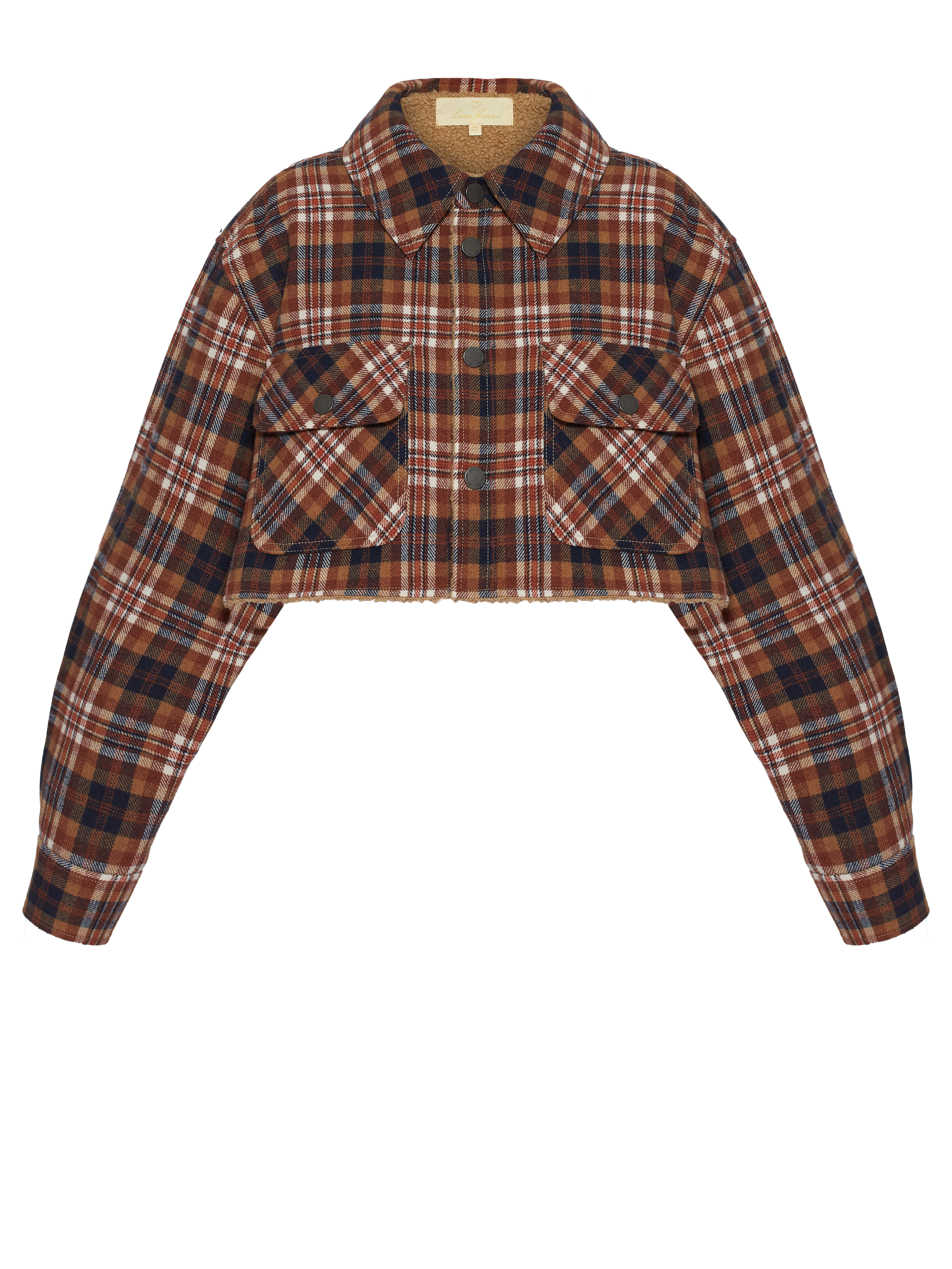 Brown cropped check shirt made of wool blend and finished with faux fur lining. The shirt fastens with snap buttons at the front and is complemented by two patch pockets.