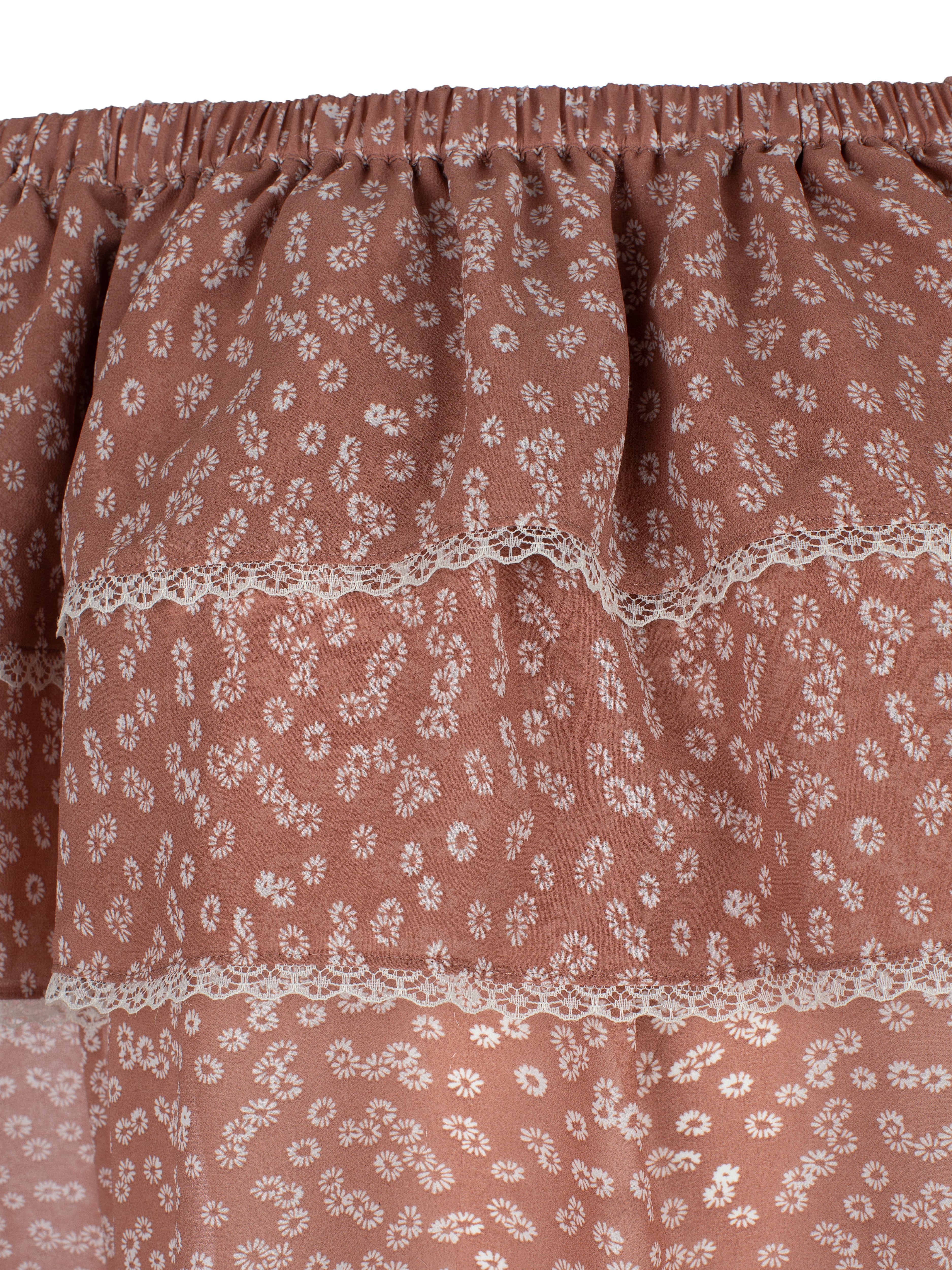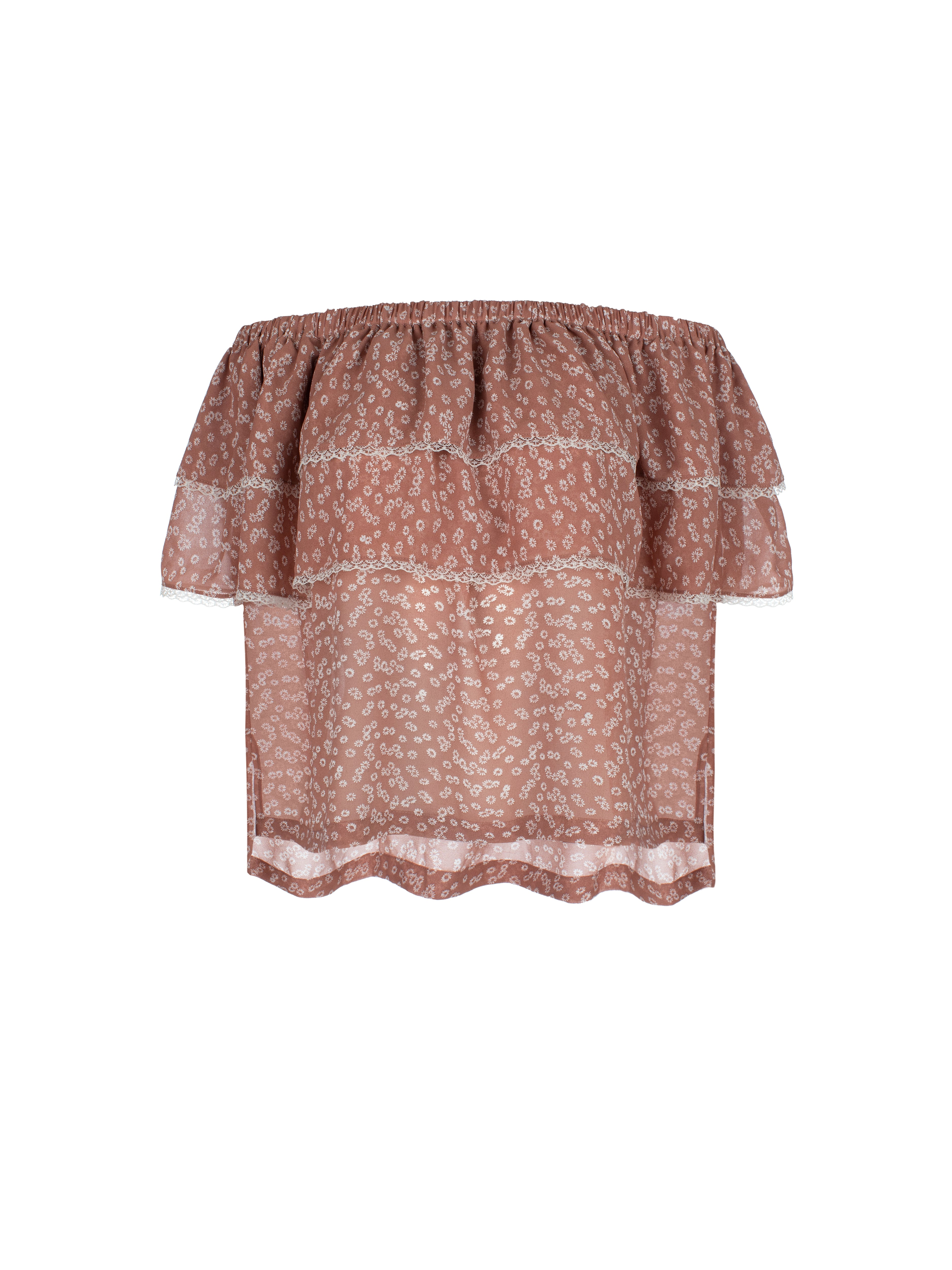 A brown off-the-shoulder top with ruffles will showcase delicate collarbones. The model is made of lightweight chiffon with a floral print.