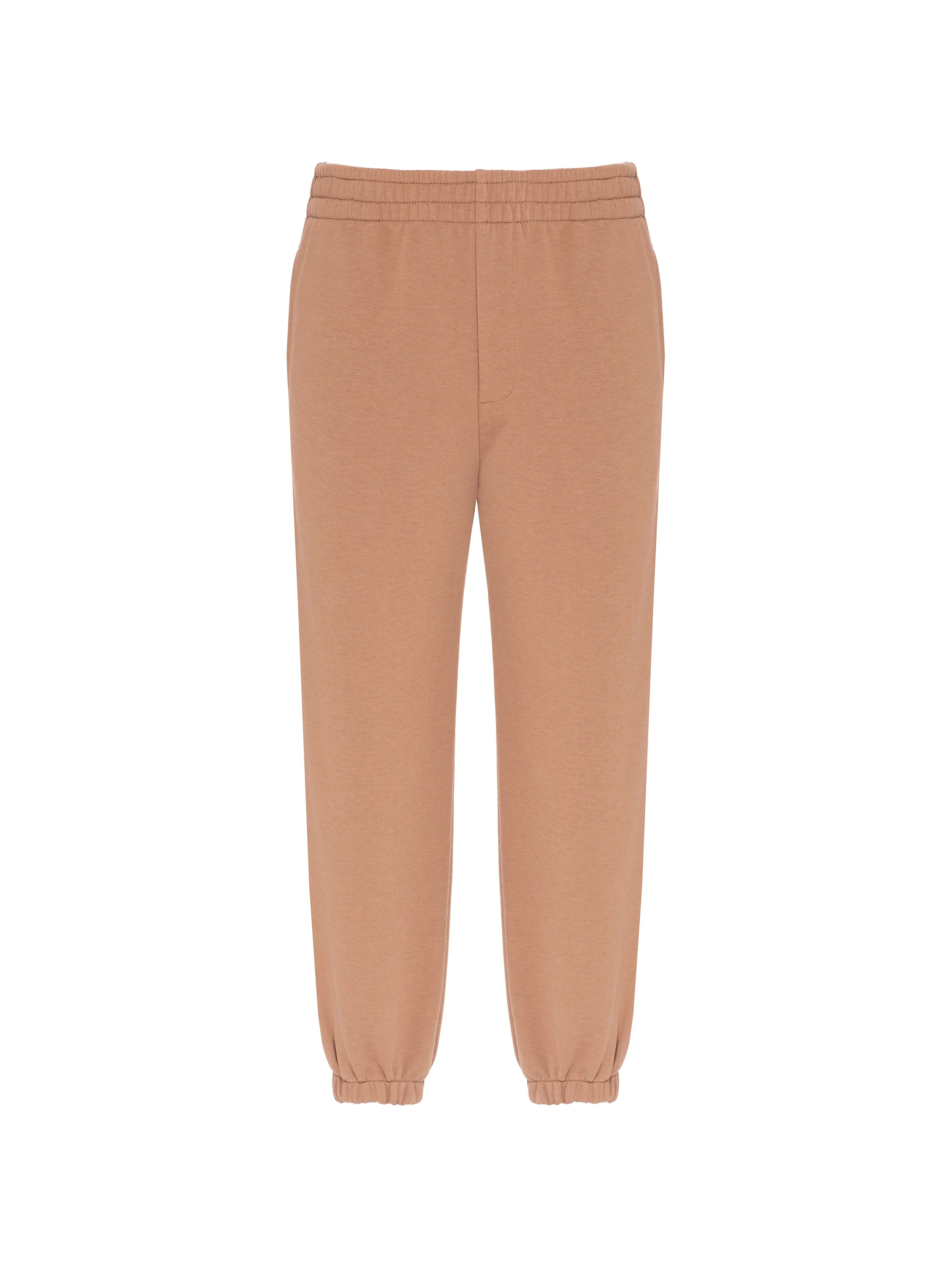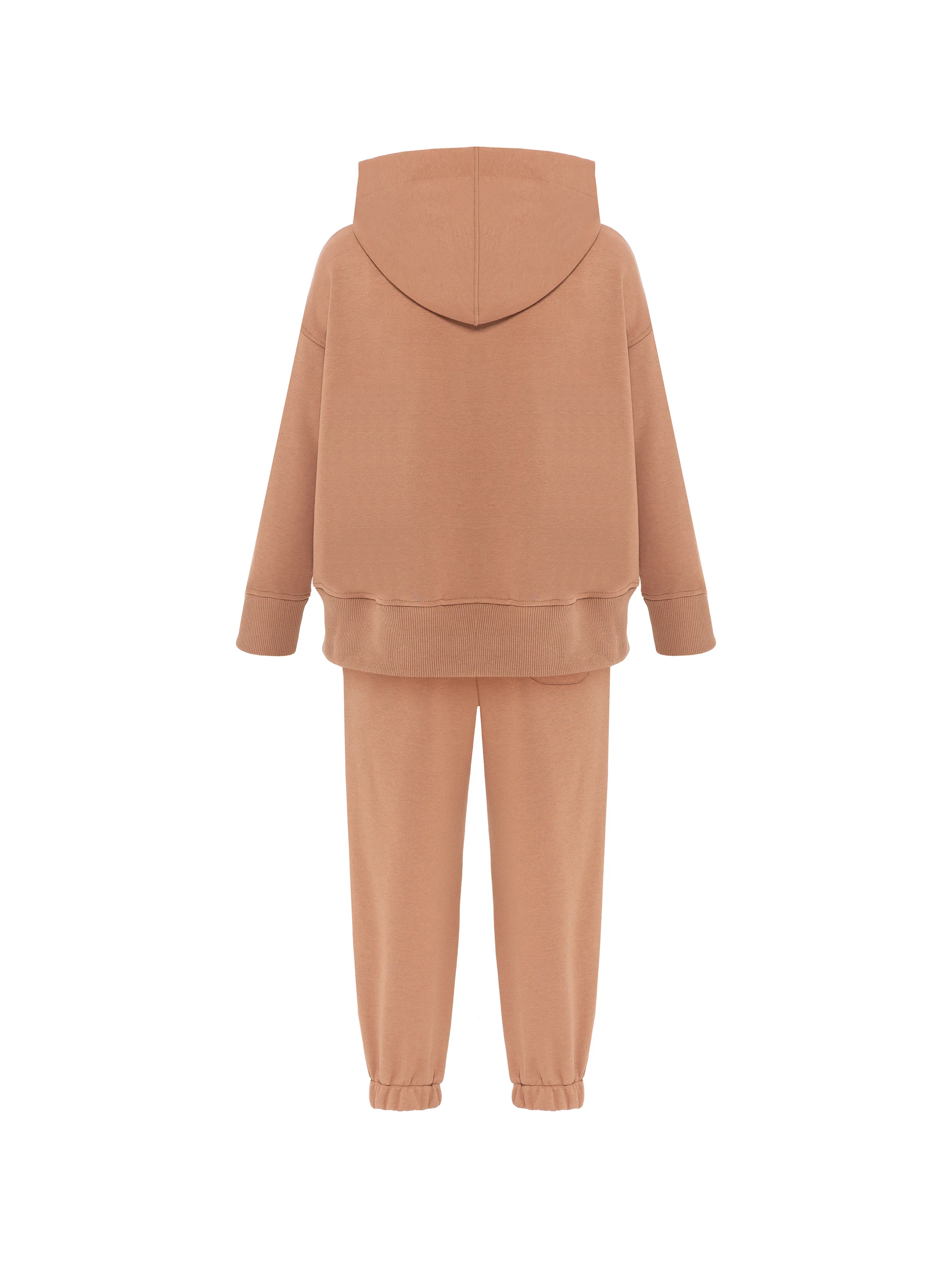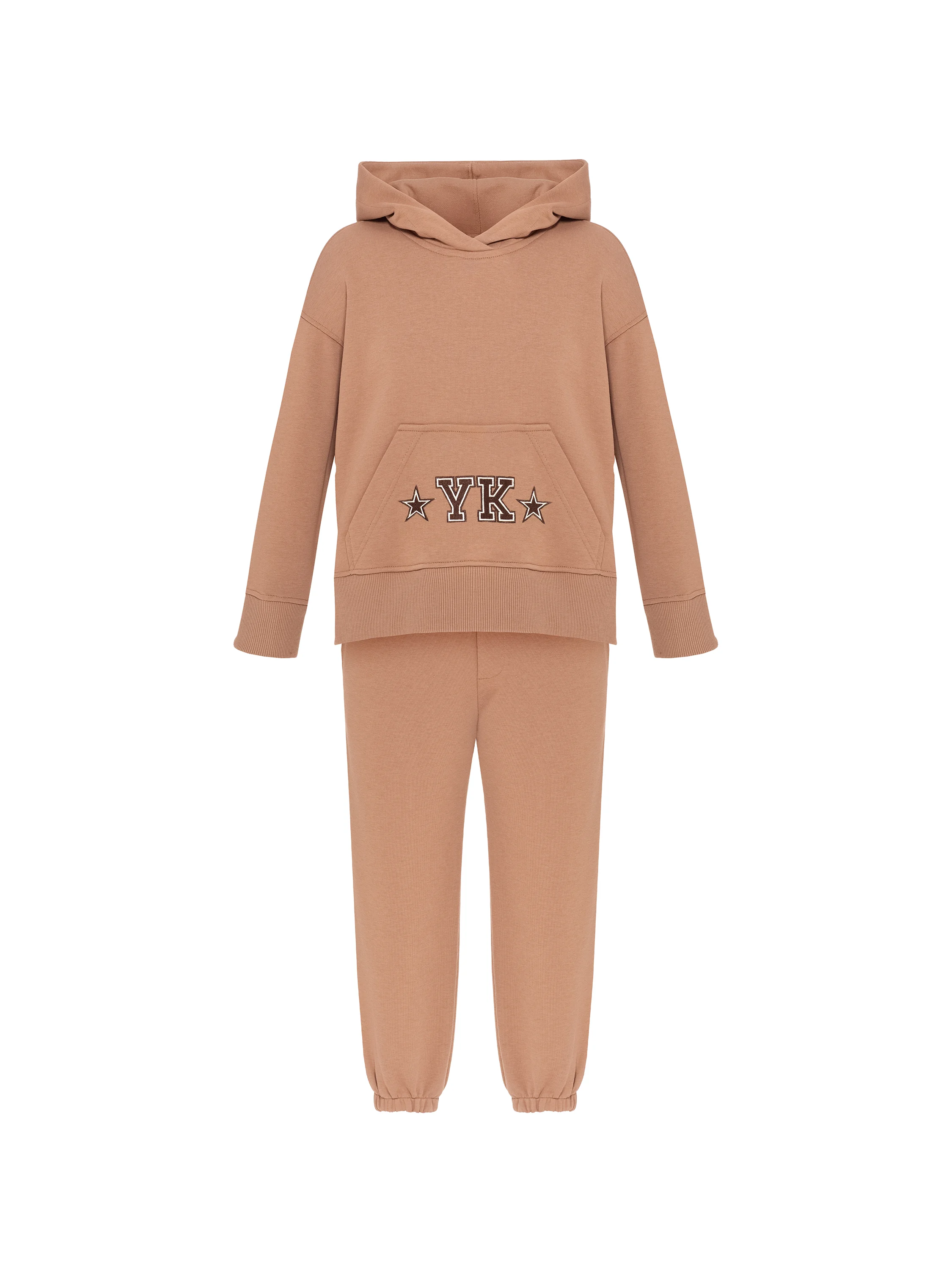 A children's knitted tracksuit made of soft brown jersey consists of a hoodie with embroidery in the shape of stars and the brand logo on a large kangaroo pocket, and sweatpants with elastic bands at the hem.