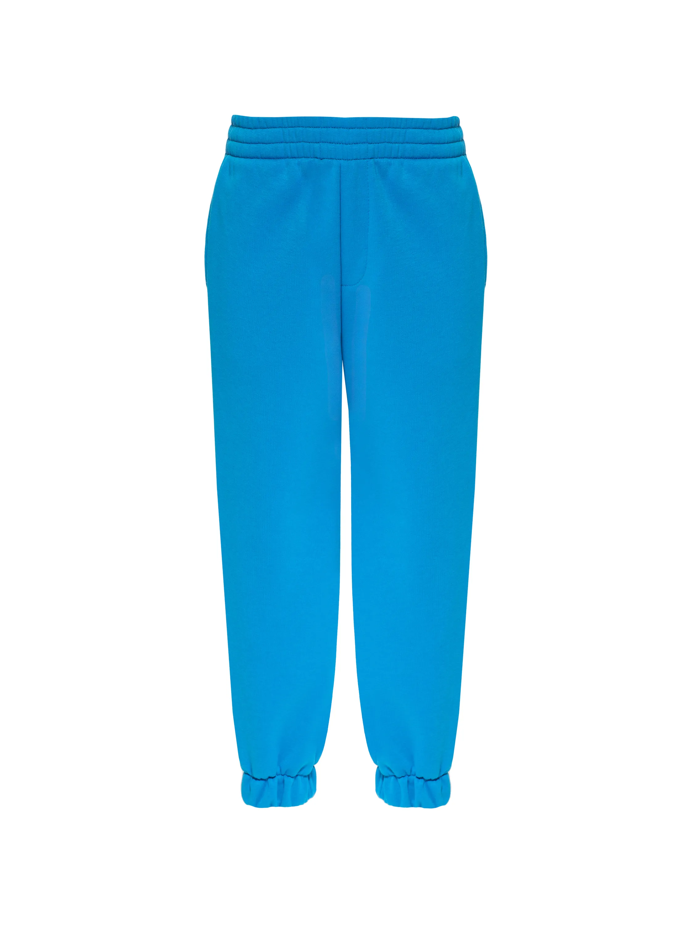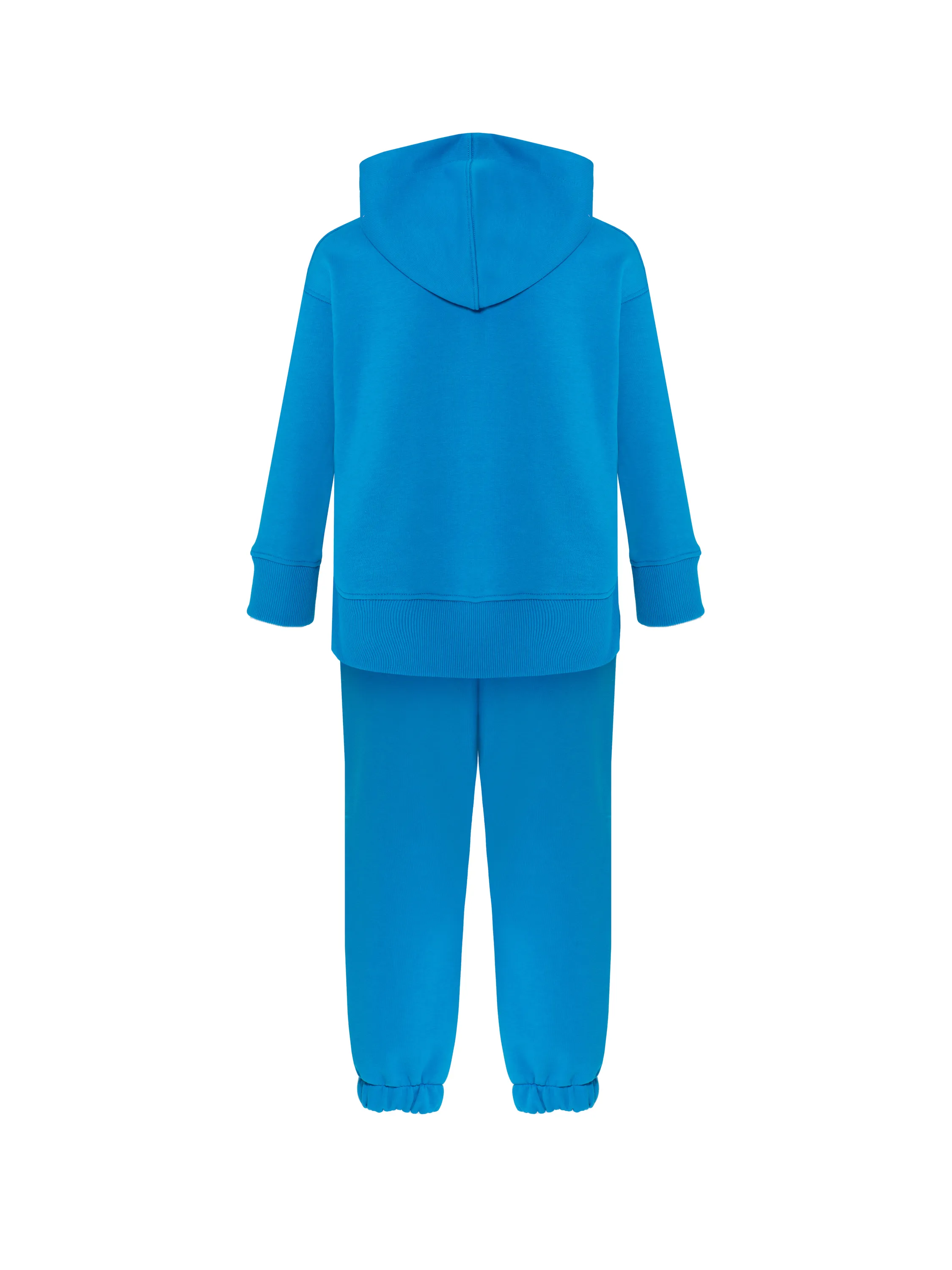 The children’s jersey set made of soft bright blue jersey consists of a hoodie with star embroidery and the brand’s logo on the large kangaroo pocket and sweatpants with elastic cuffs at the bottom.