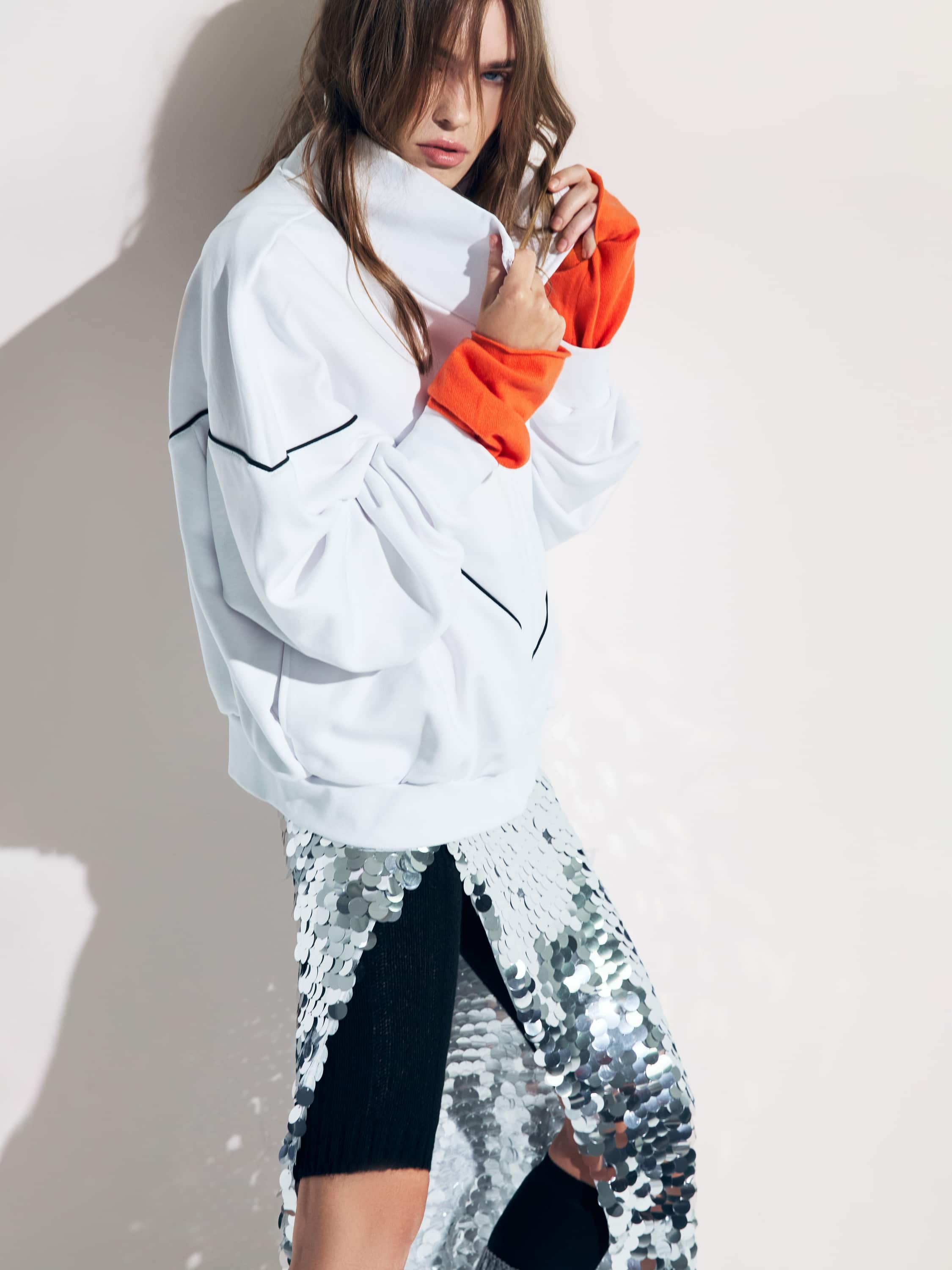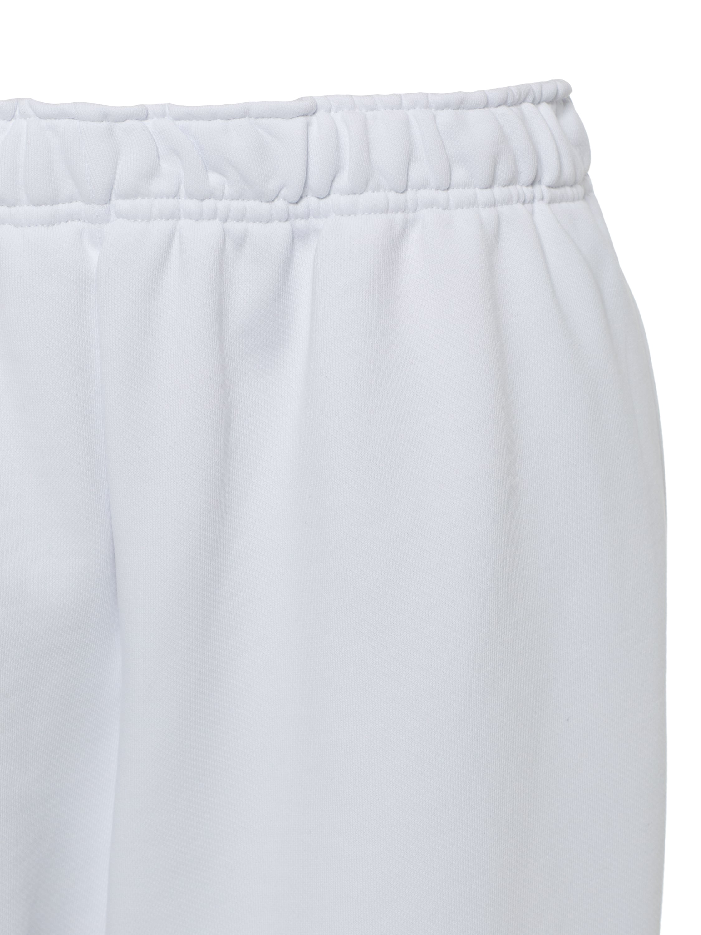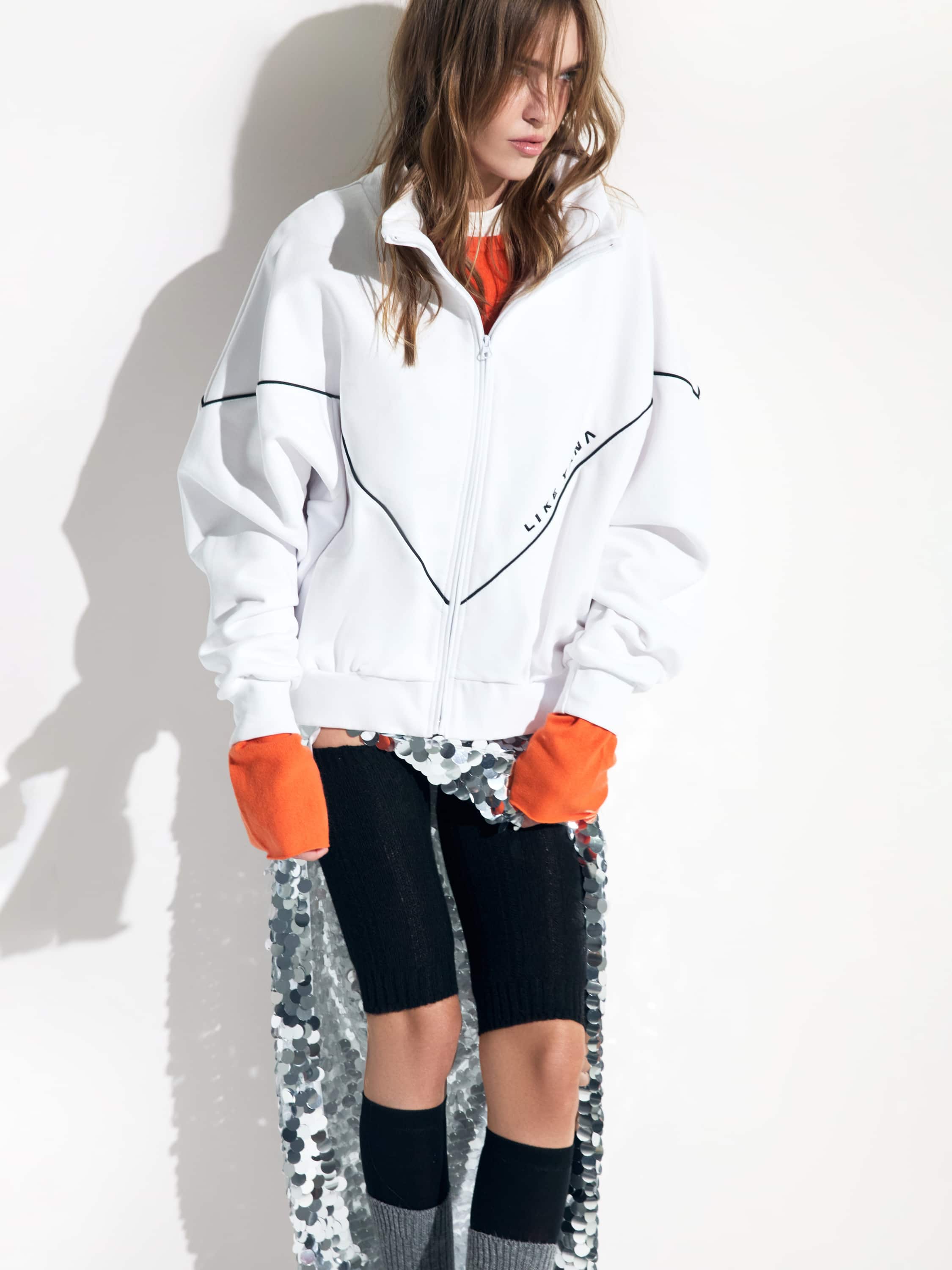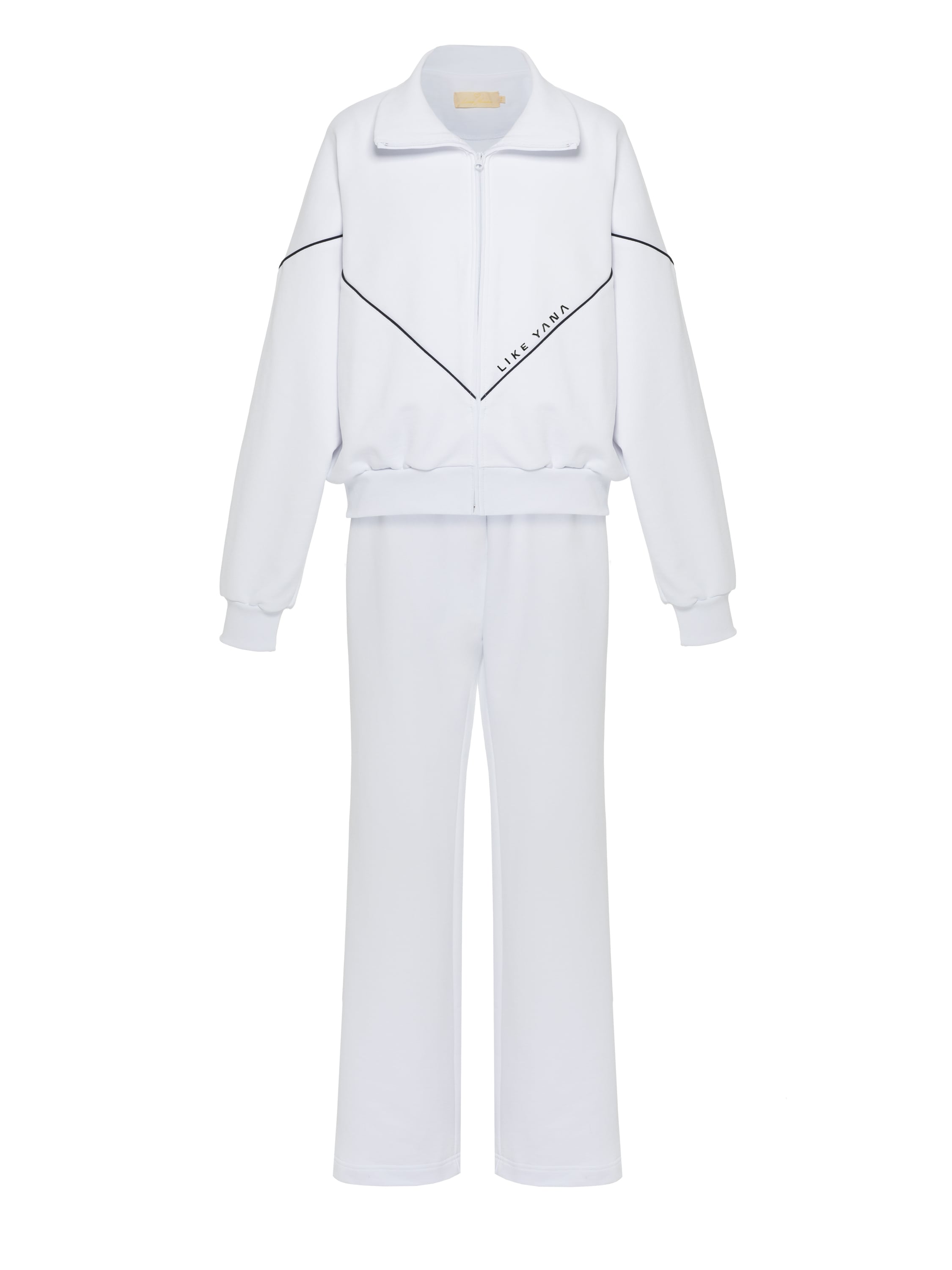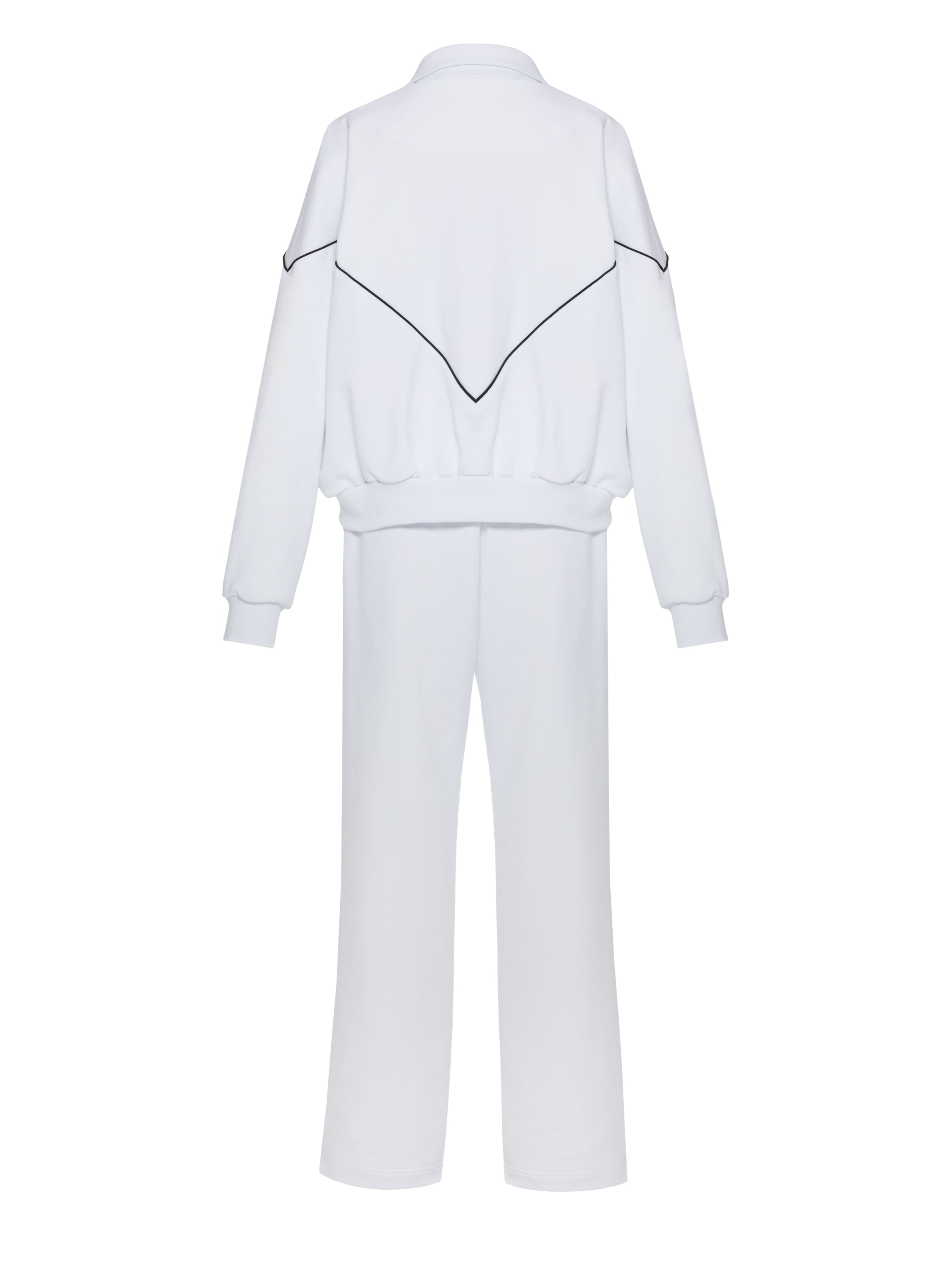 The white tracksuit consists of a zip-up hoodie with black piping and straight-leg trousers with an elastic waistband. The set is made of soft cotton fleece that breathes well and keeps its shape even after frequent washing.