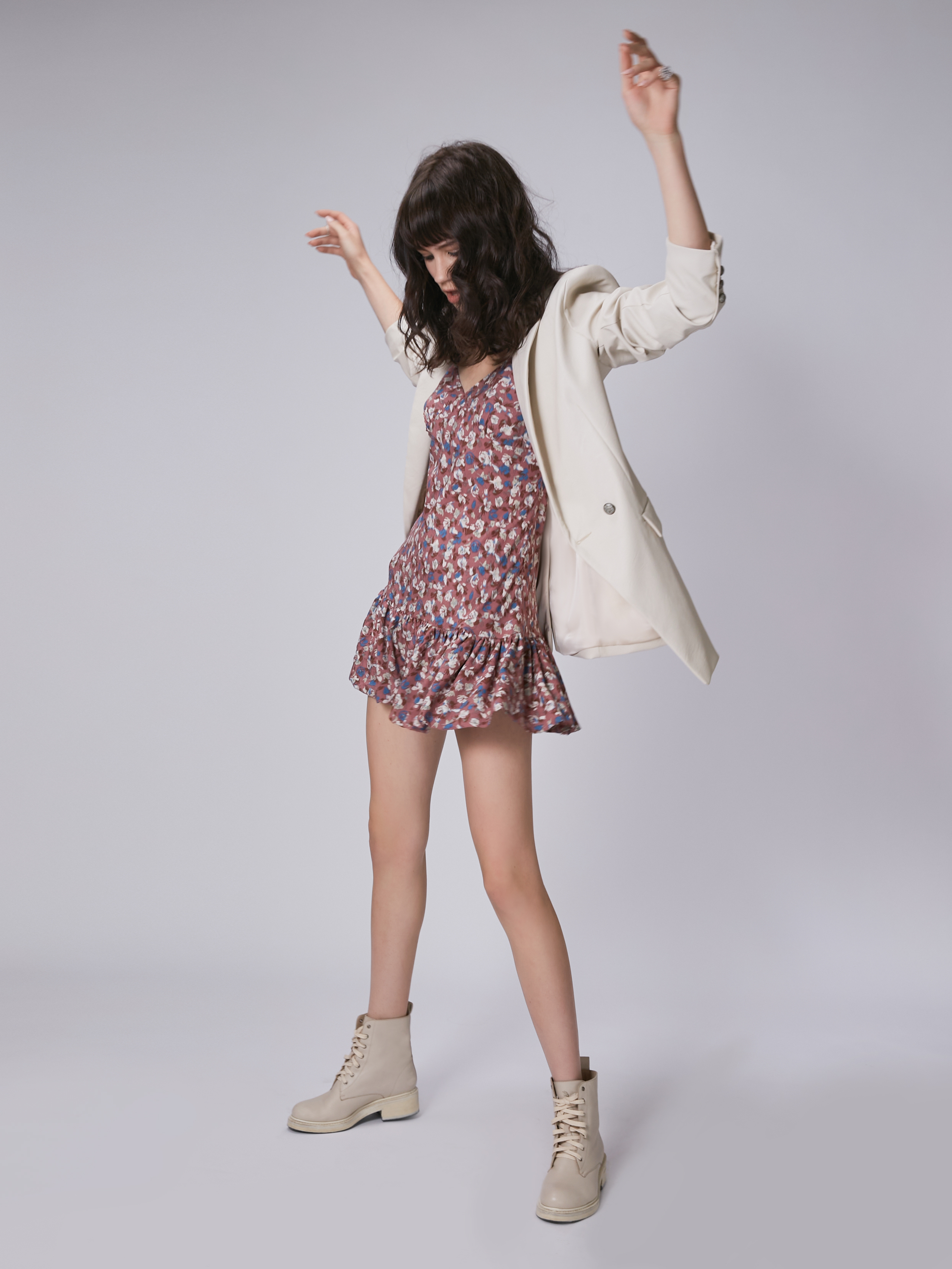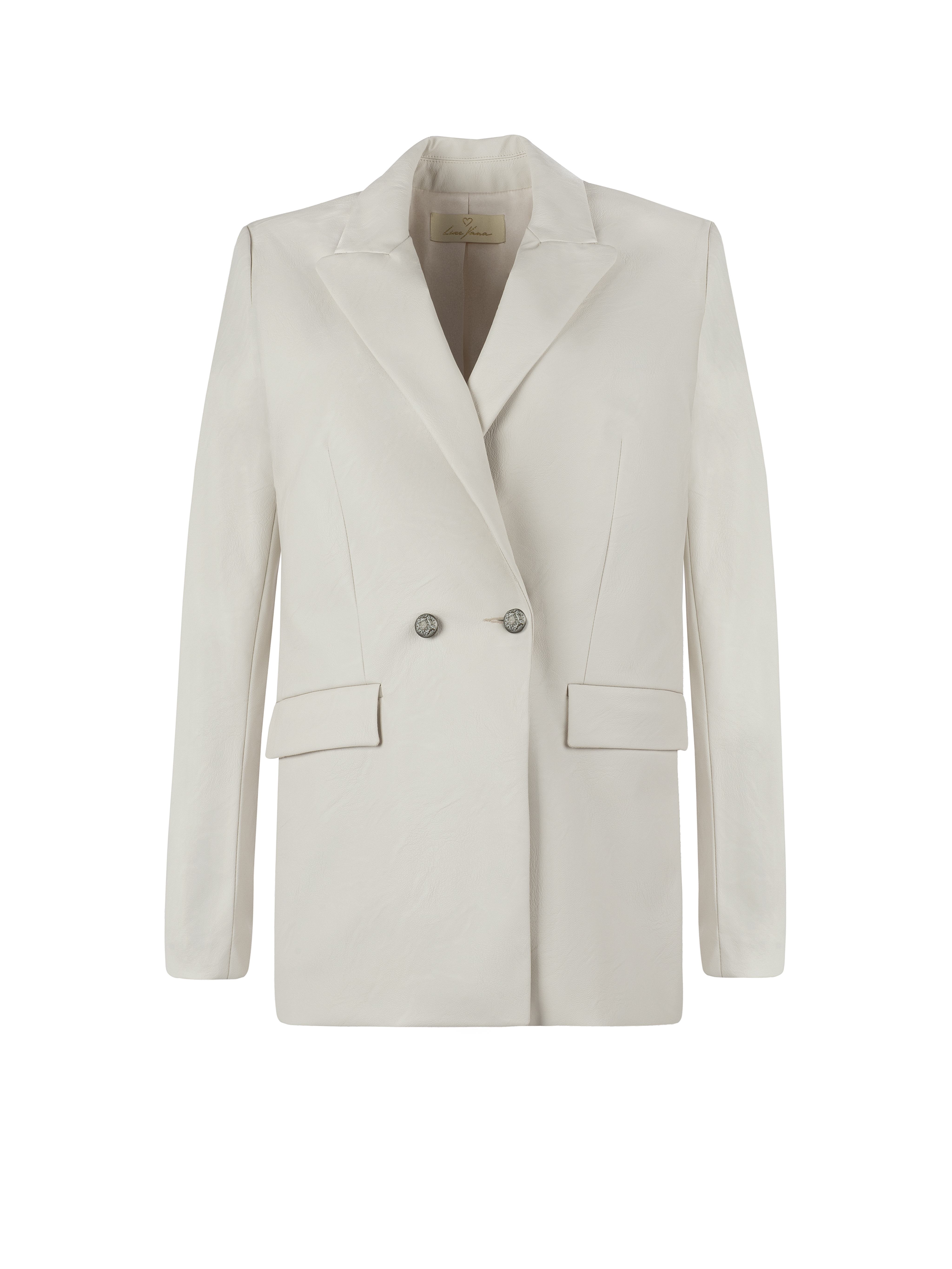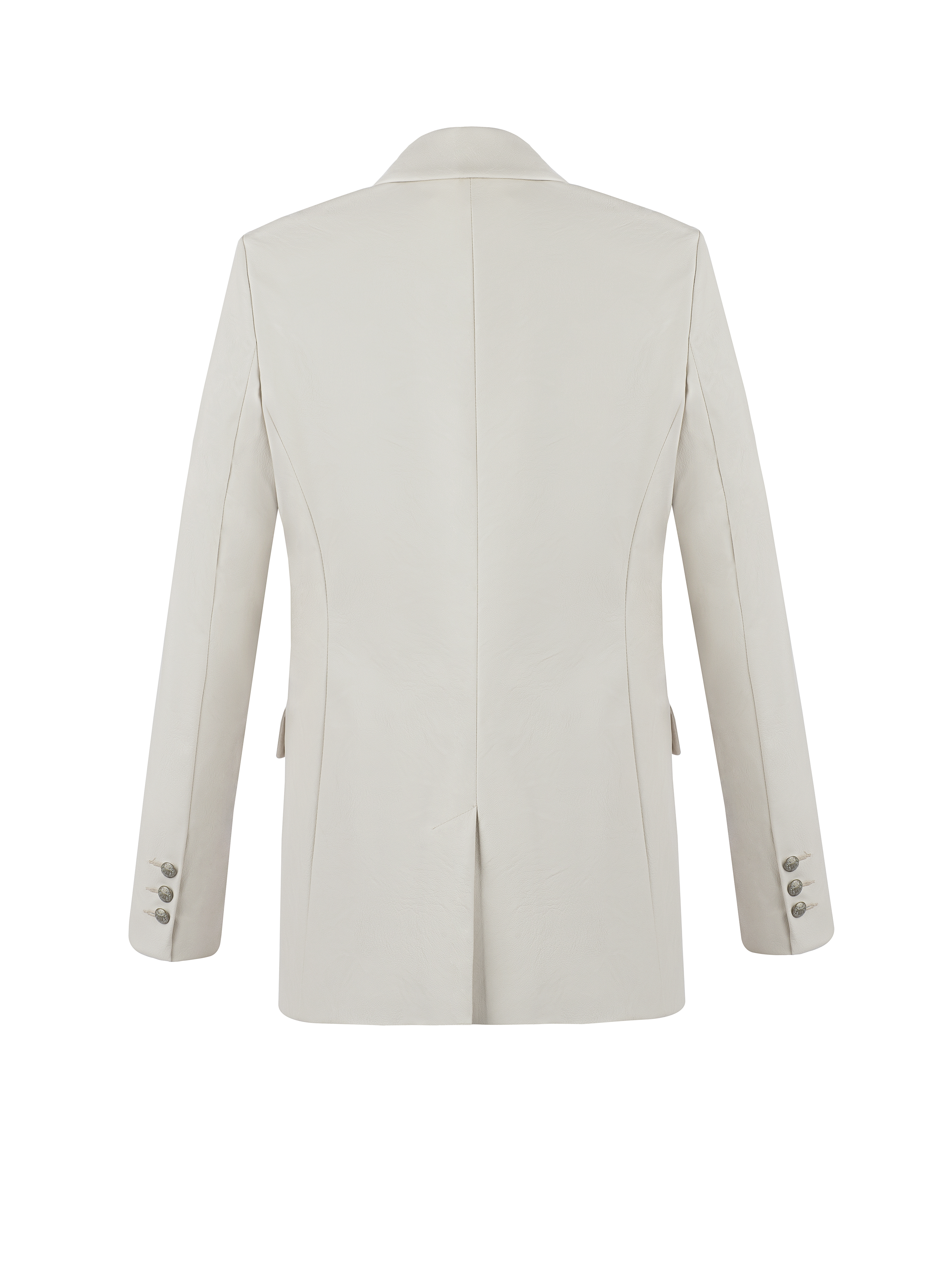A milky double-breasted jacket is made of eco-leather and complemented by a notch lapel collar with shaped lapels. Two welt pockets with flaps on the sides.