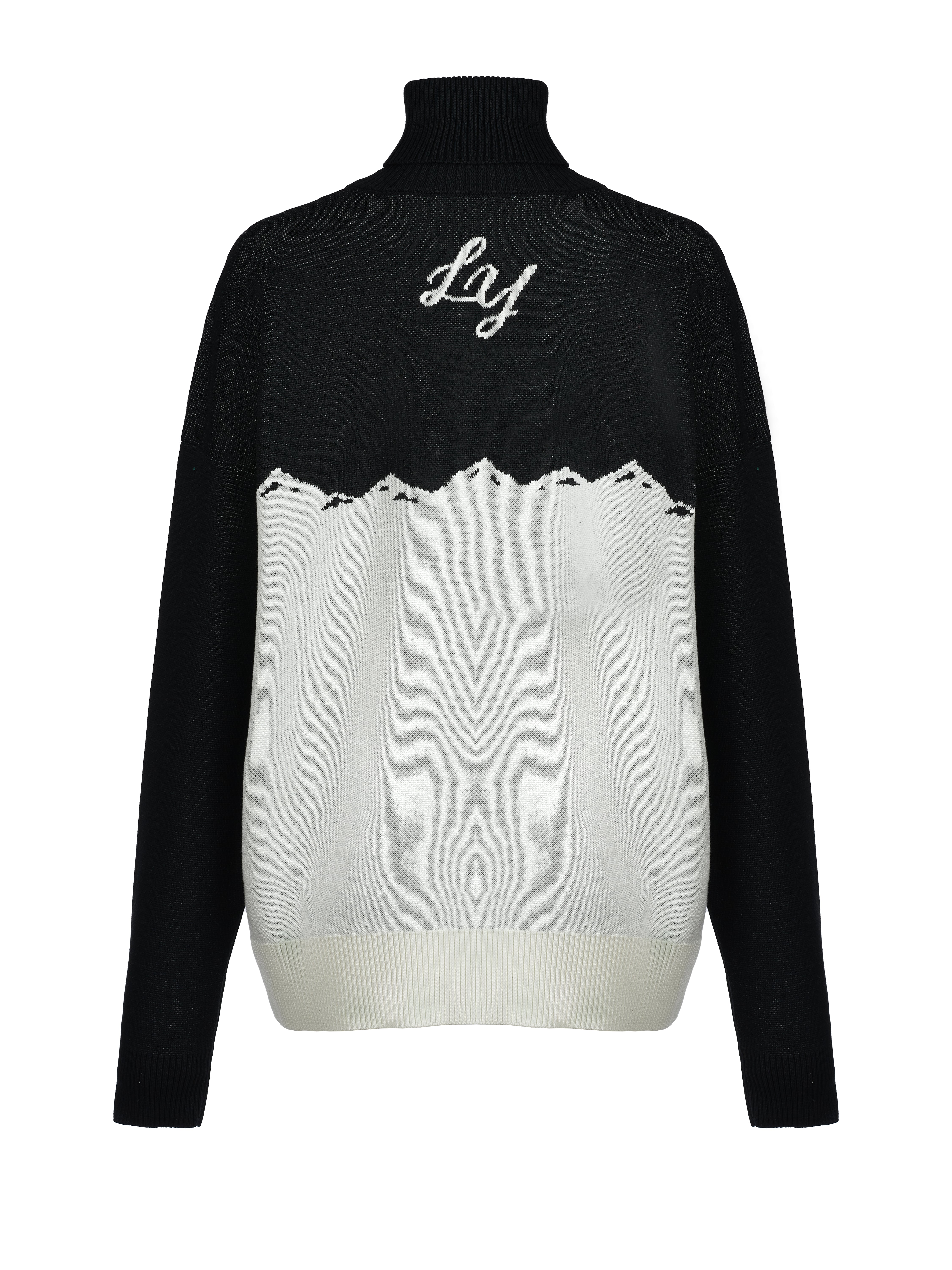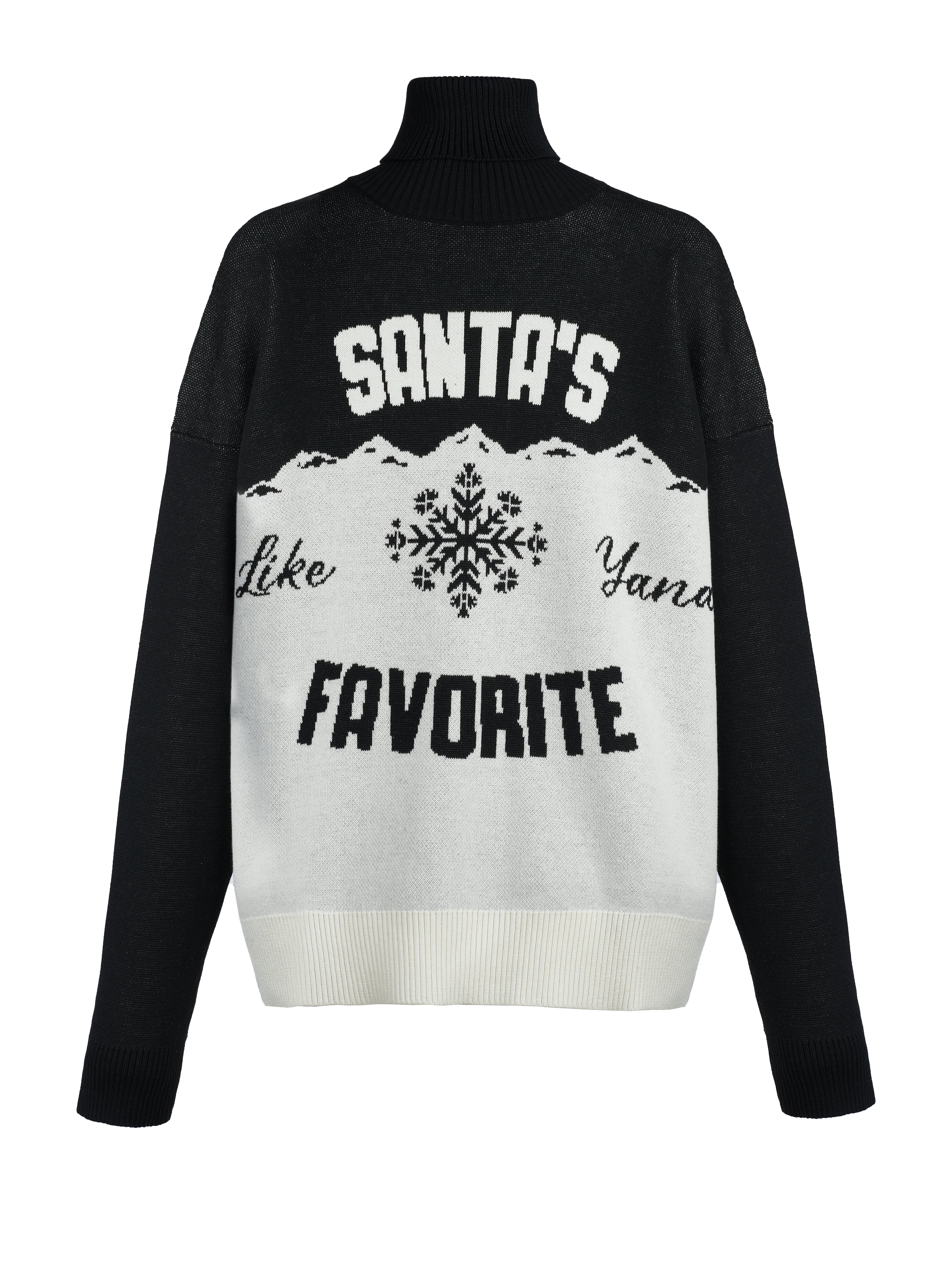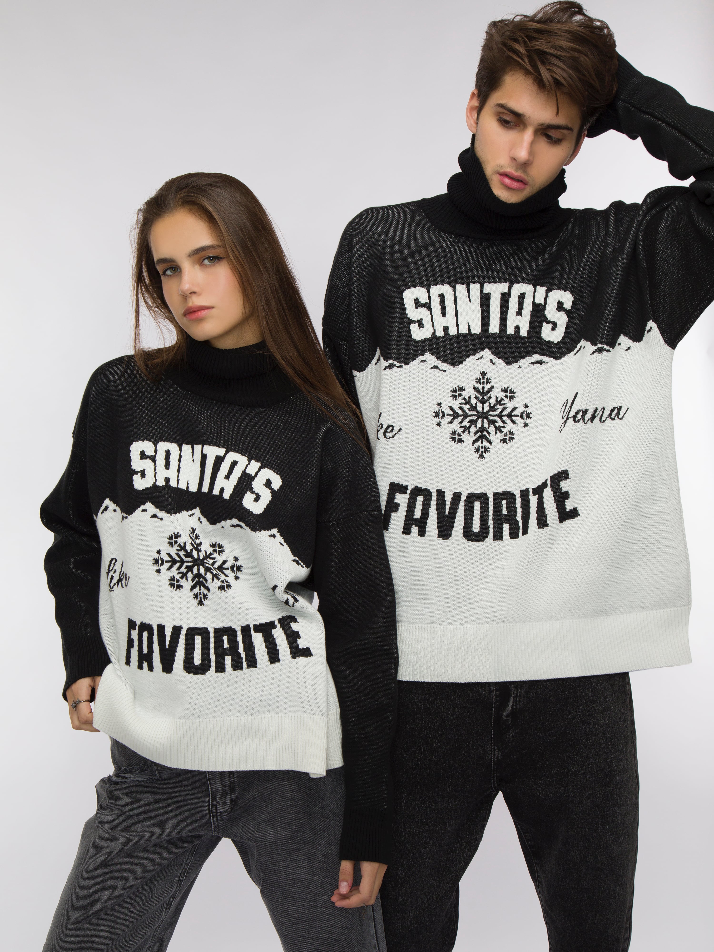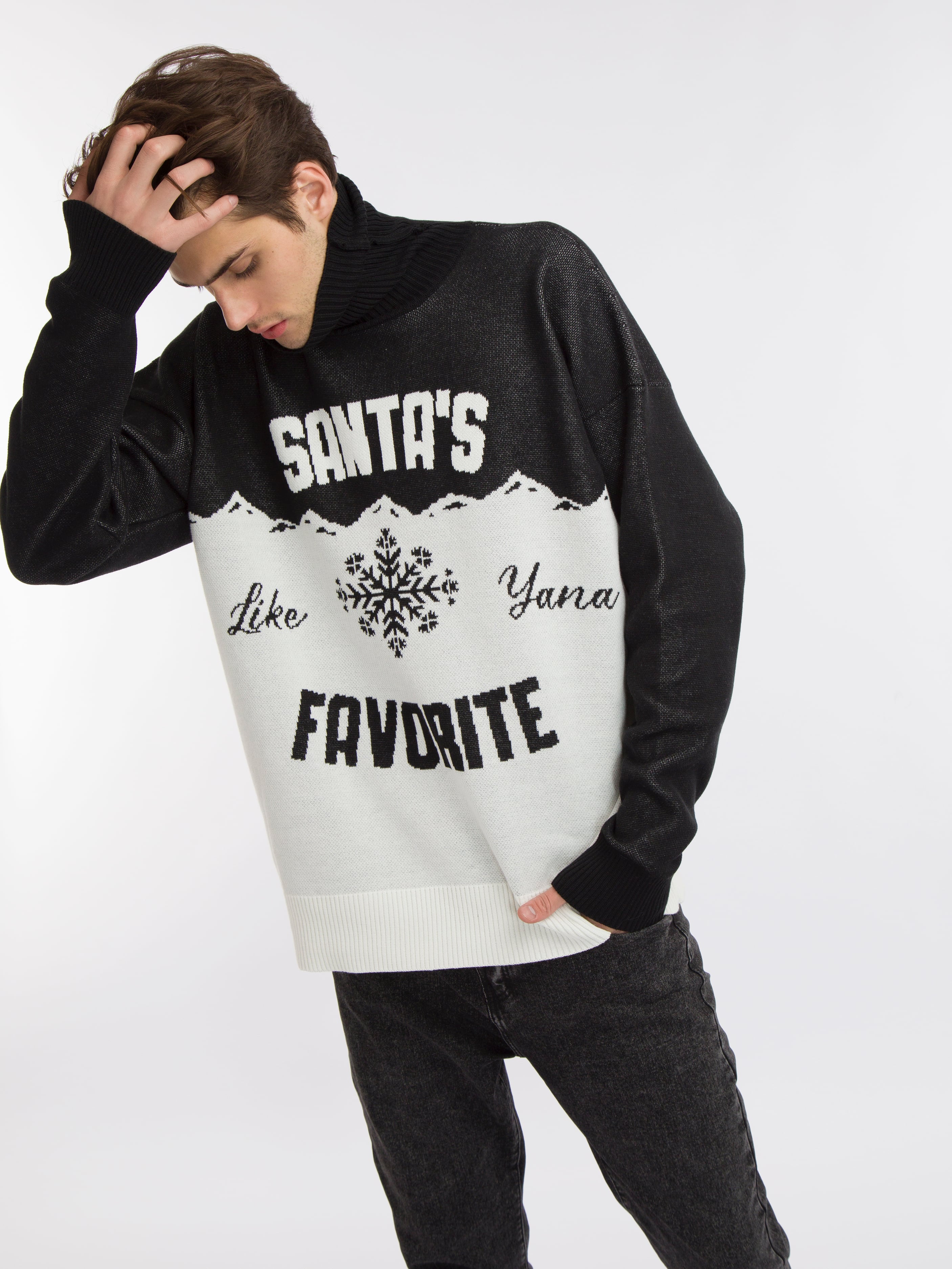 A men's black-and-white oversized sweater with a high neck will be the perfect addition for the New Year holidays. The inscription made in the intarsia technique will support the festive mood, and the material will keep you warm in winter frosts.