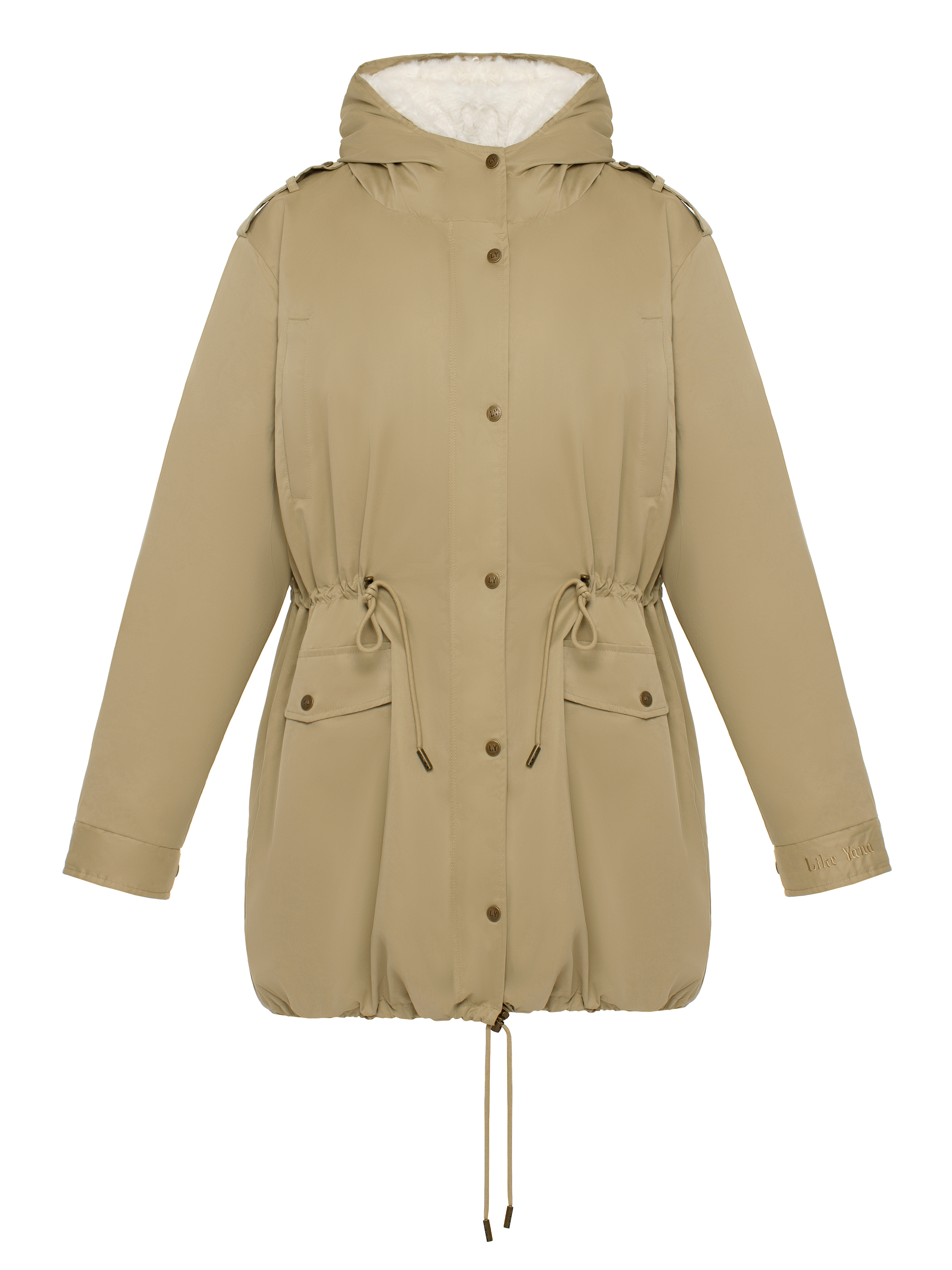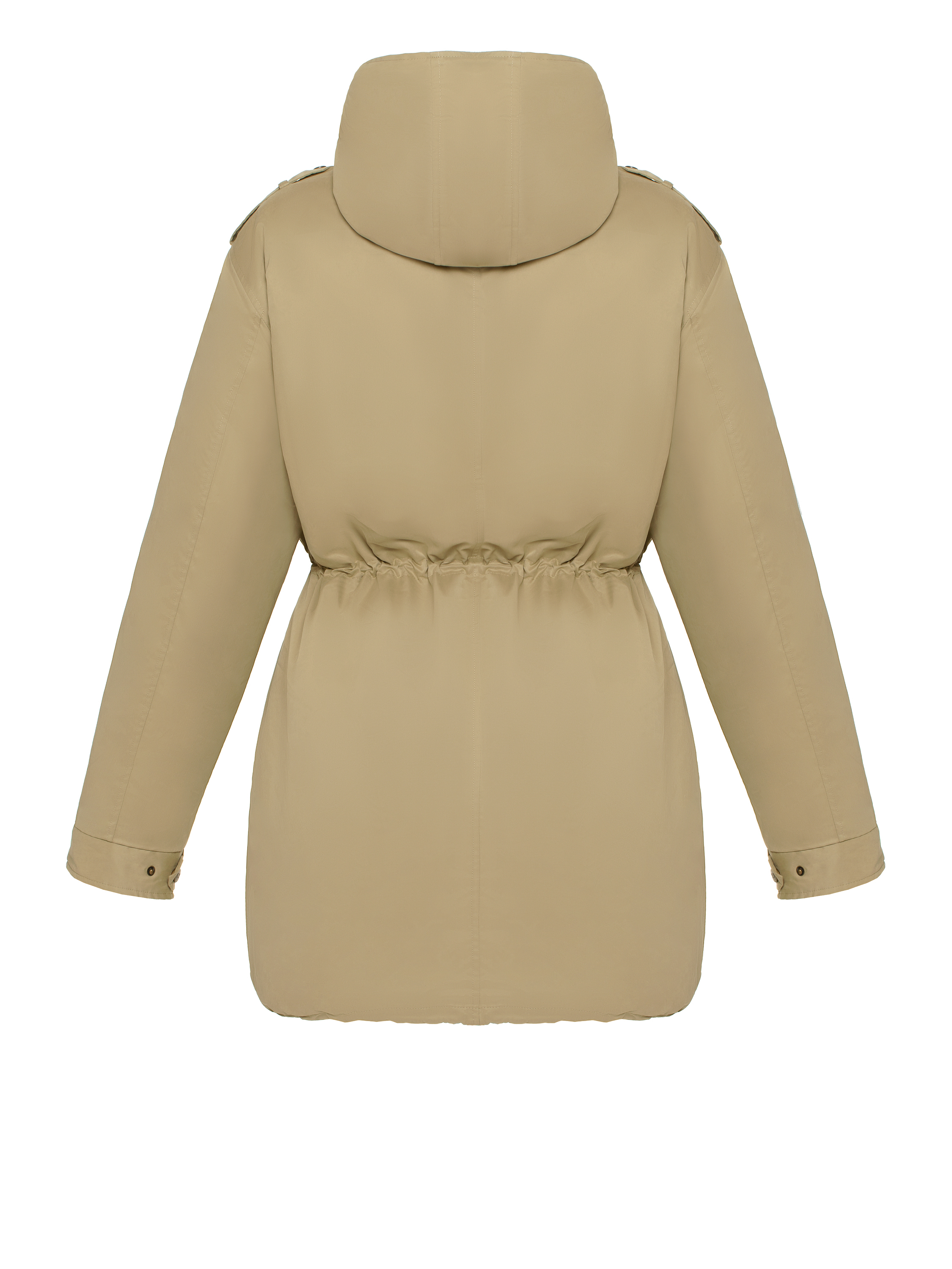 A cozy beige parka made of waterproof raincoat fabric is a comfortable and practical outerwear option for changeable mid-season weather. The faux fur lining is removable; if desired, it can be unfastened to make the jacket lighter. Drawstring at the hem and at the waistline. On the model: size XS. Height: 173 cm.