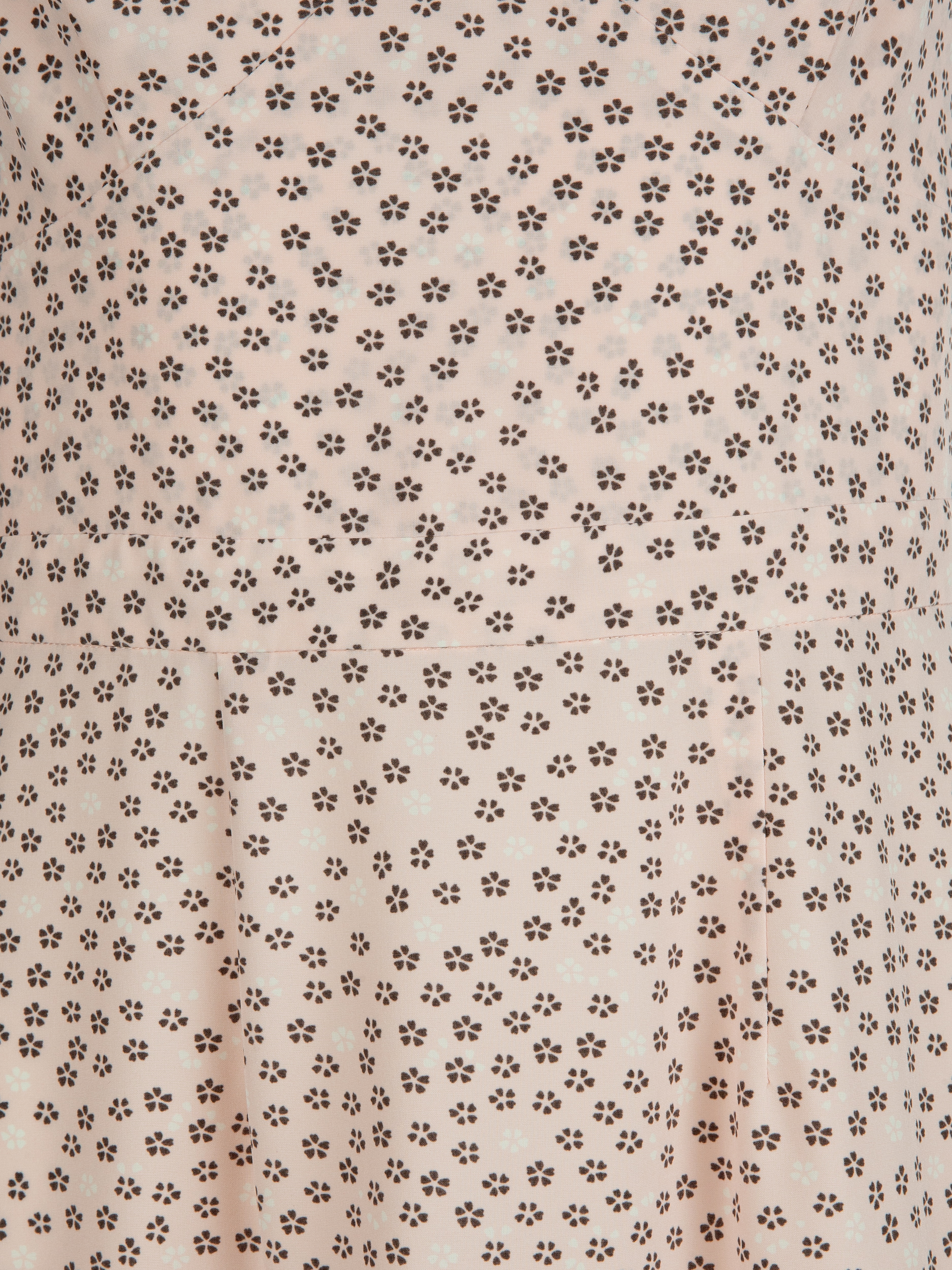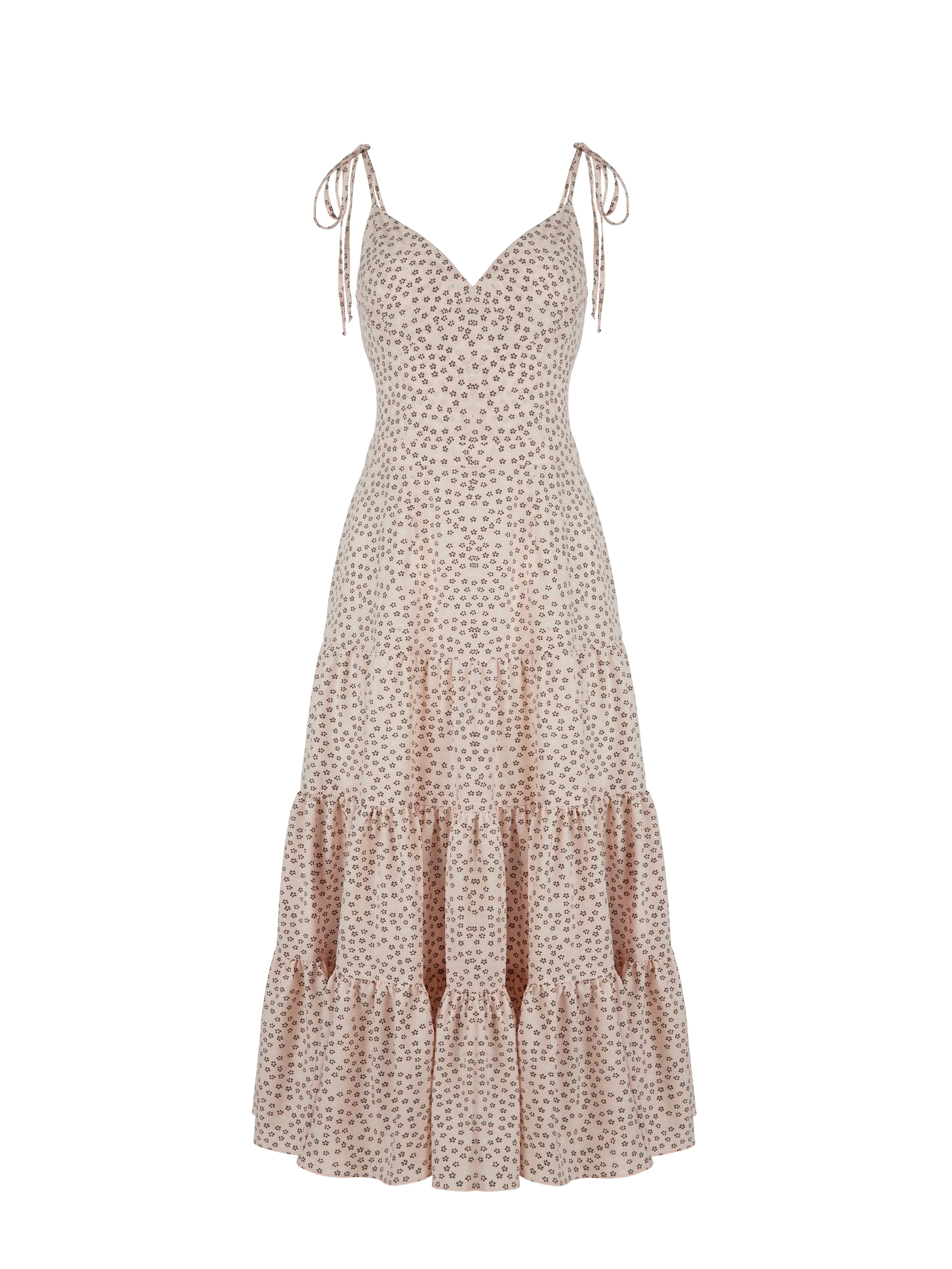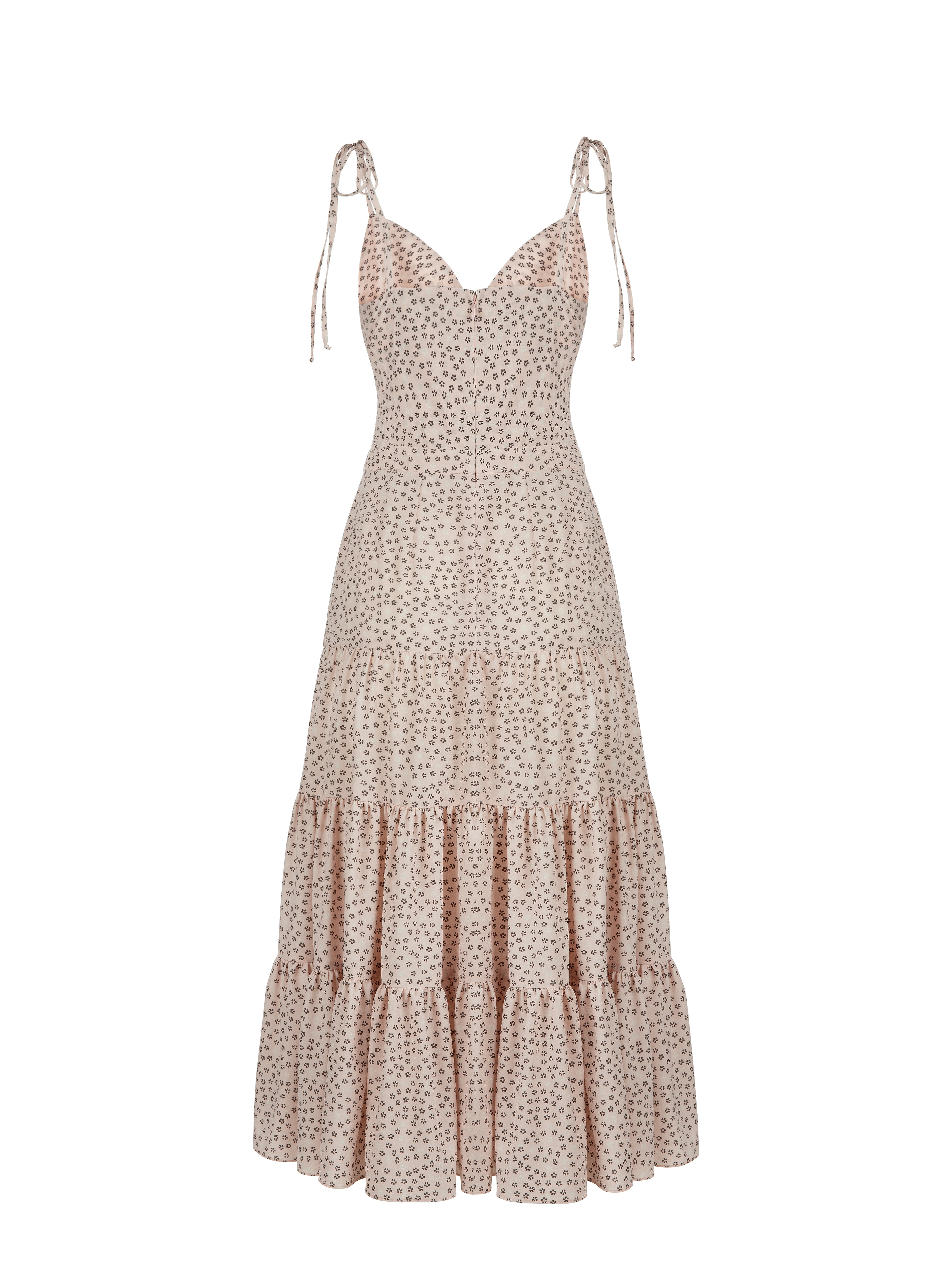 A summer strappy sundress made of lightweight peach-pink viscose with a small floral print. The perfect companion with a blazer in the city or with flip-flops on the beach.