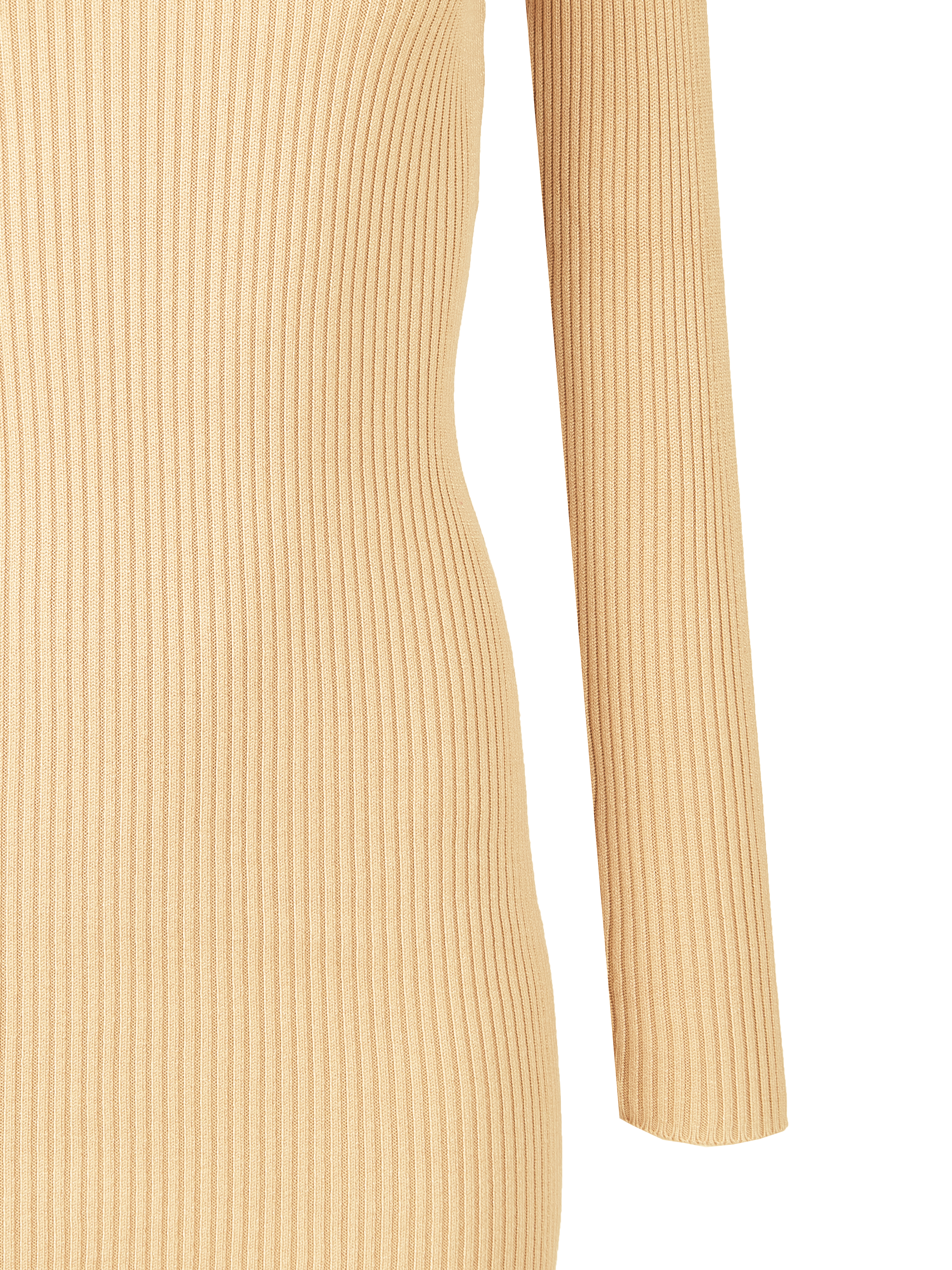 The sand-beige mini turtleneck dress is made of ribbed knit. This model will be an excellent basic option for autumn and winter, as it will look great in layered outfits – with blazers, vests, coats and jackets.