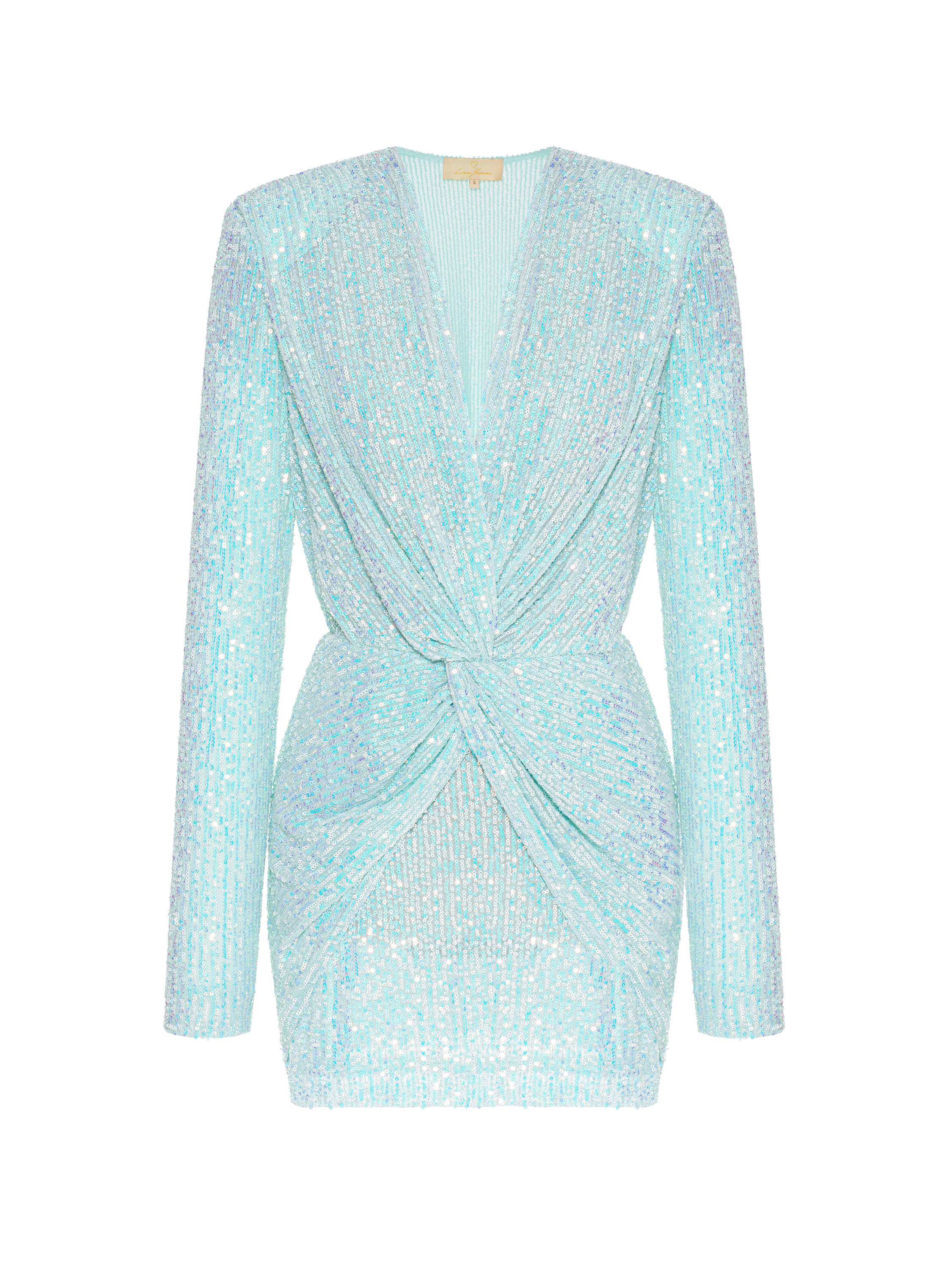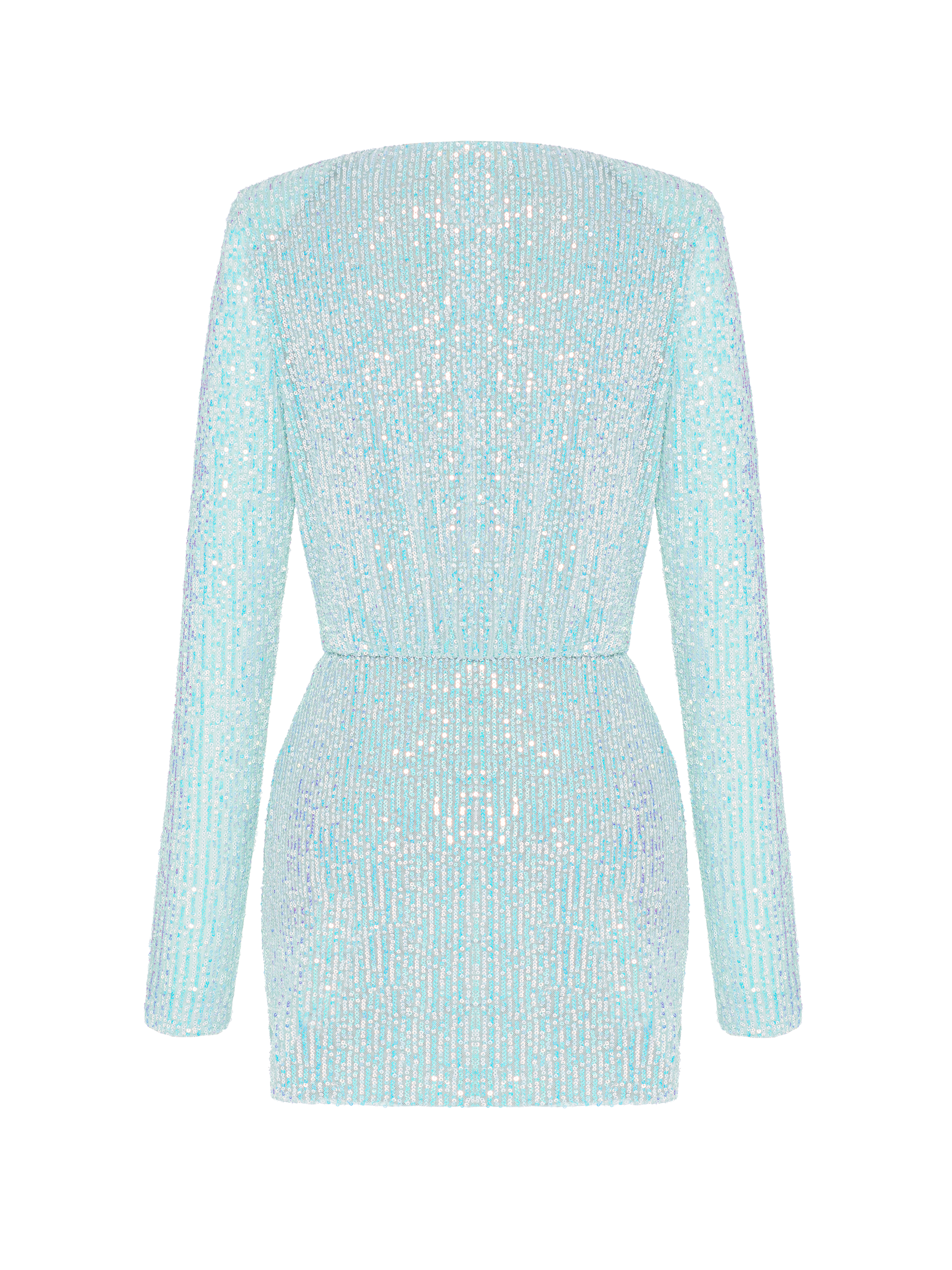 A light blue mini dress with a deep V-neckline and long sleeves is an example of a simple and elegant evening look. The fabric is fully embellished with sequins, with a relaxed drape at the waist. Complement the outfit with Silver by Yana silver tassel earrings.