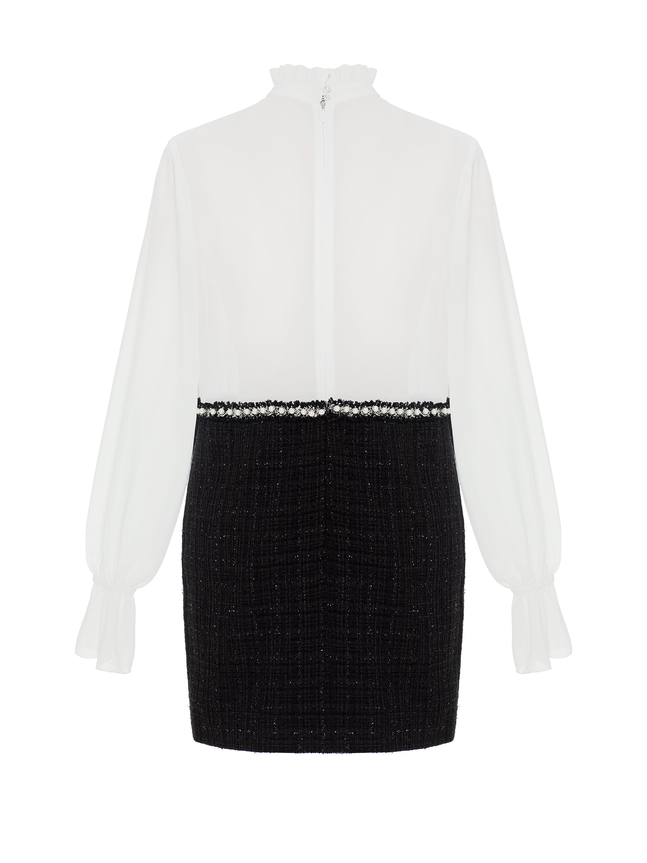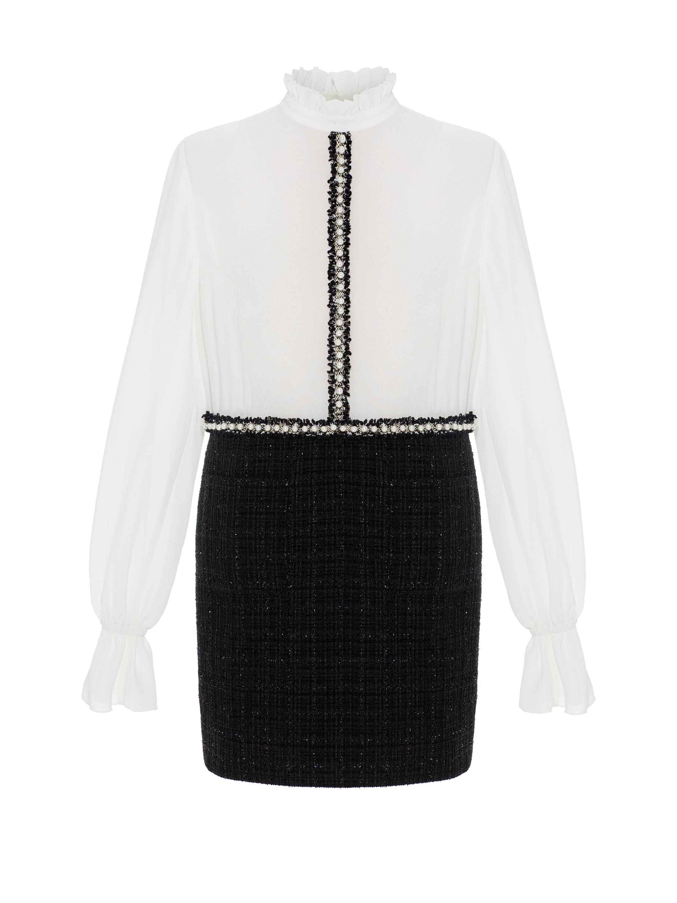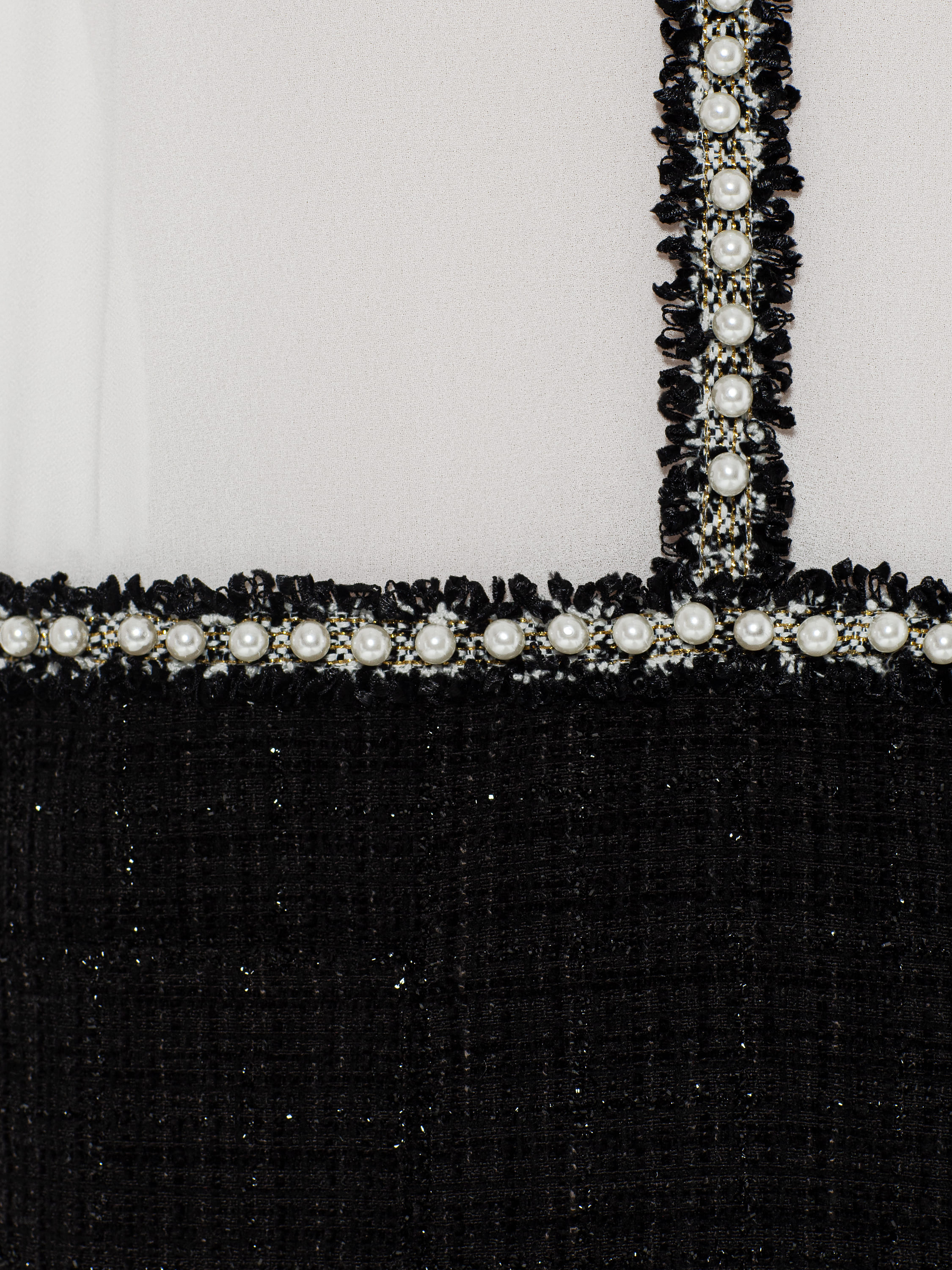An elegant mini dress made of semi-sheer white chiffon and black tweed with lurex is decorated with contrasting braid with pearl beads. The classic model will become the basis for a refined festive look.