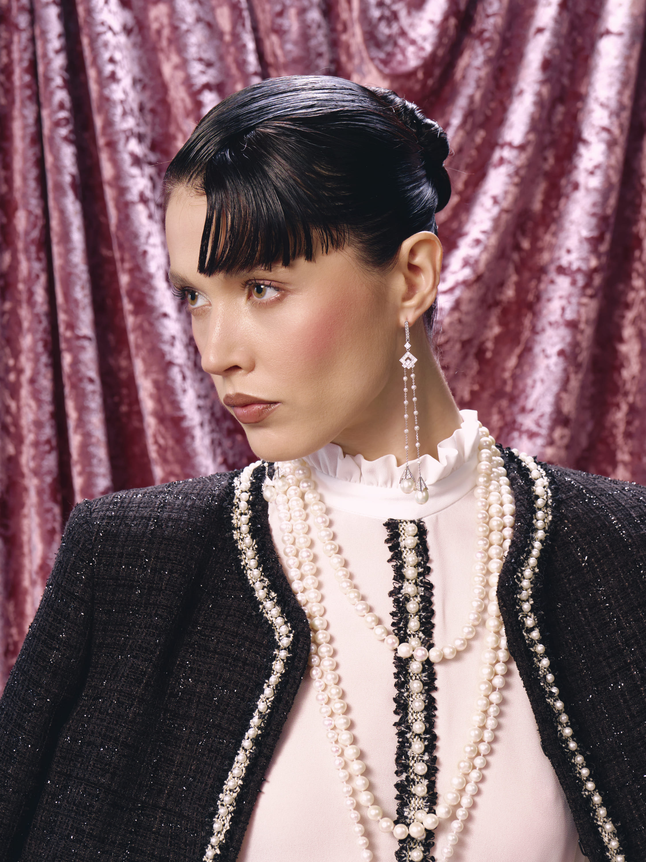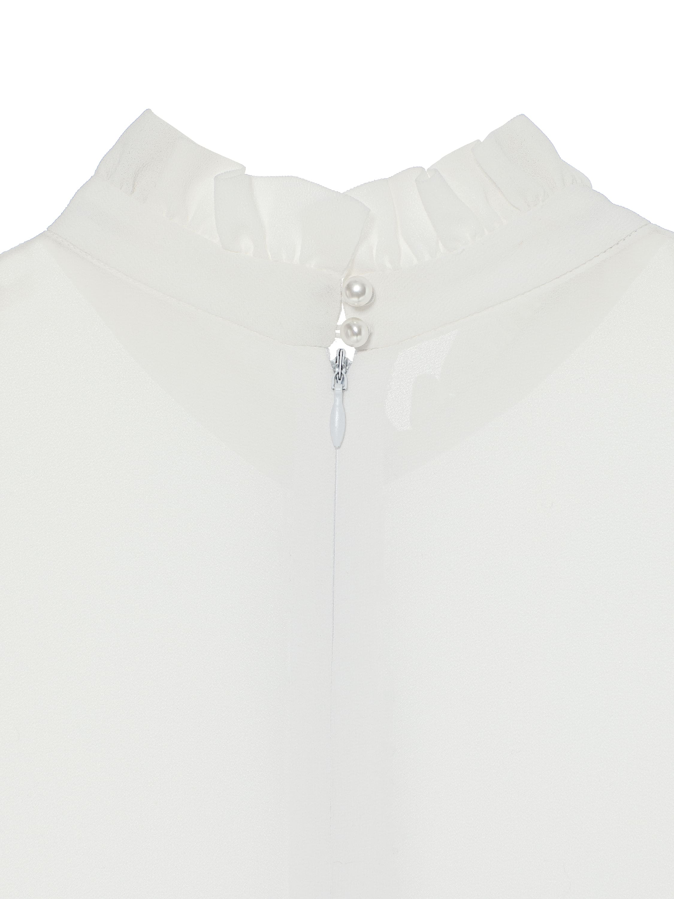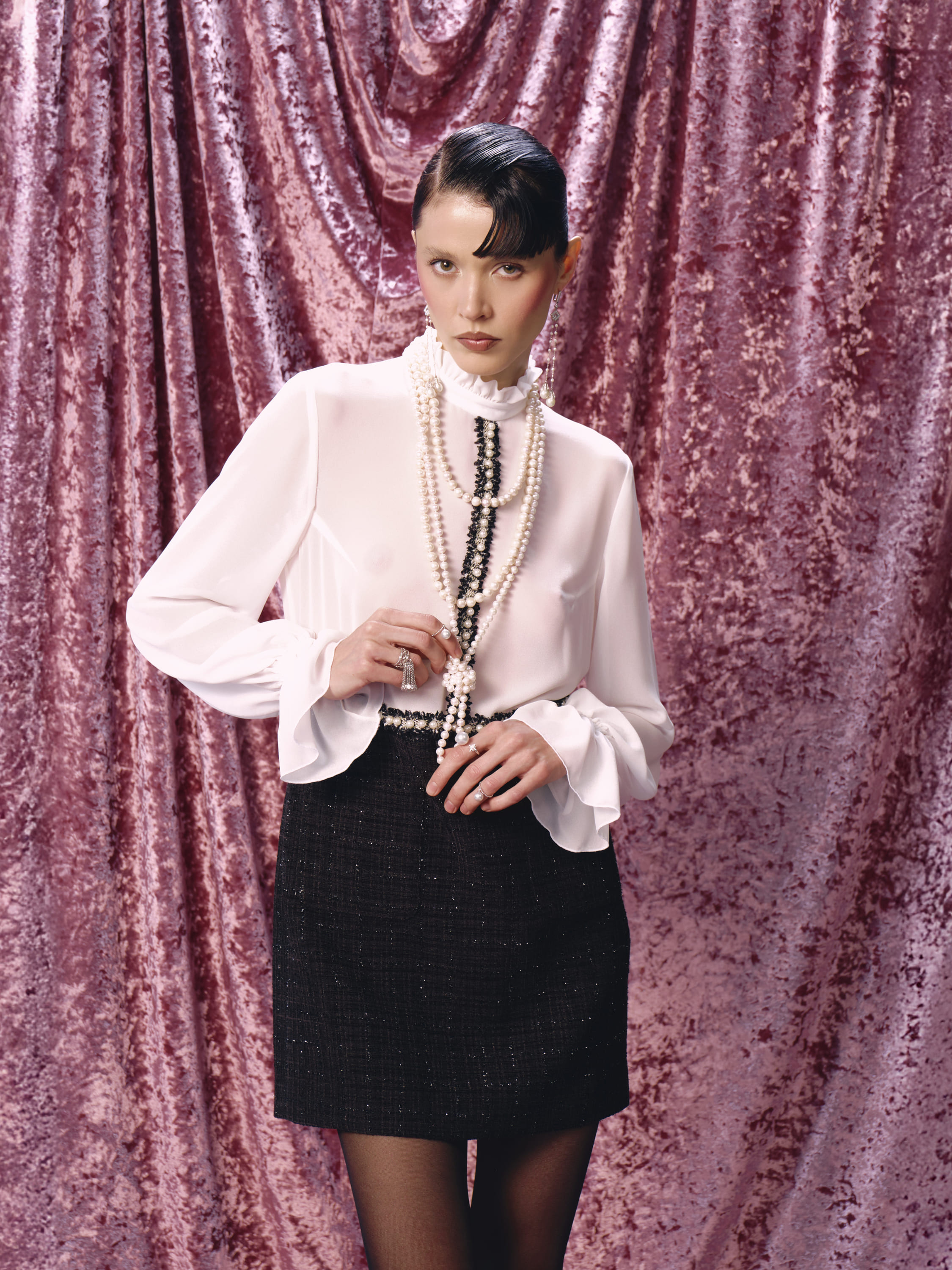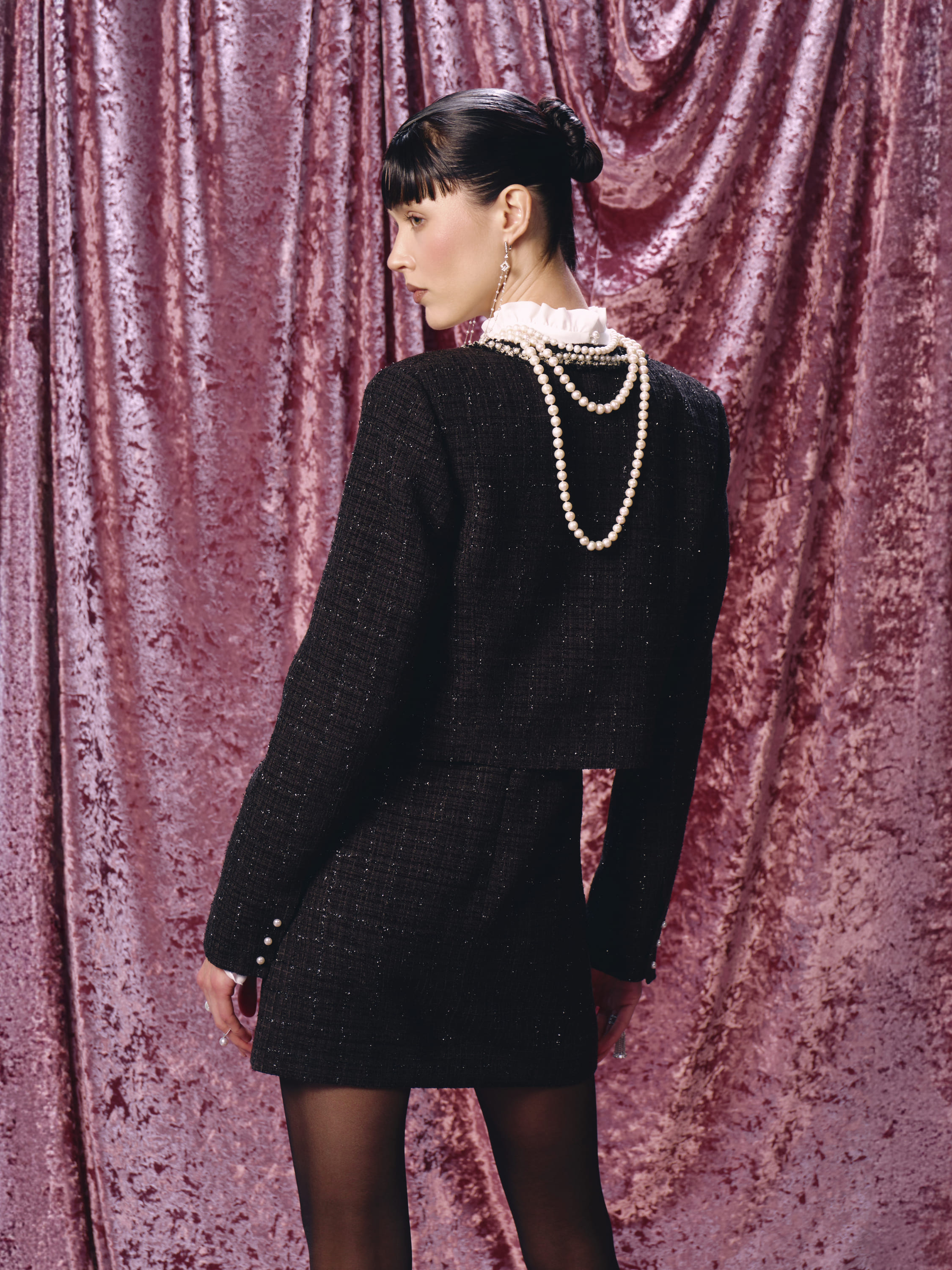 An elegant mini dress made of semi-sheer white chiffon and black tweed with lurex is decorated with contrasting braid with pearl beads. The classic model will become the basis for a refined festive look.