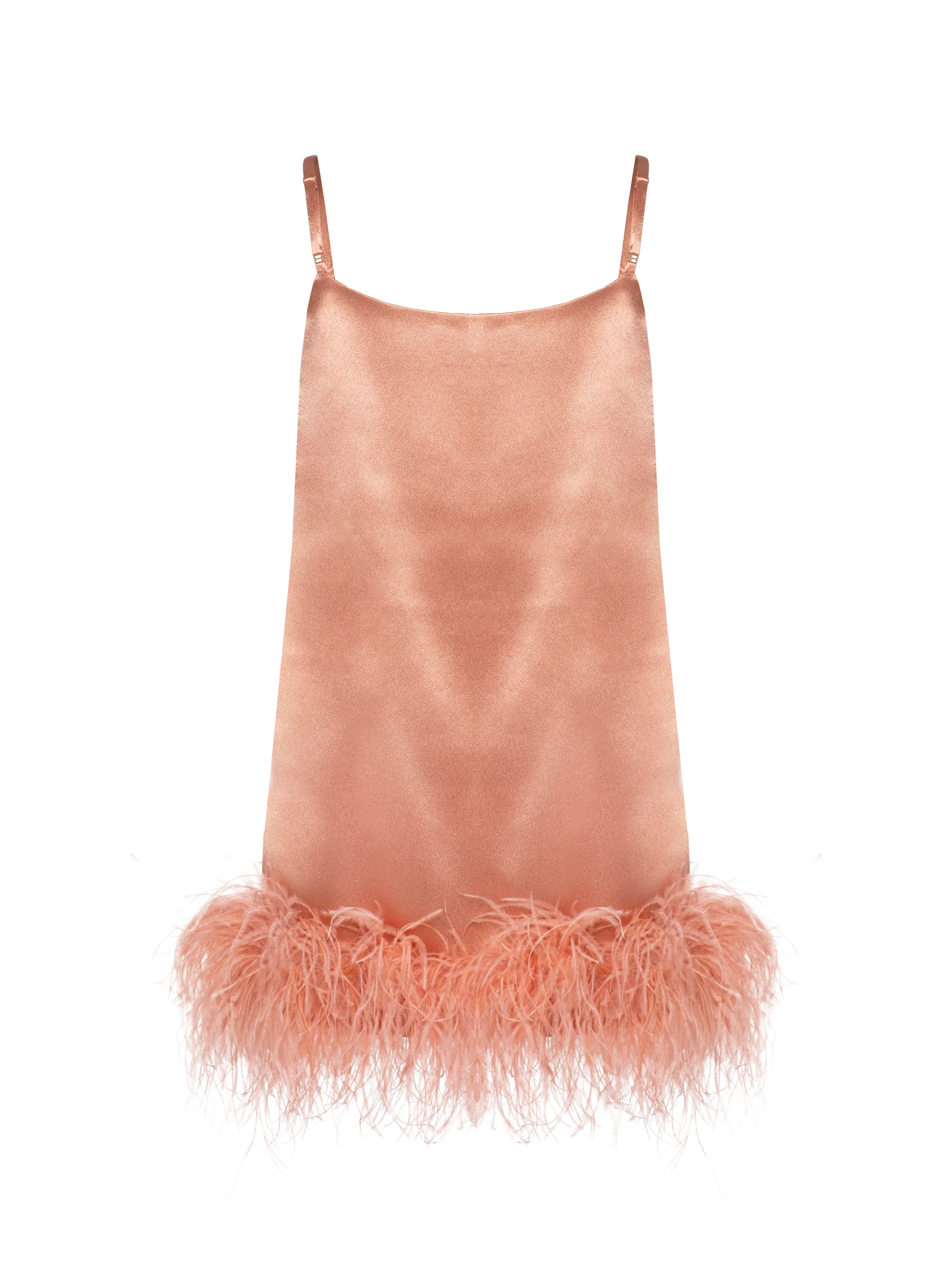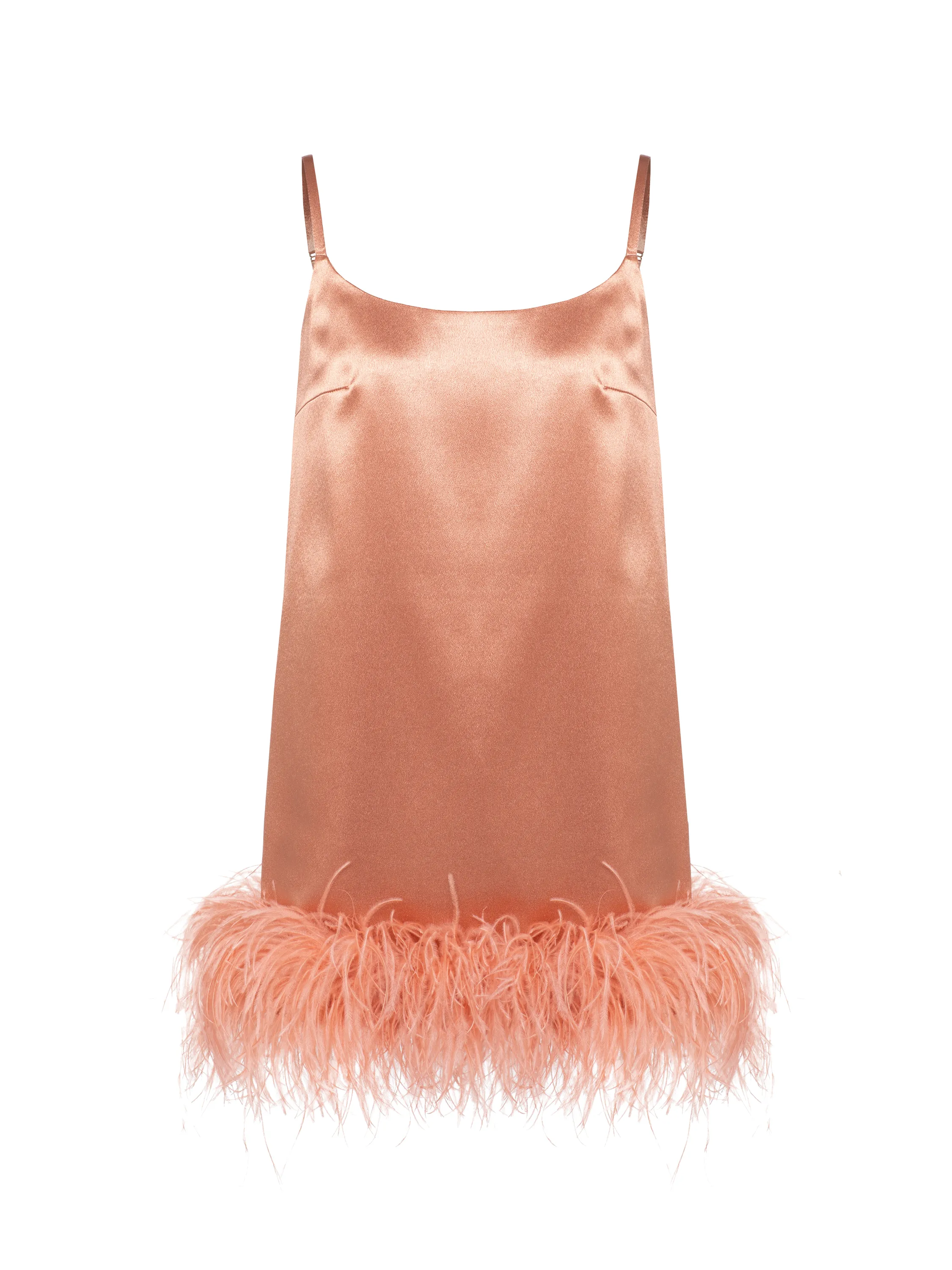 The evening mini dress with thin straps is made of peach satin with a golden sheen. To make the model a bit more romantic, the hem is decorated with a tonal statement boa. Complete the feminine look with elegant sandals.