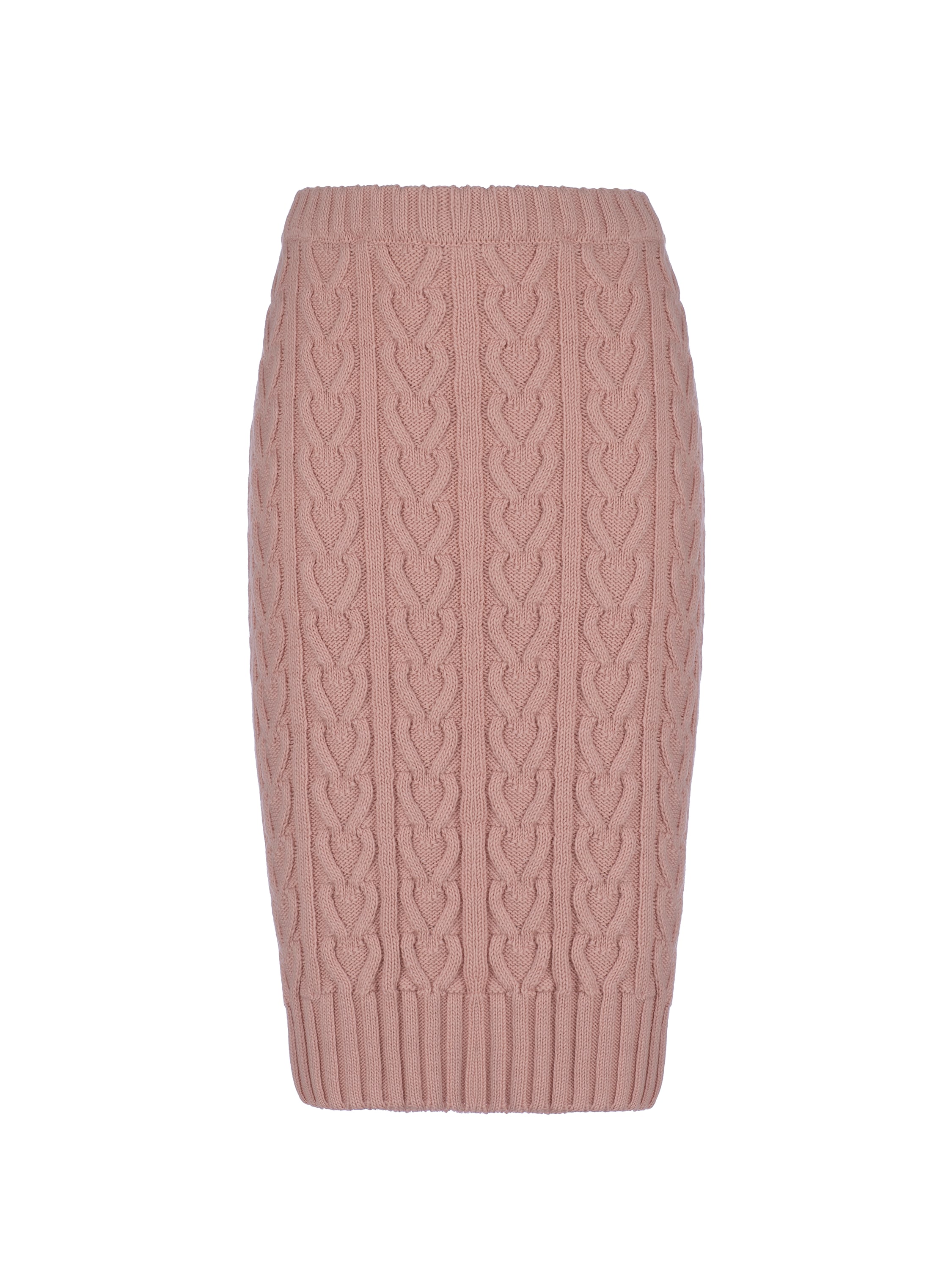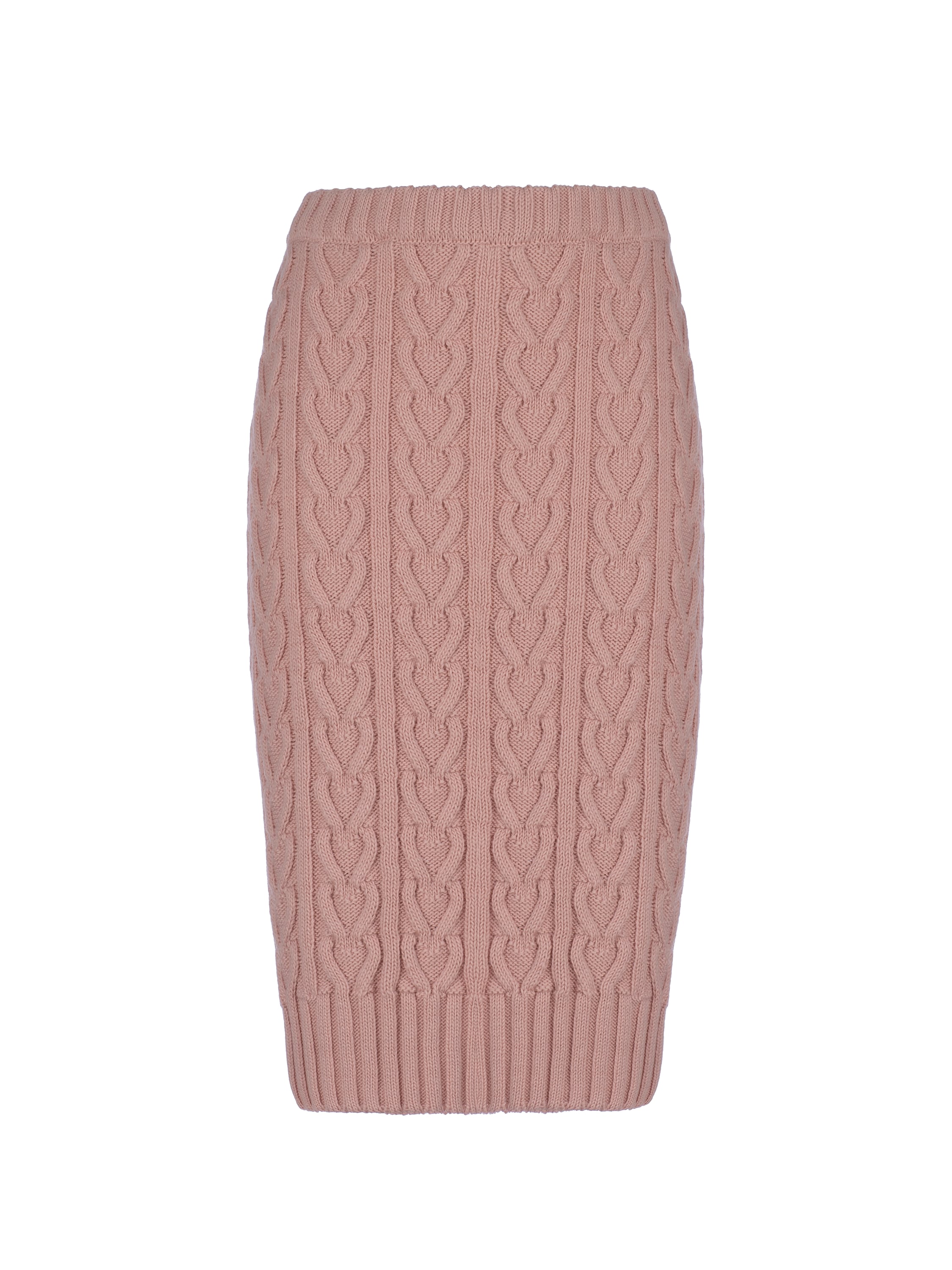The pink knitted midi skirt with braids is made of blended wool that fits the figure closely without restricting movement. The waistband with an elastic band ensures a comfortable fit at the high waist.