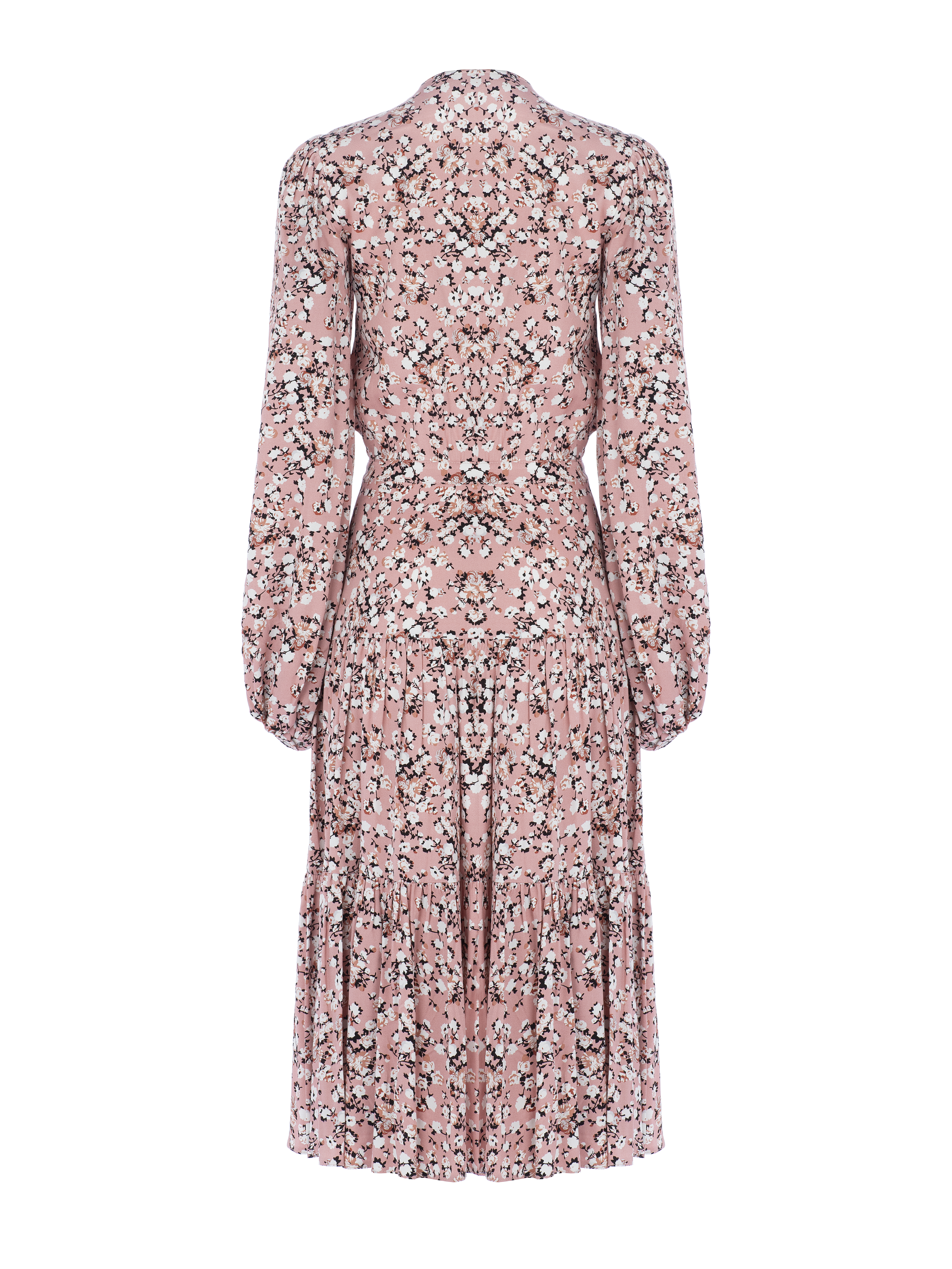 Pink summer midi dress is made of thin rayon with small floristic print. The model is completed with a button closure and long puffed sleeves. The hem is cut in two tiers.