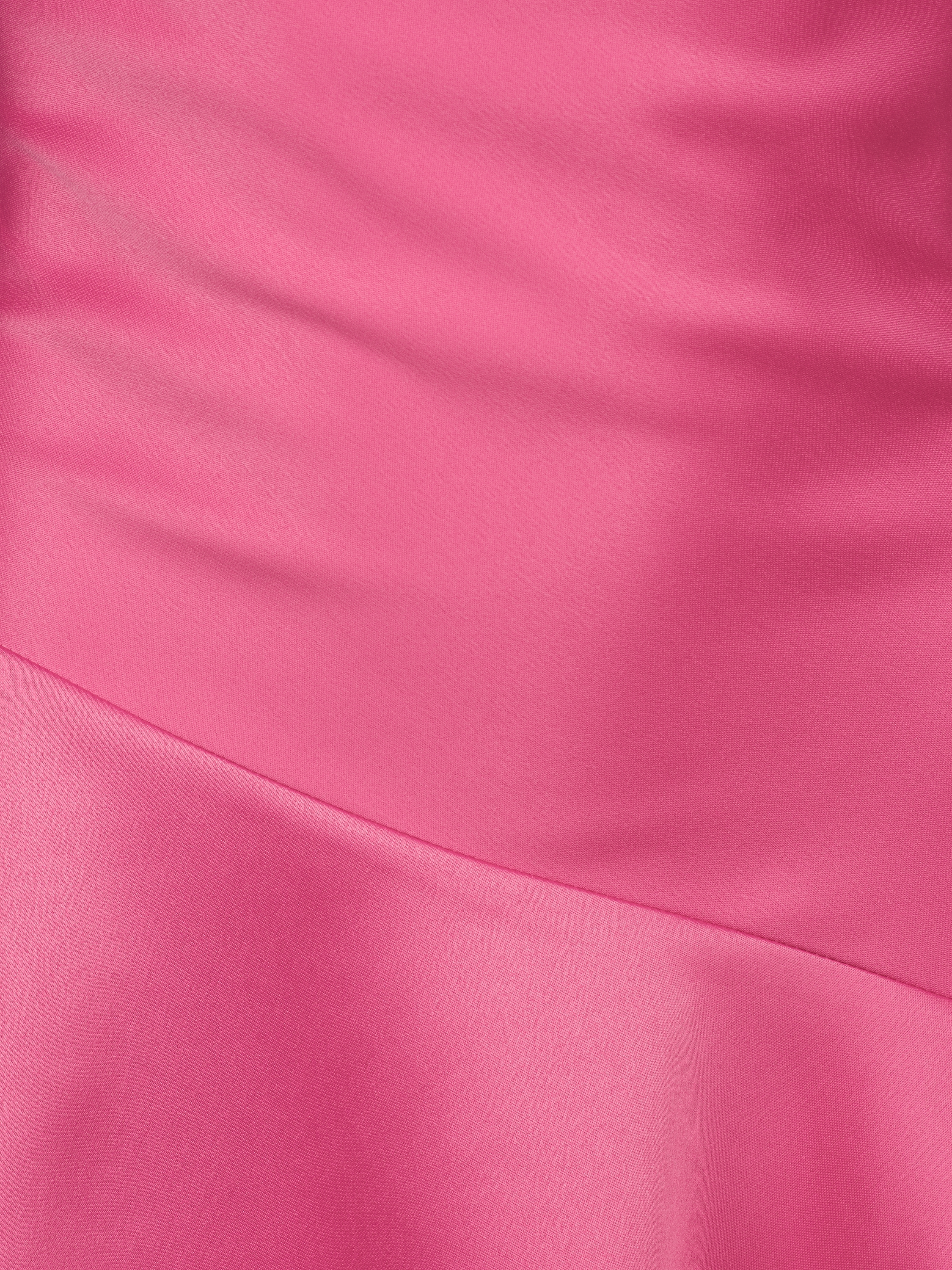 The pink satin strappy dress is made of a viscose blend with silk. The mini-length piece is complemented by an asymmetric godet hem cut on the bias.