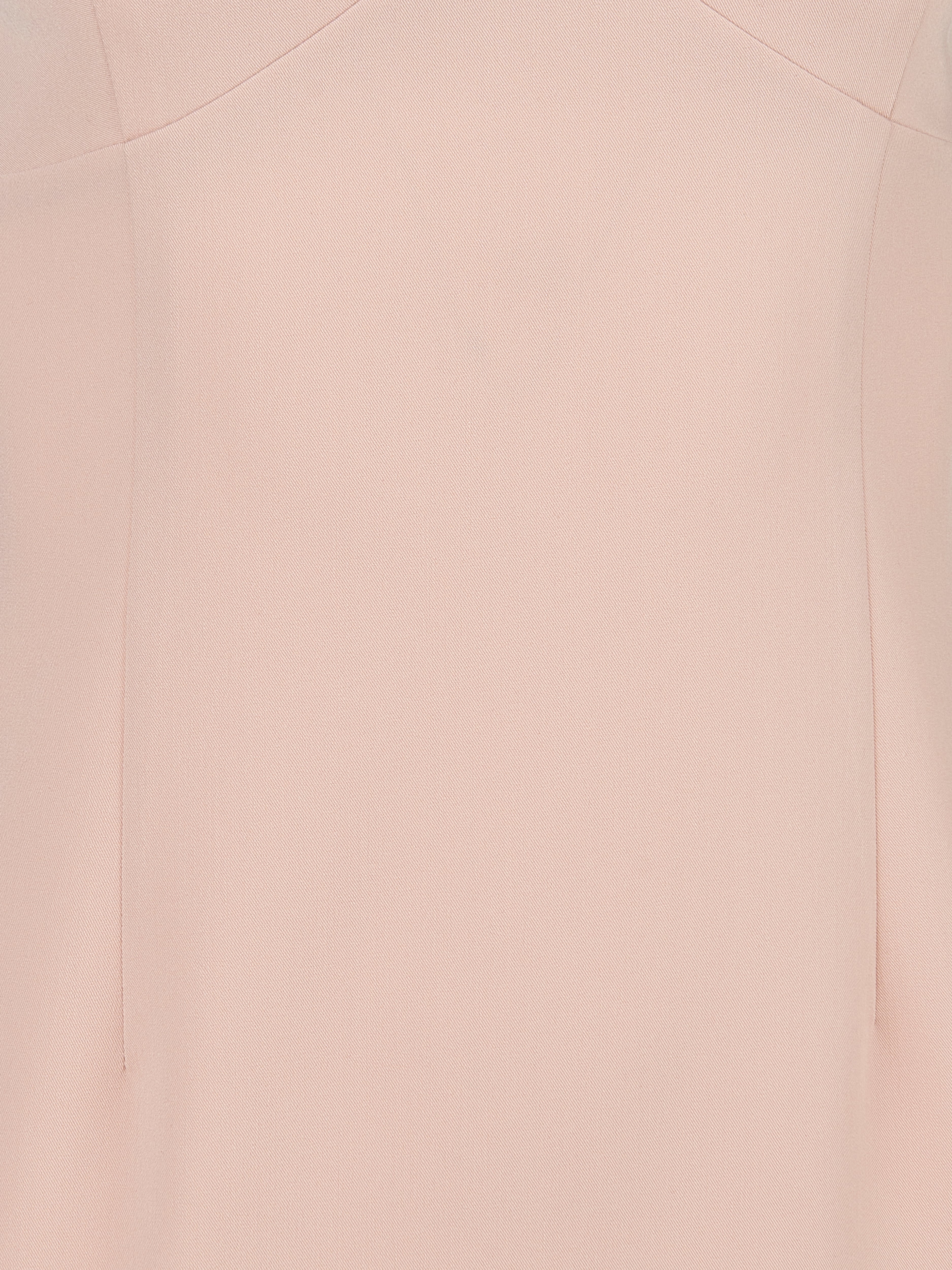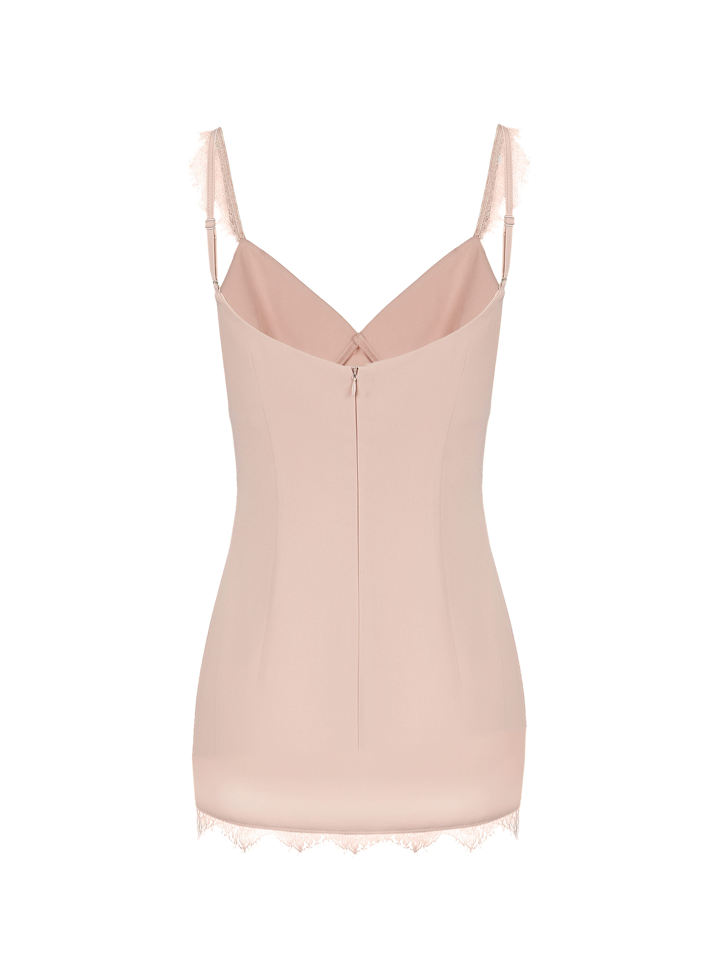 For the ultra-short slip dress with thin straps, a blended viscose fabric in a pink shade was used. A garment made of this material flows softly over the body without overheating the skin. The model is complemented by white semi-transparent lace.