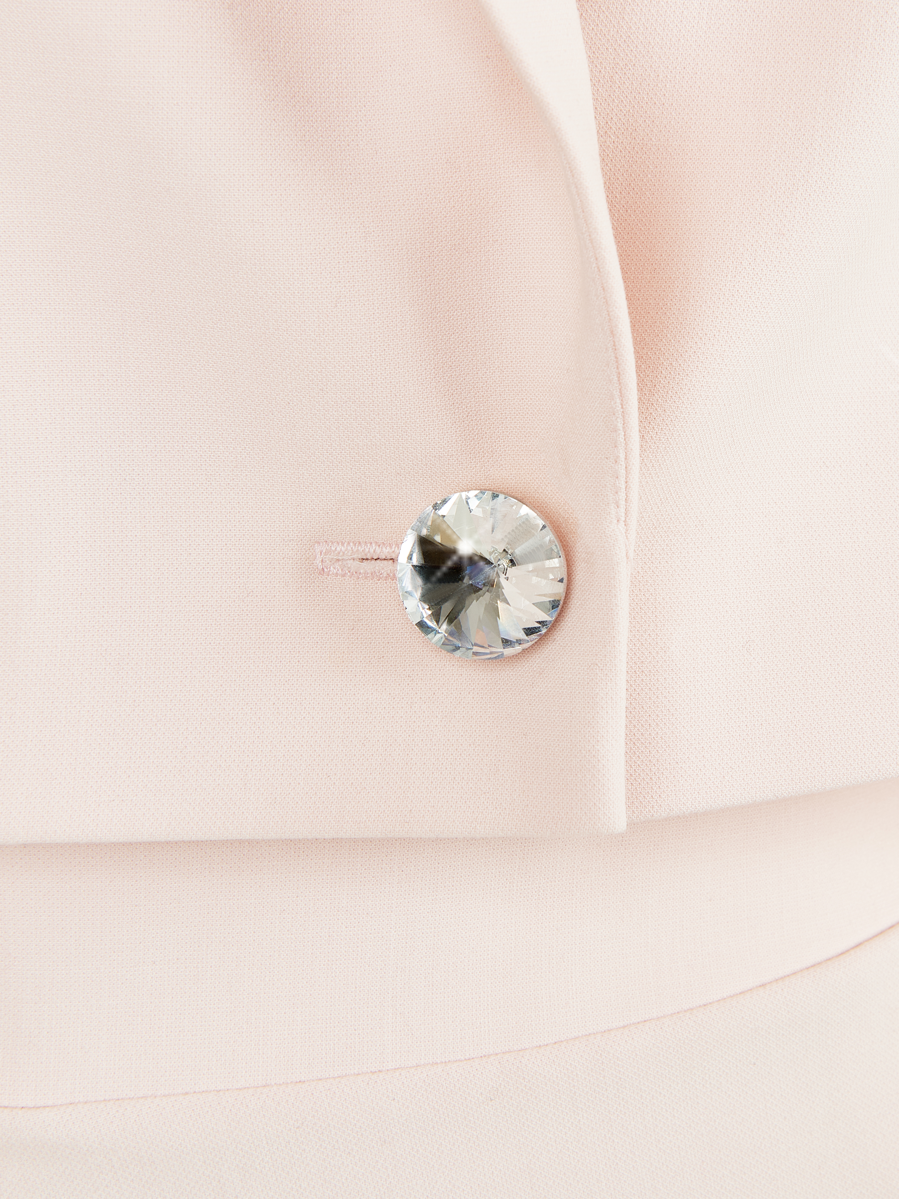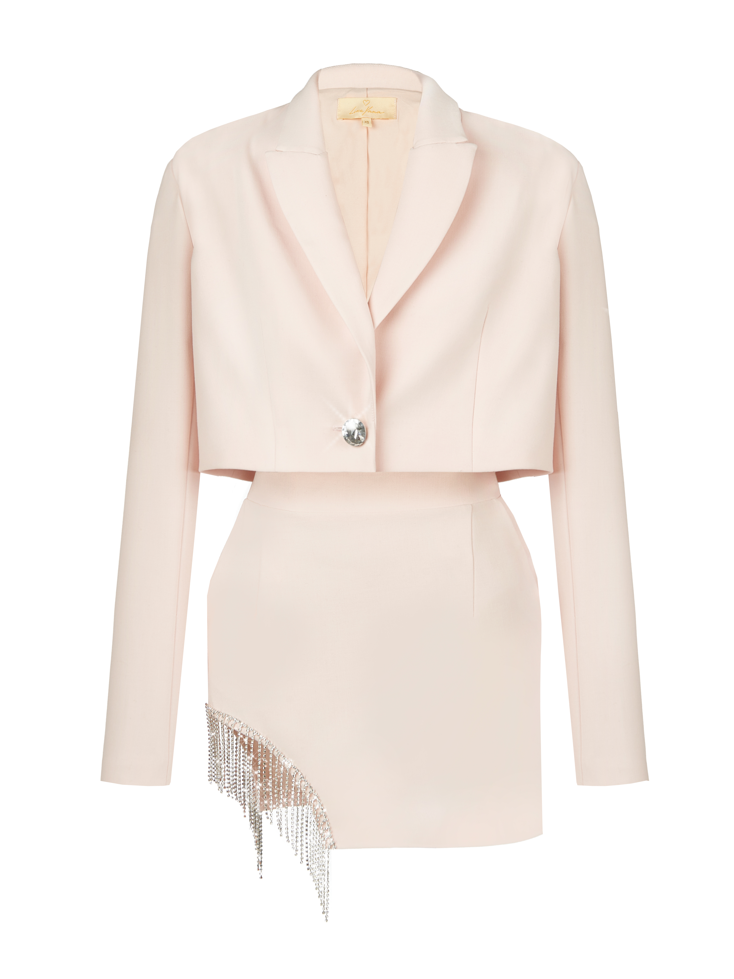 If the format of an ordinary mini dress has bored you and seems trivial, this two-piece suit is for you. A cropped jacket in a delicate pink shade with a crystal button + a high-waisted mini skirt with a slit decorated with sparkling fringe. Together they are the perfect pair for bright celebrations, and separately they can easily fit into your everyday wardrobe.