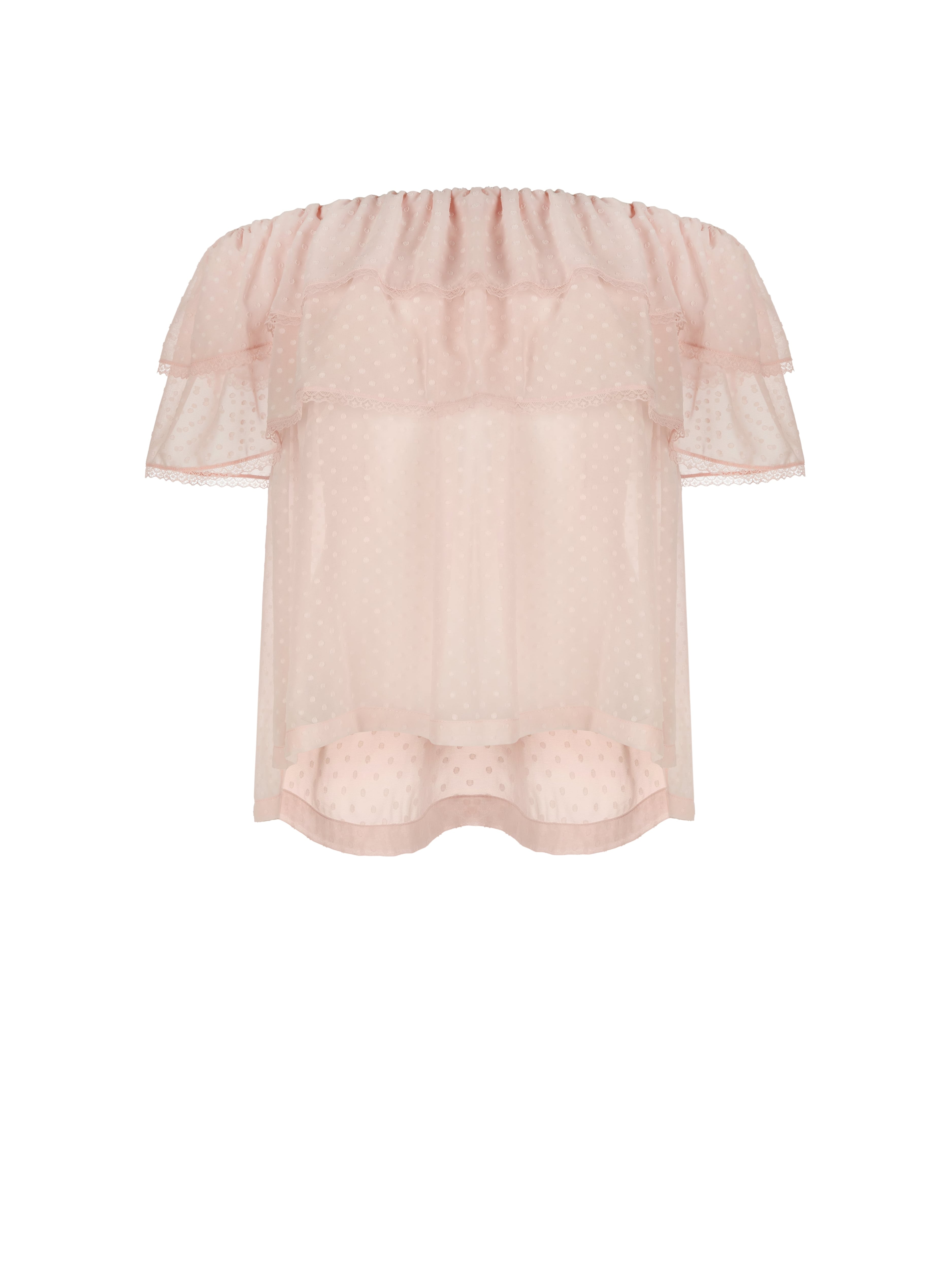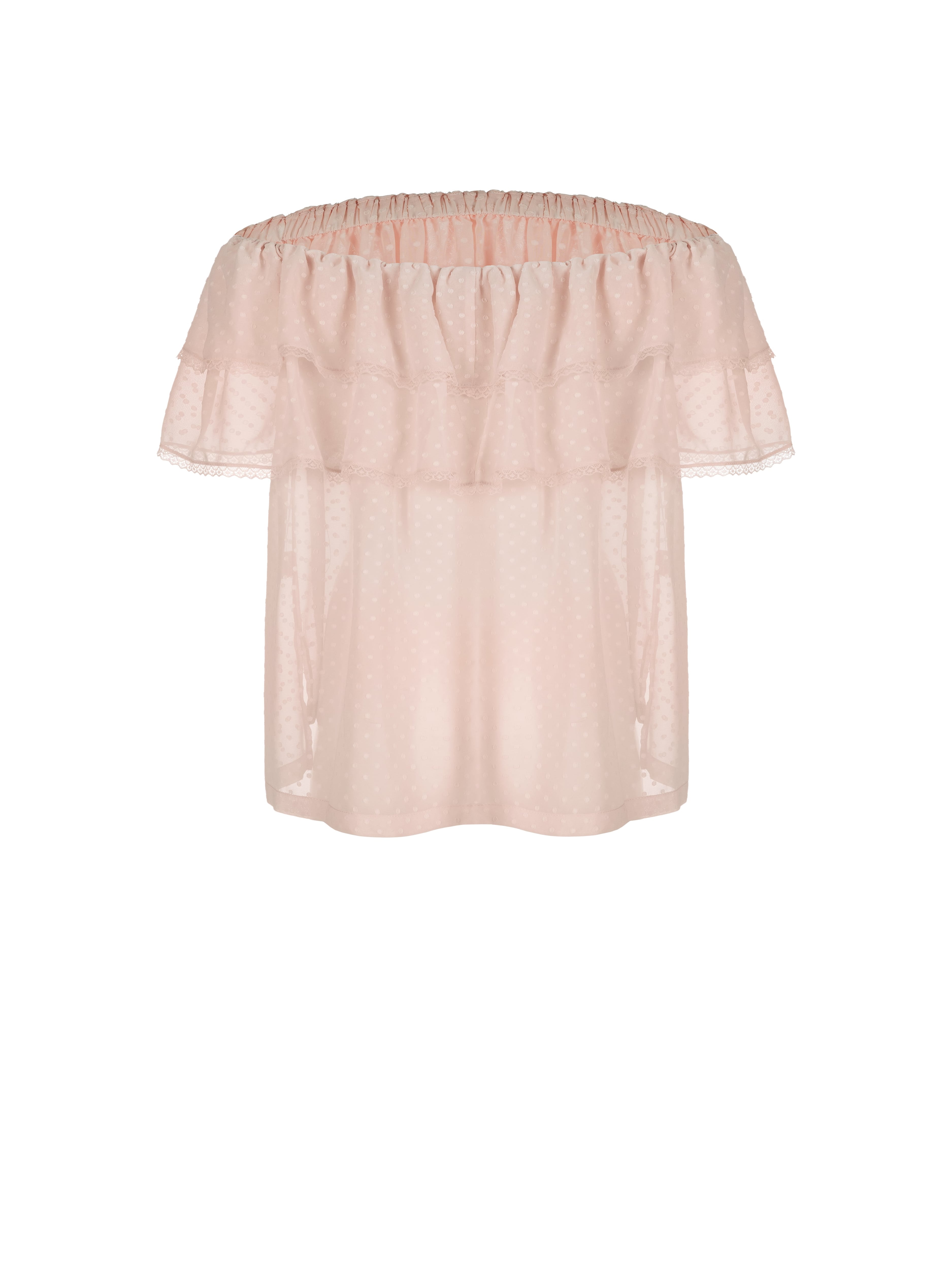 The pink top with an open shoulder line and ruffles will showcase delicate collarbones. The model is made of lightweight polka-dot chiffon.