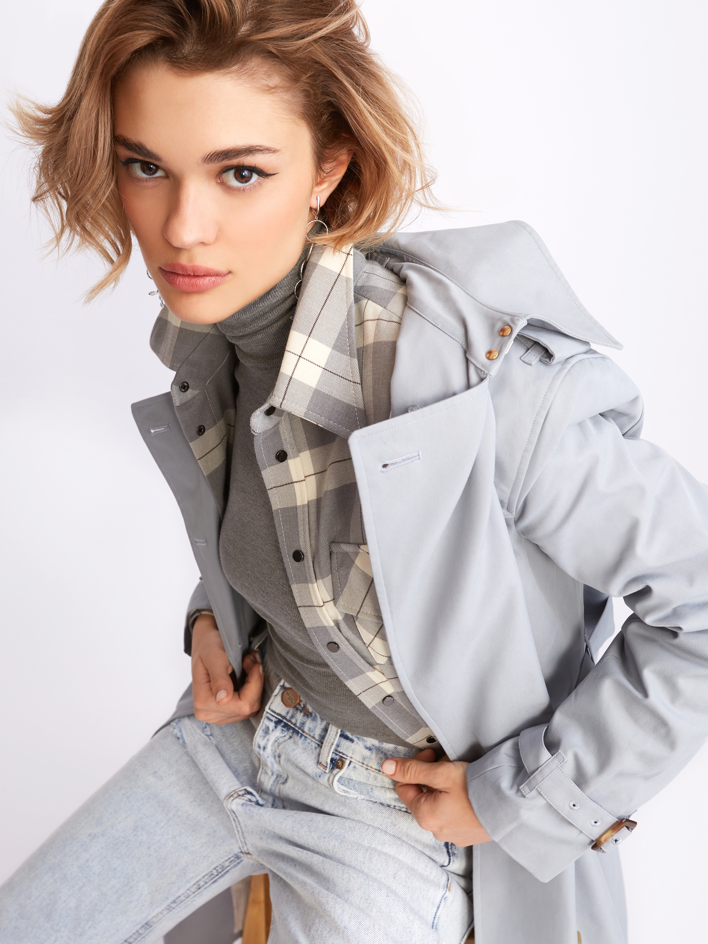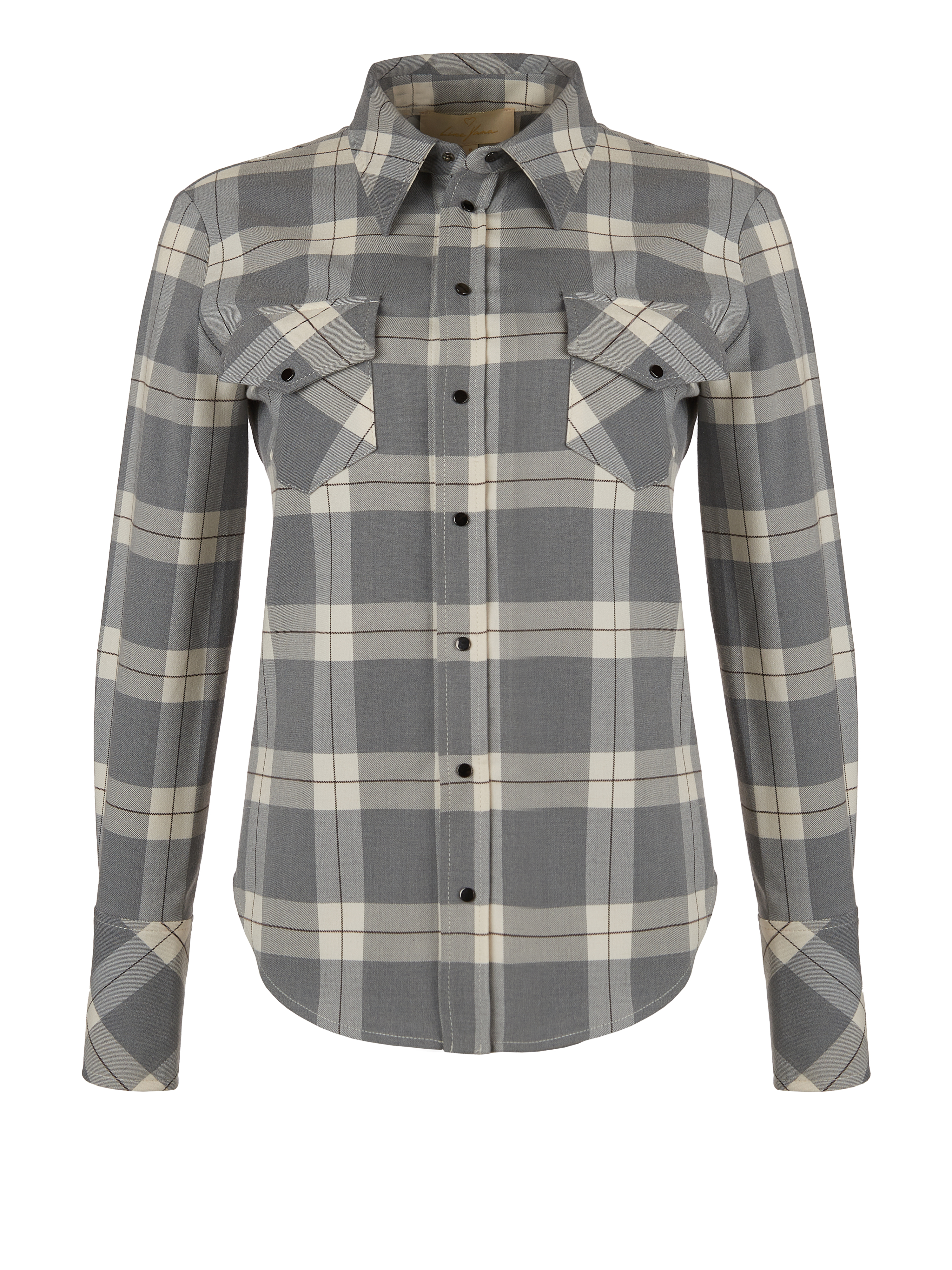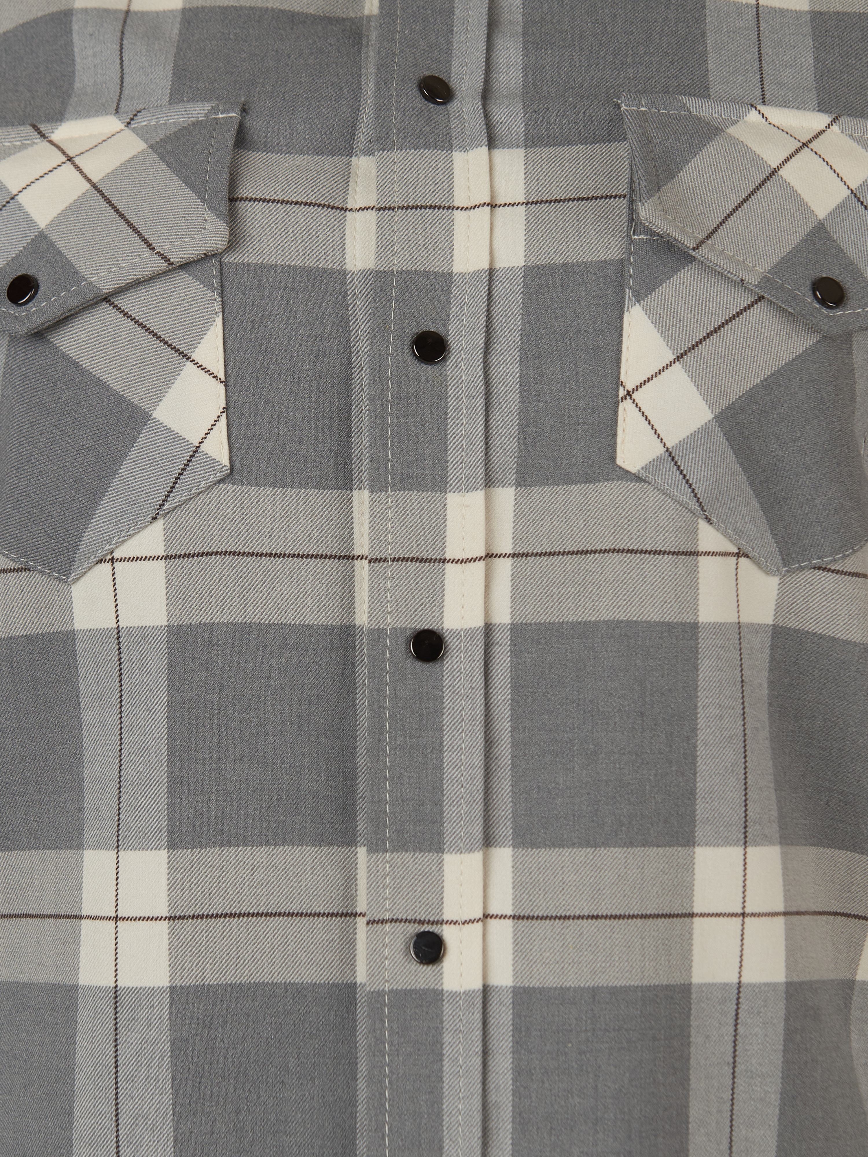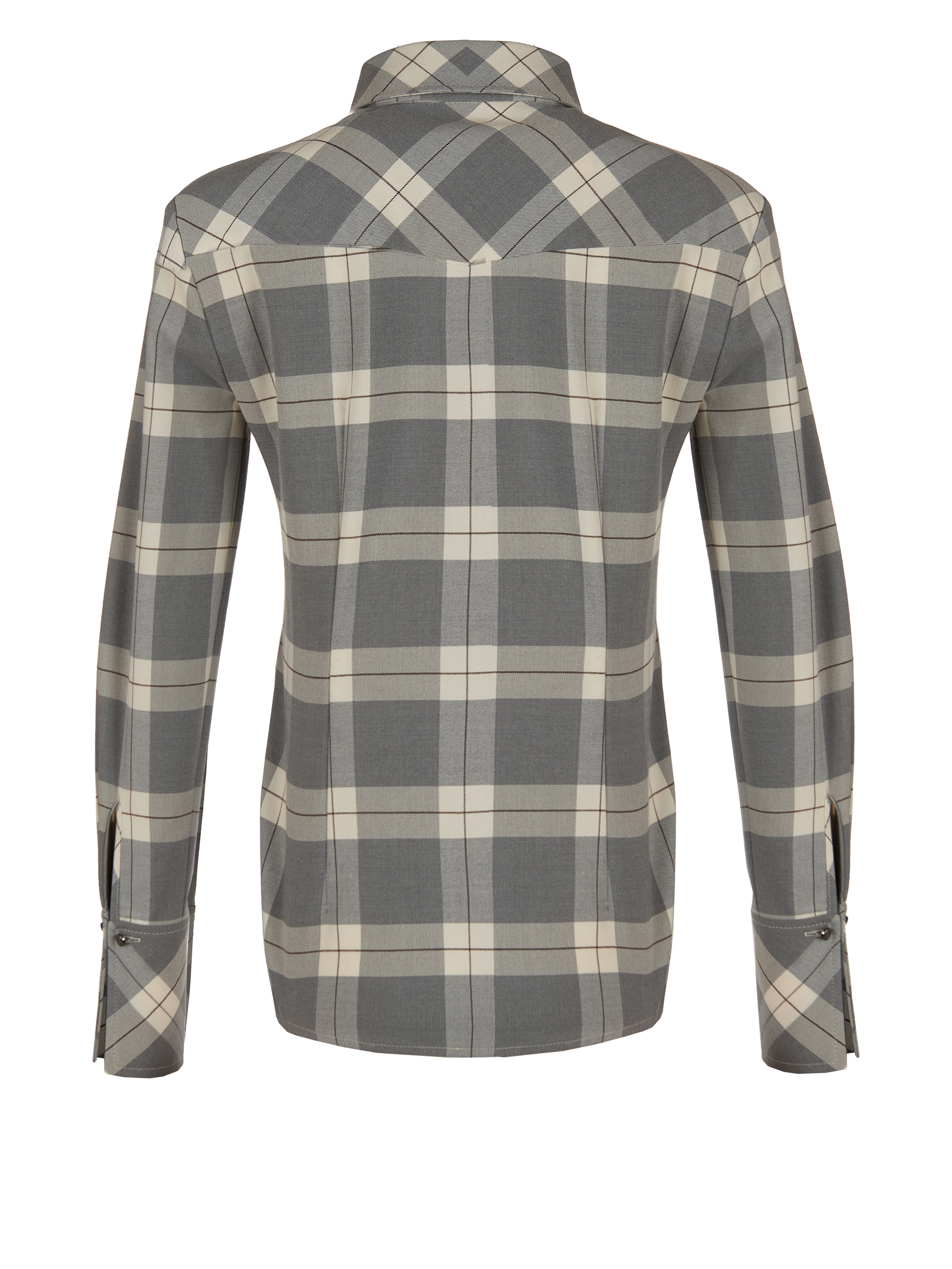 A grey shirt in a milky check is made of fine suiting wool with added viscose. The fitted model is complemented by two patch pockets on the chest and wide cufflinks-ready cuffs.