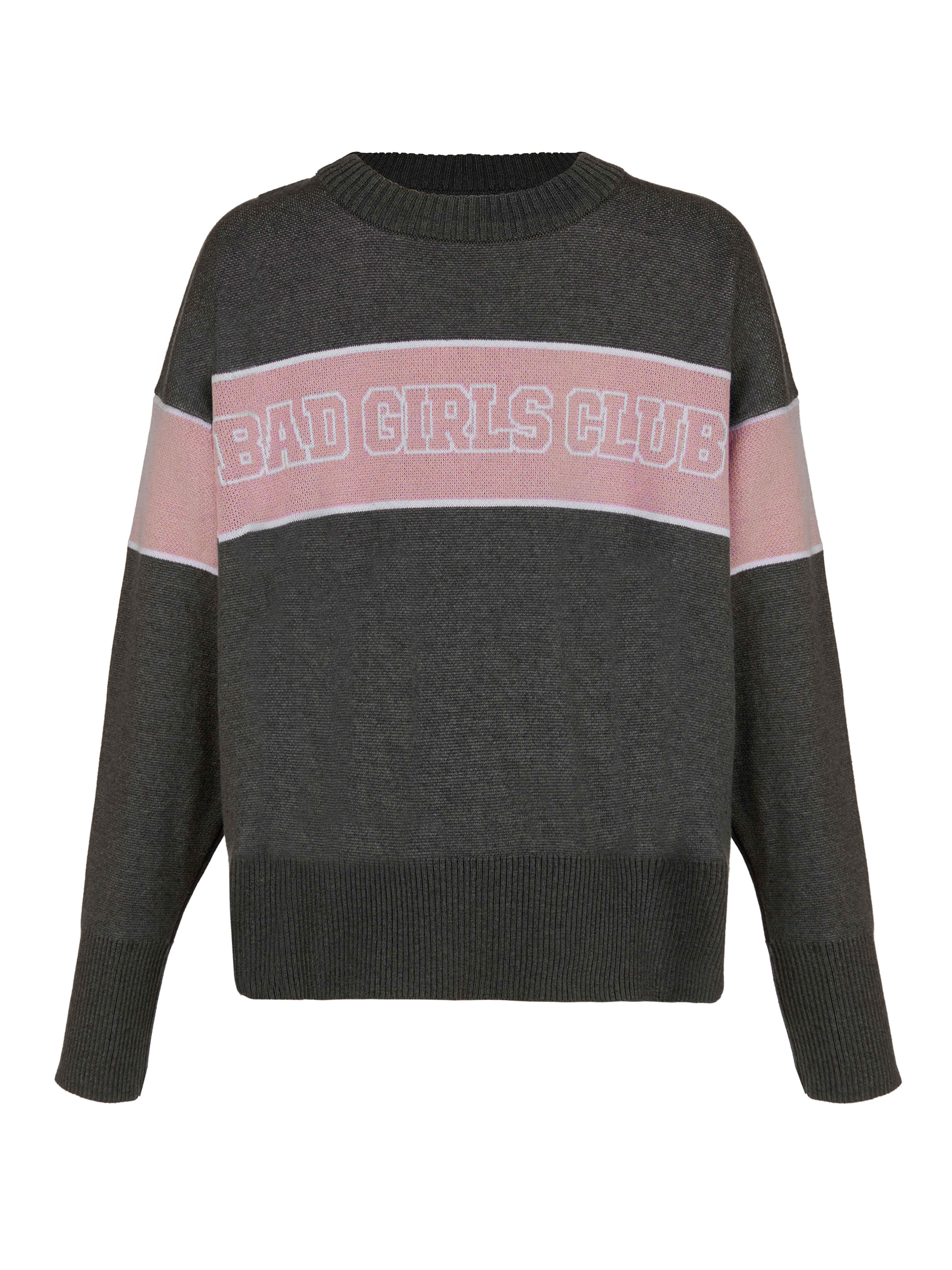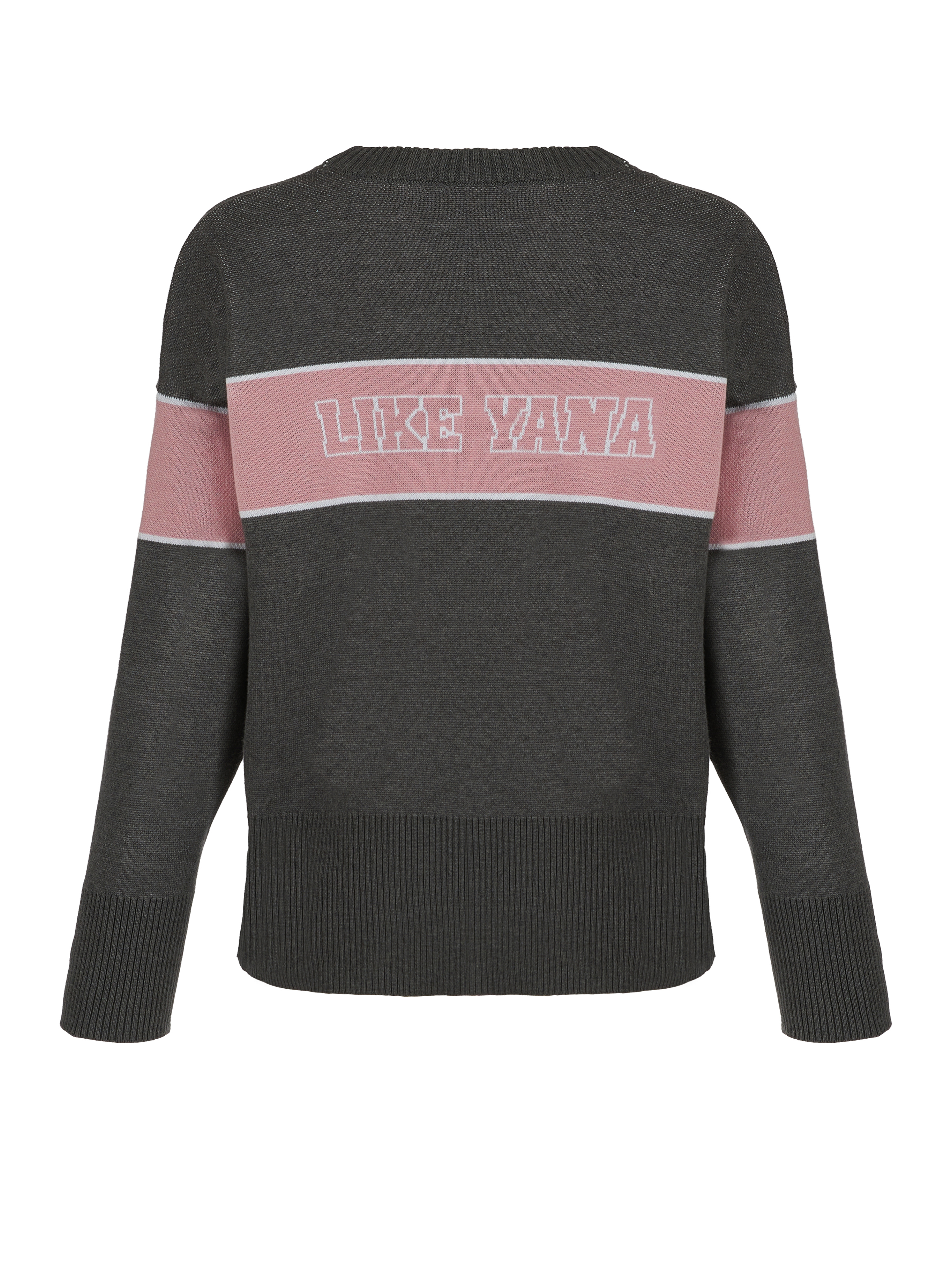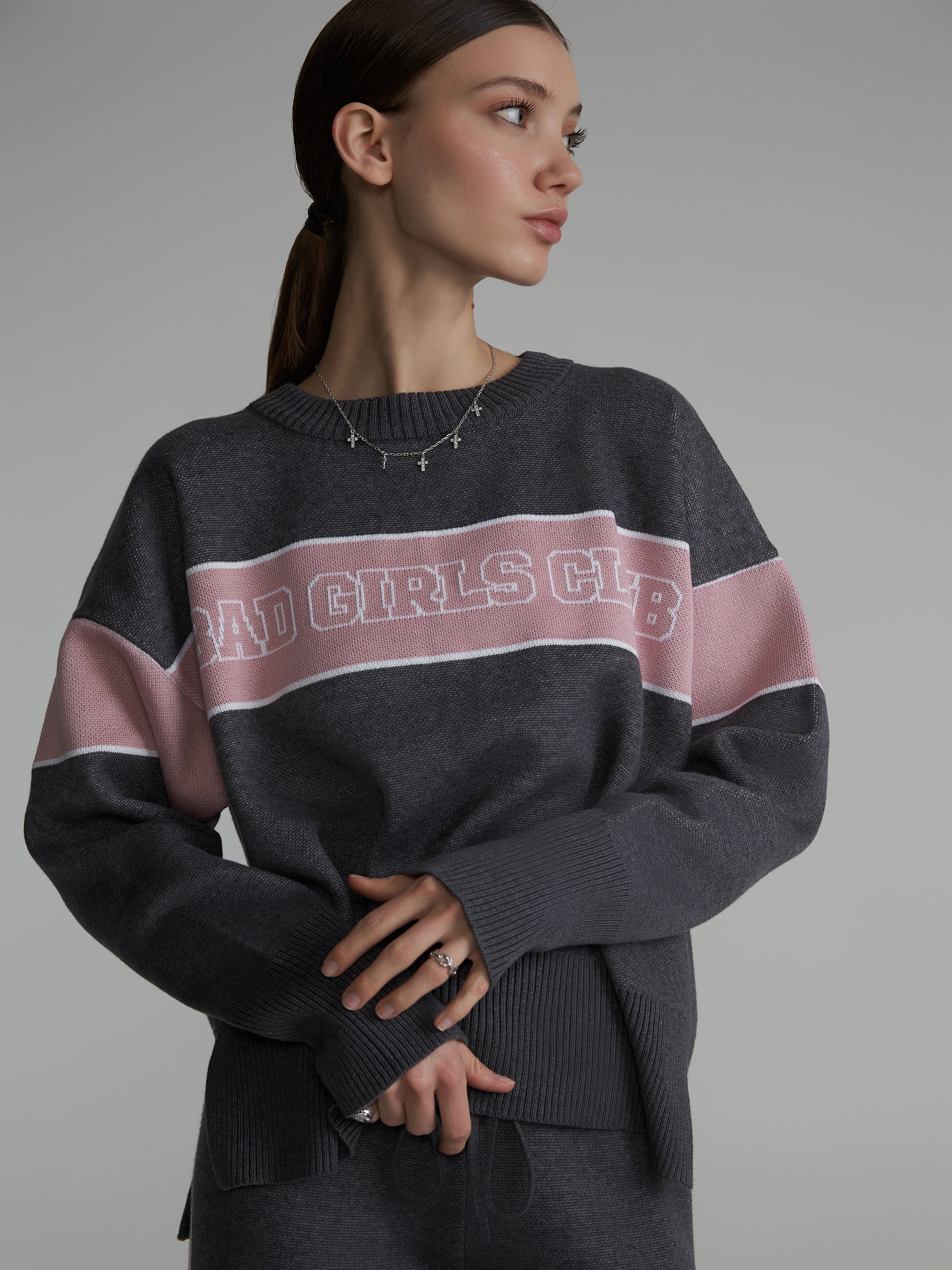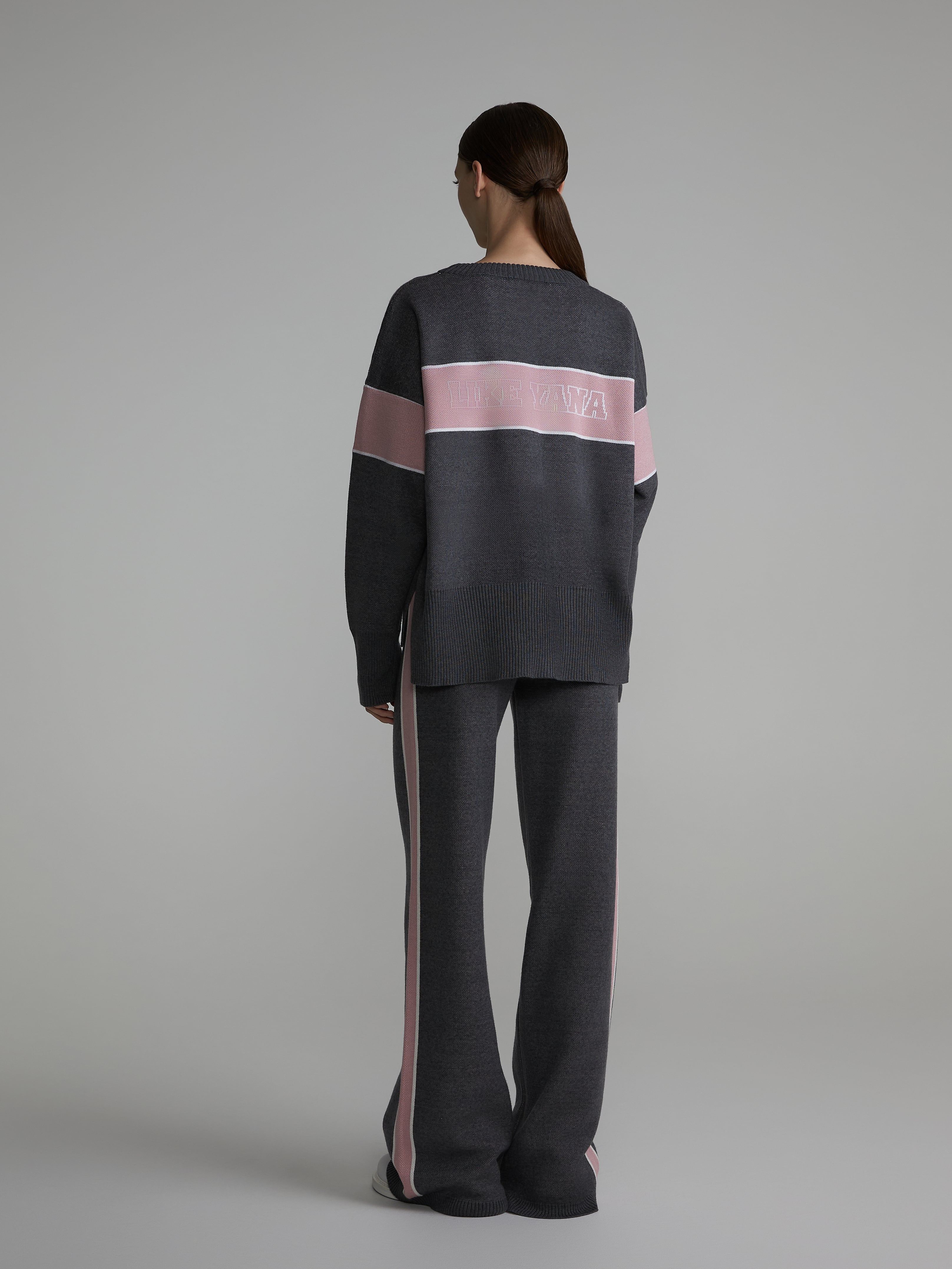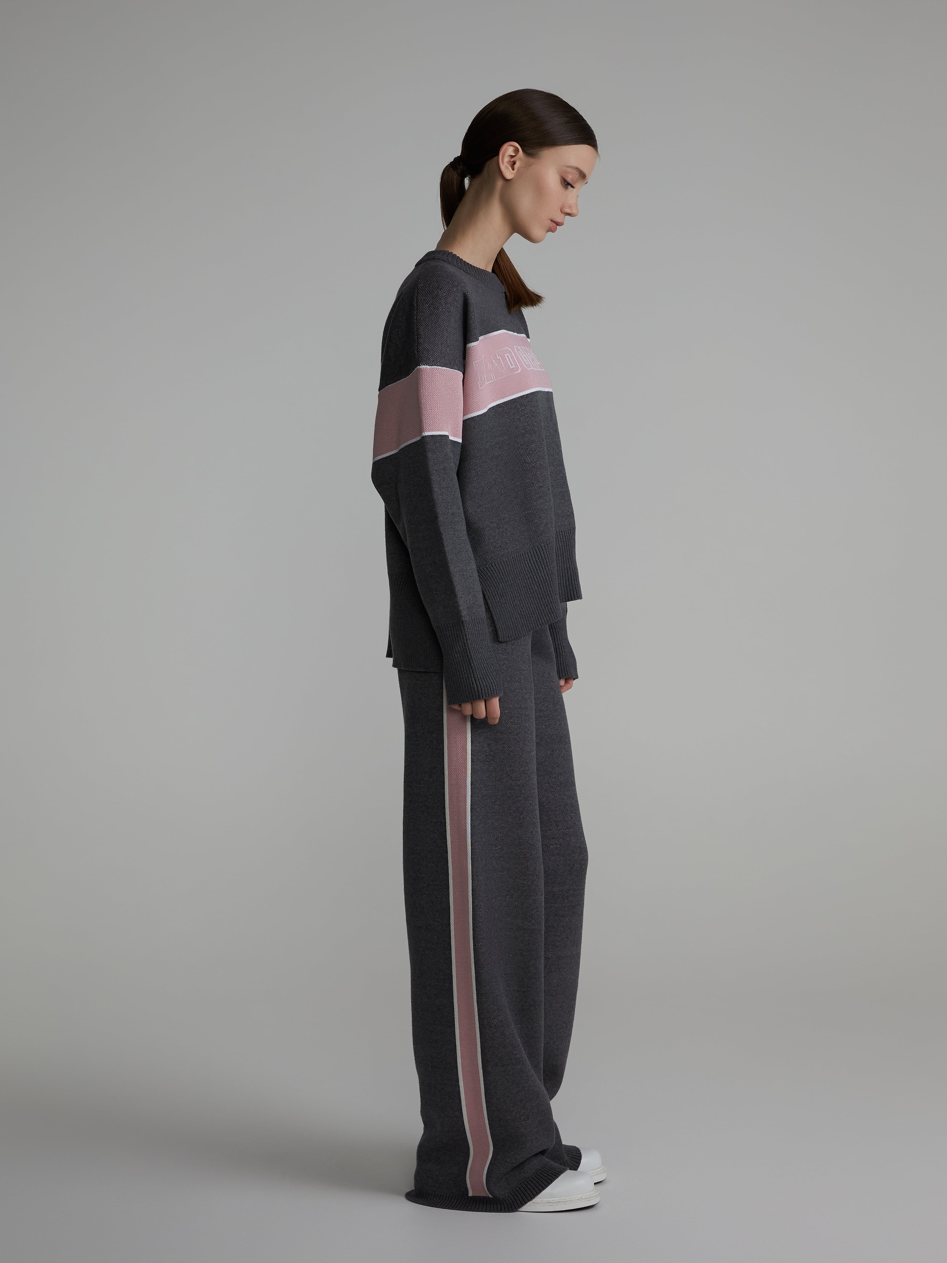 A wide grey-pink sweater with side slits is a vivid example of sport-chic style. The oversized cut and versatile color solution allow you to mix it both with jeans and track pants, as well as with more classic pieces.