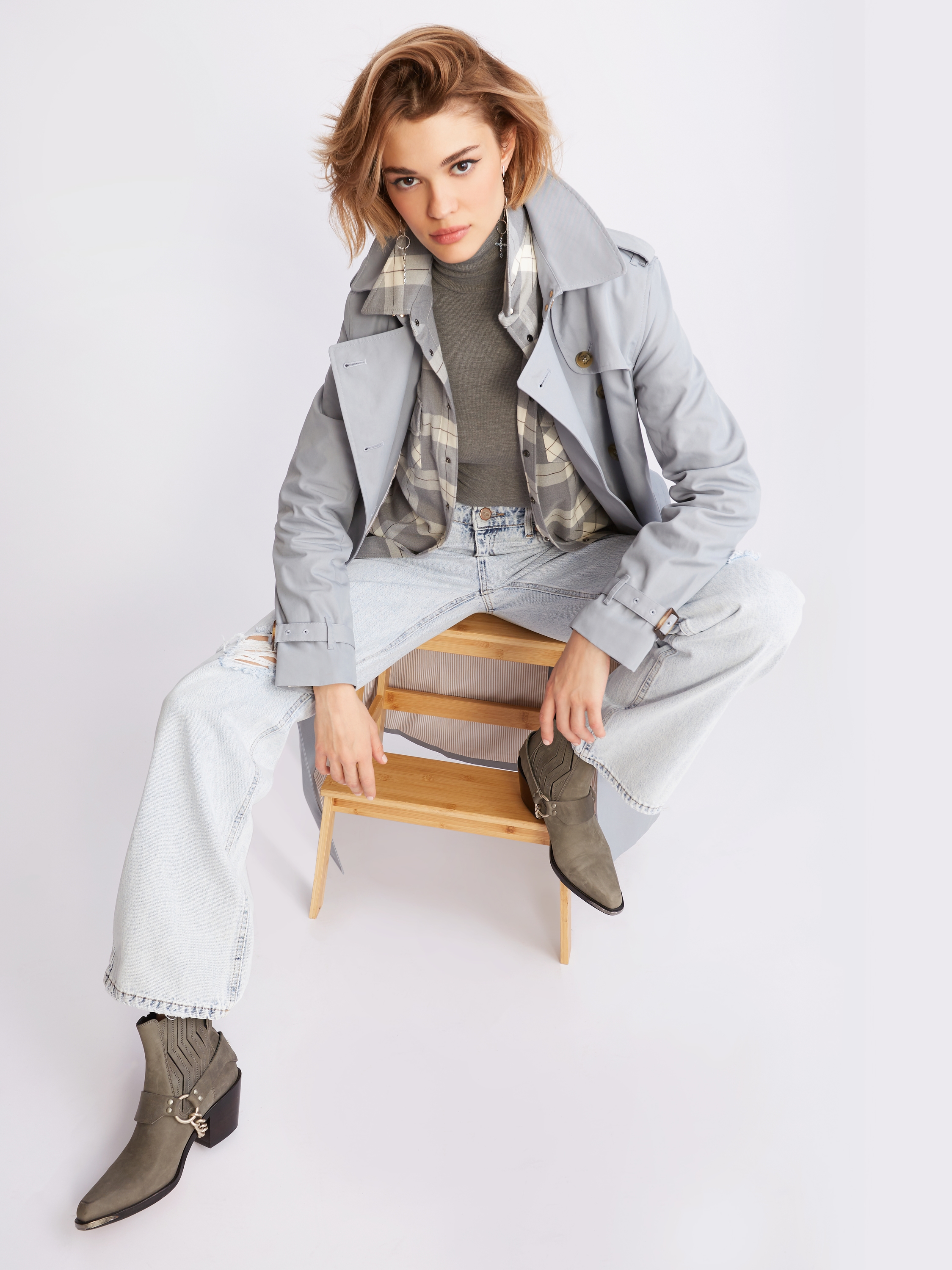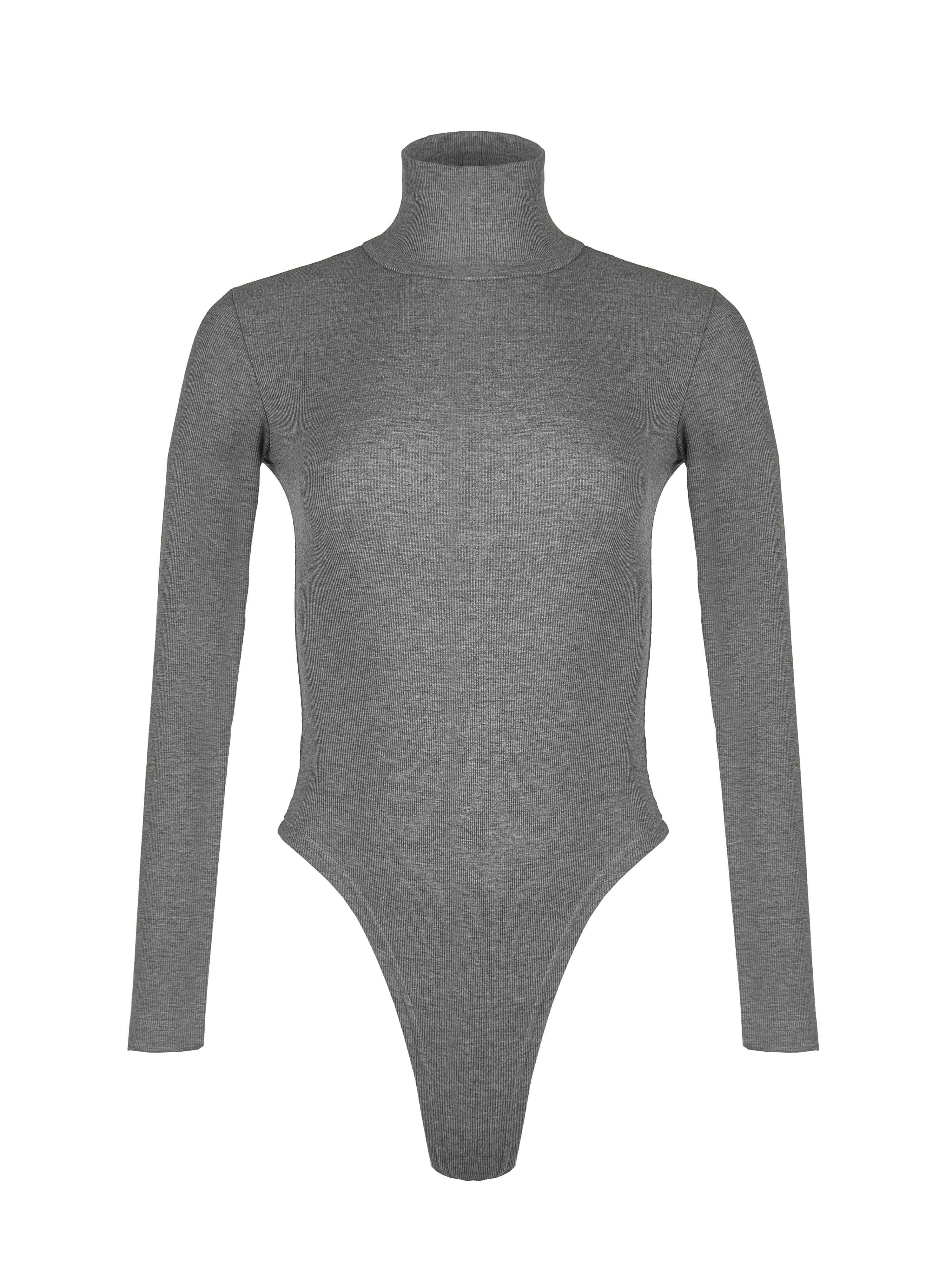 The grey bodysuit with a stand-up collar and long sleeves will work as a turtleneck both for an everyday look and for an office outfit. The model is made of cotton ribbed knit. The bodysuit fastens with snaps at the bottom.