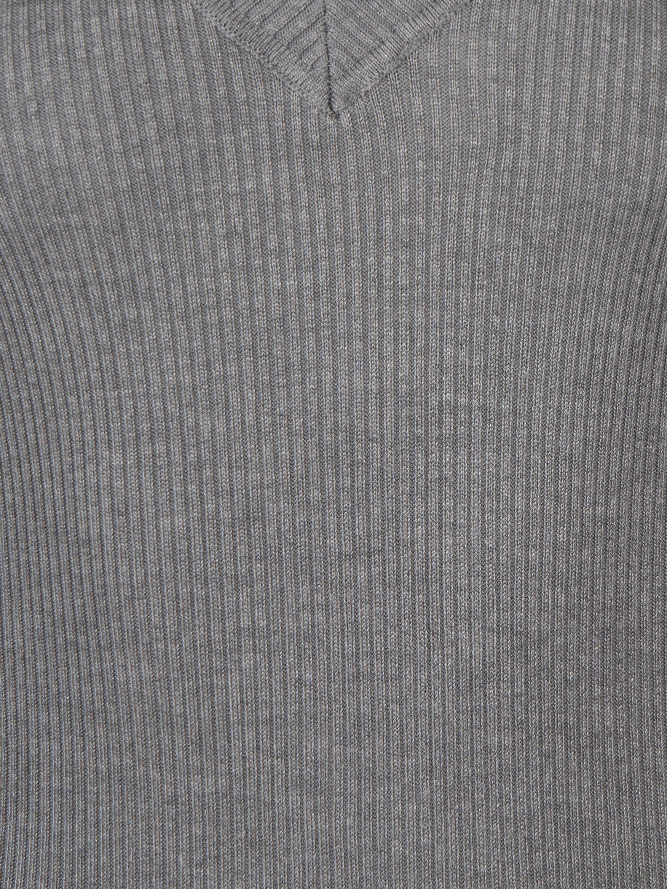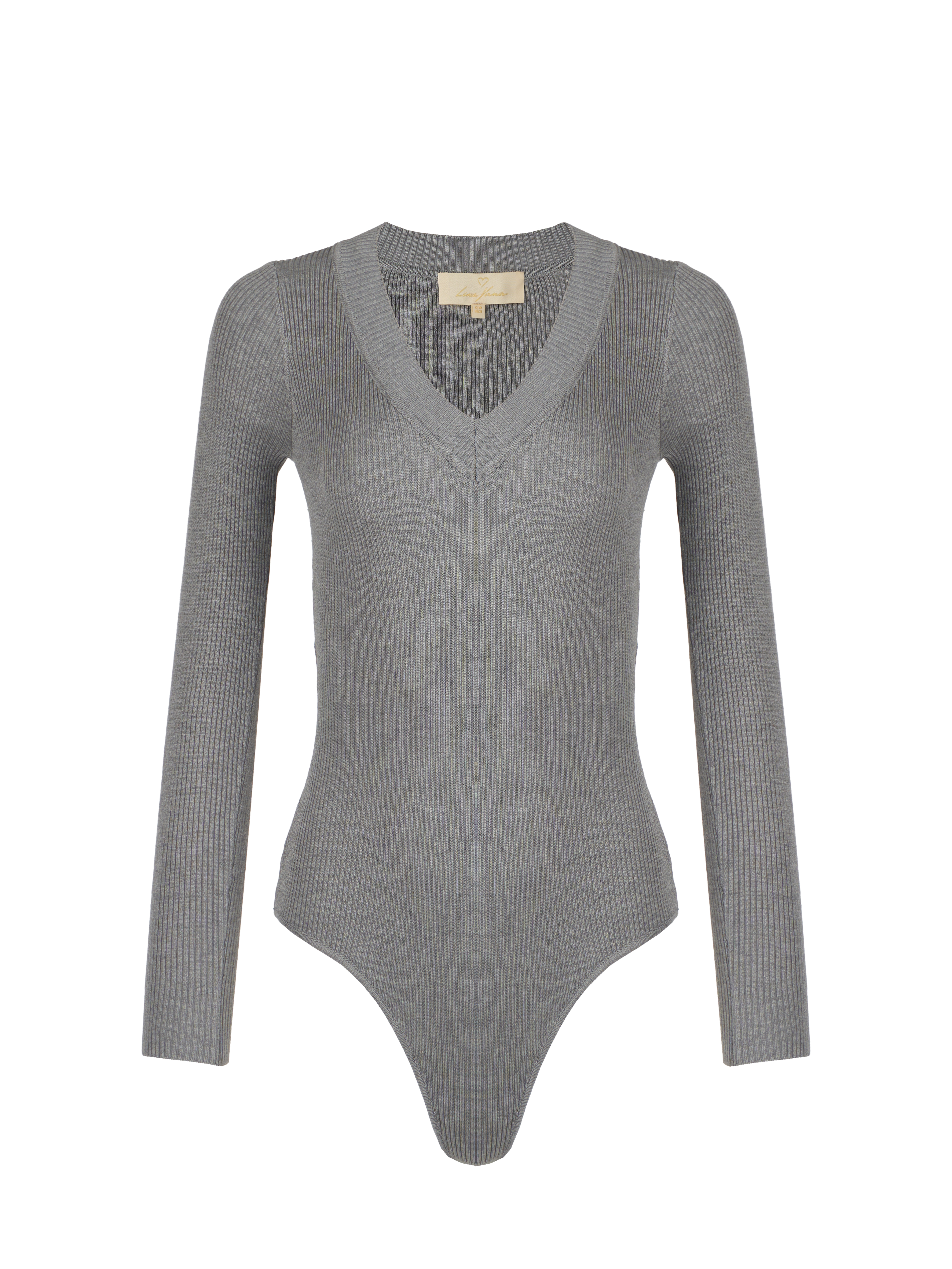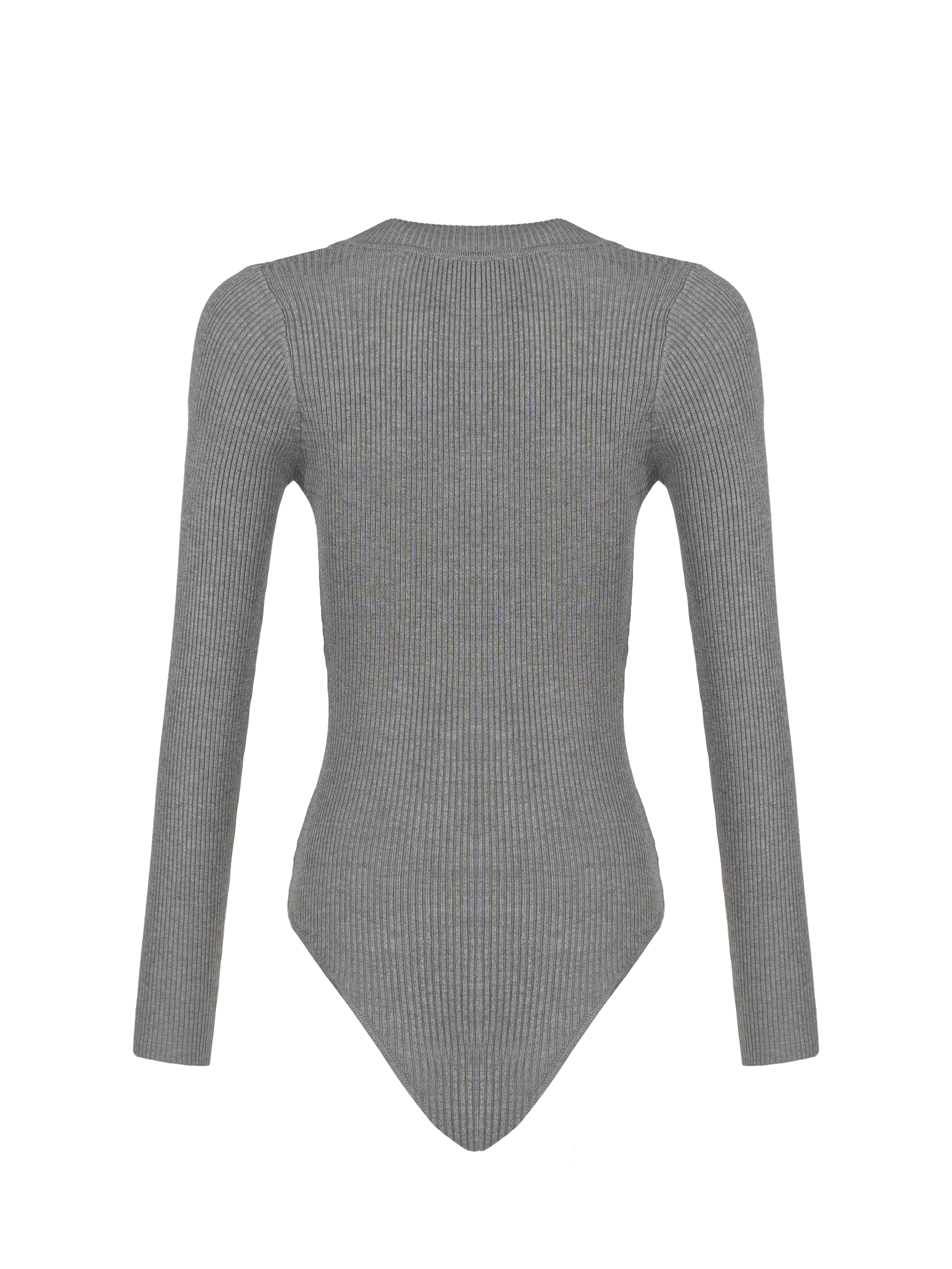 A gray bodysuit with a deep V-neckline and long sleeves will work as a basic item both for everyday looks and for office outfits. The piece is made of ribbed knitted cotton jersey. The bodysuit fastens with snap buttons at the bottom.