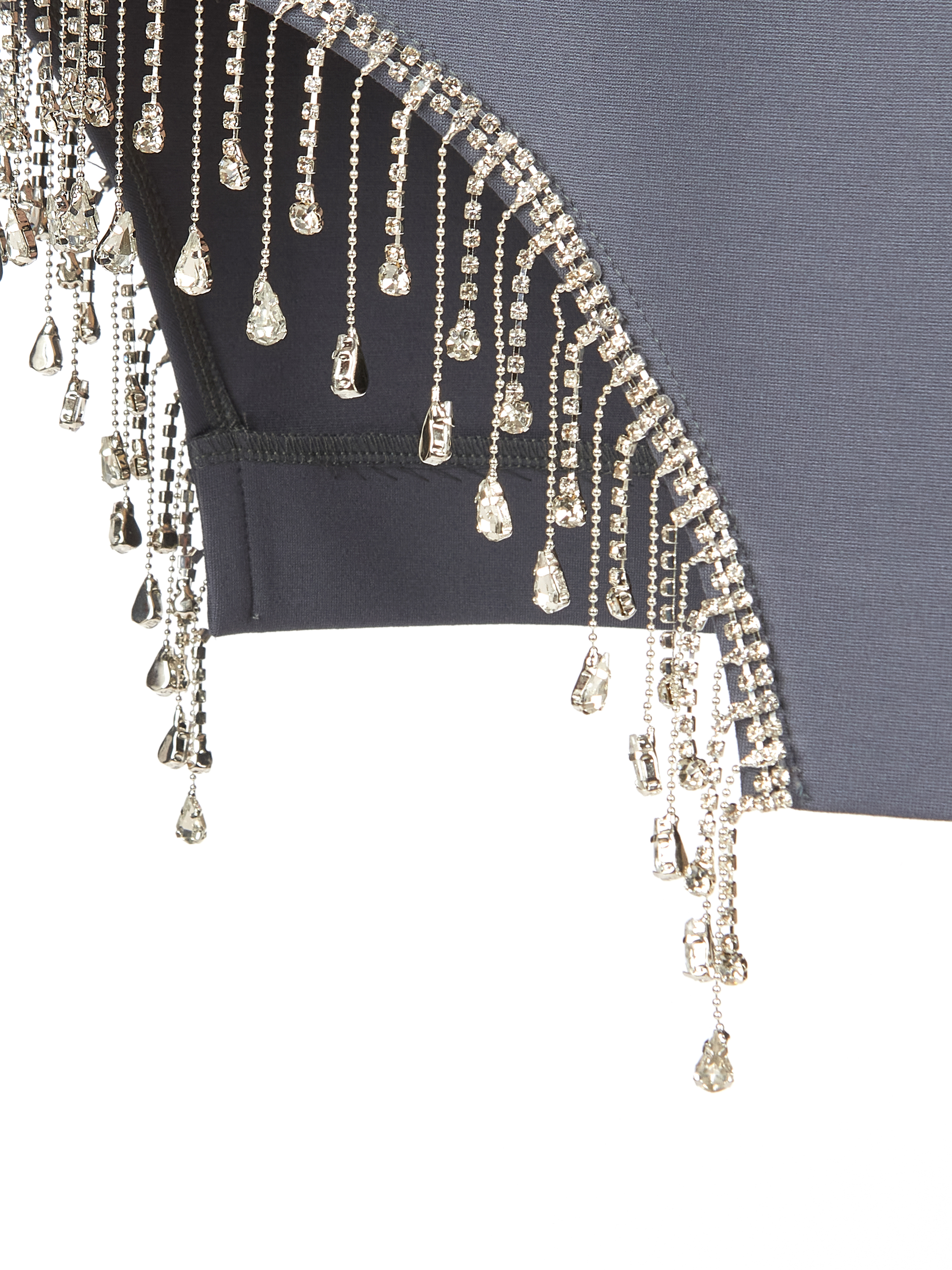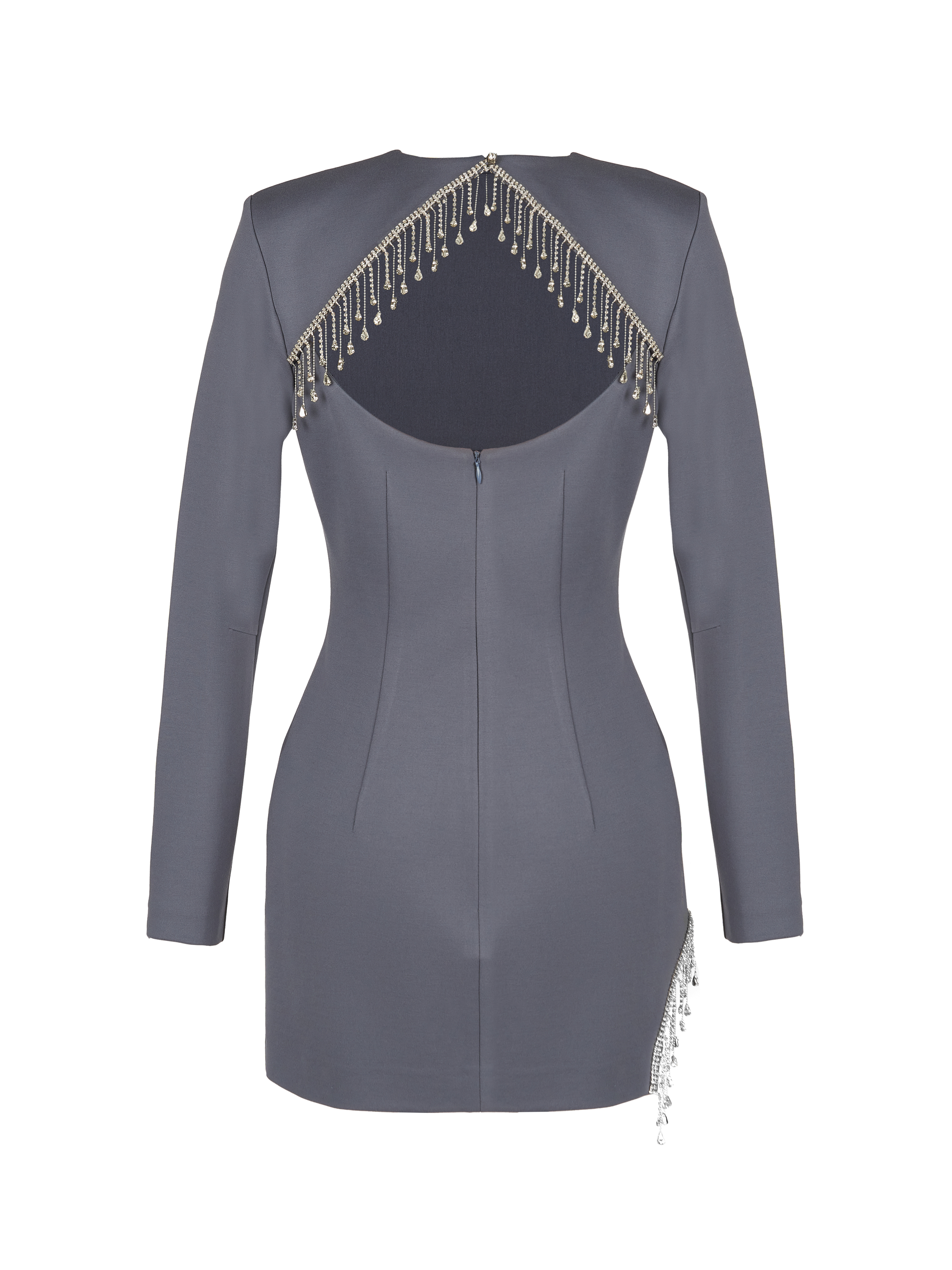 The gray mini dress with long sleeves is made of dense jersey. The fitted cut effectively accentuates the figure, allowing you to showcase every facet of your beauty and femininity. The dress is complemented by shaped cutouts at the hem and on the back, decorated with iridescent rhinestone fringe. Fastens with a concealed back zipper.