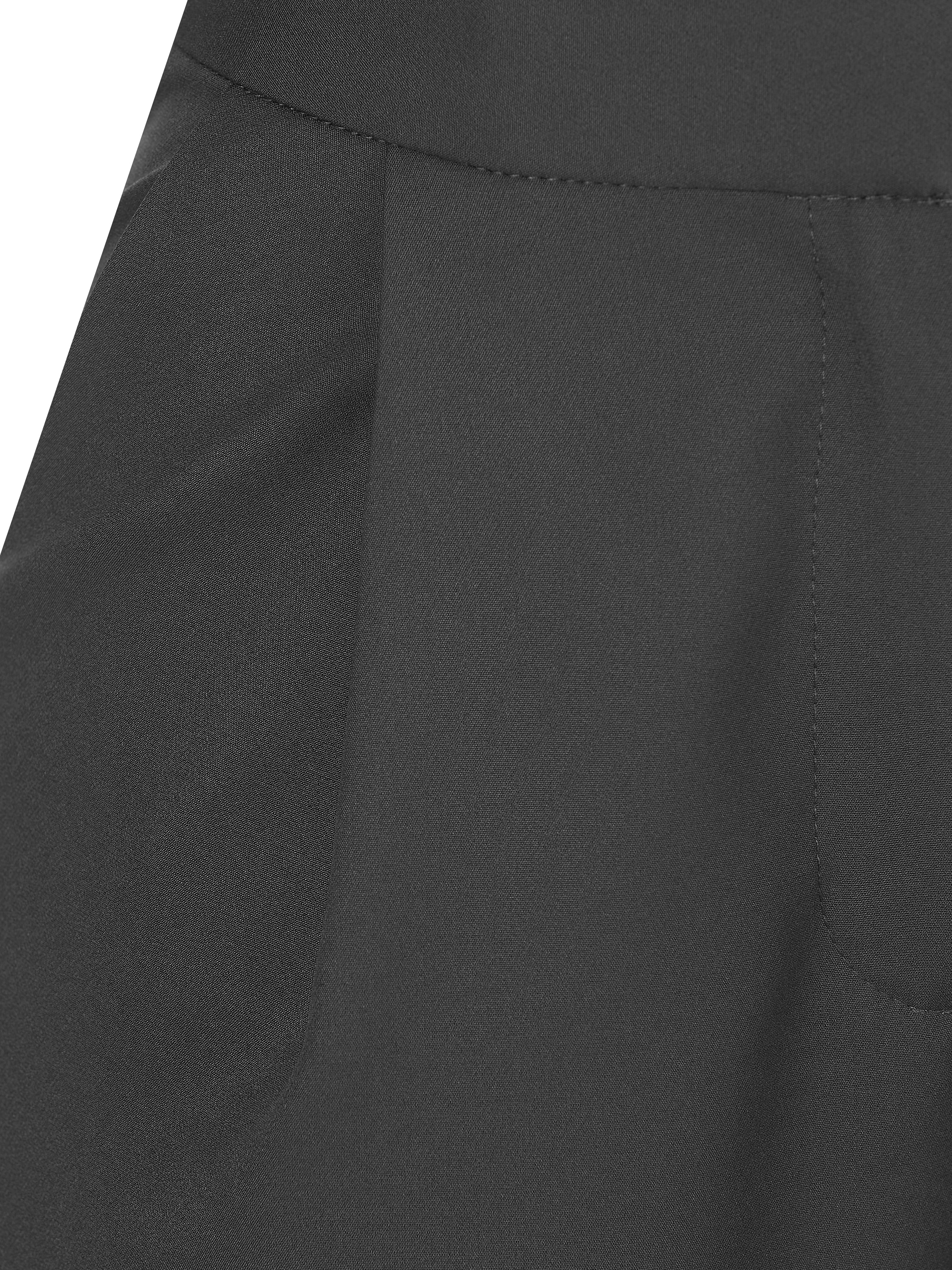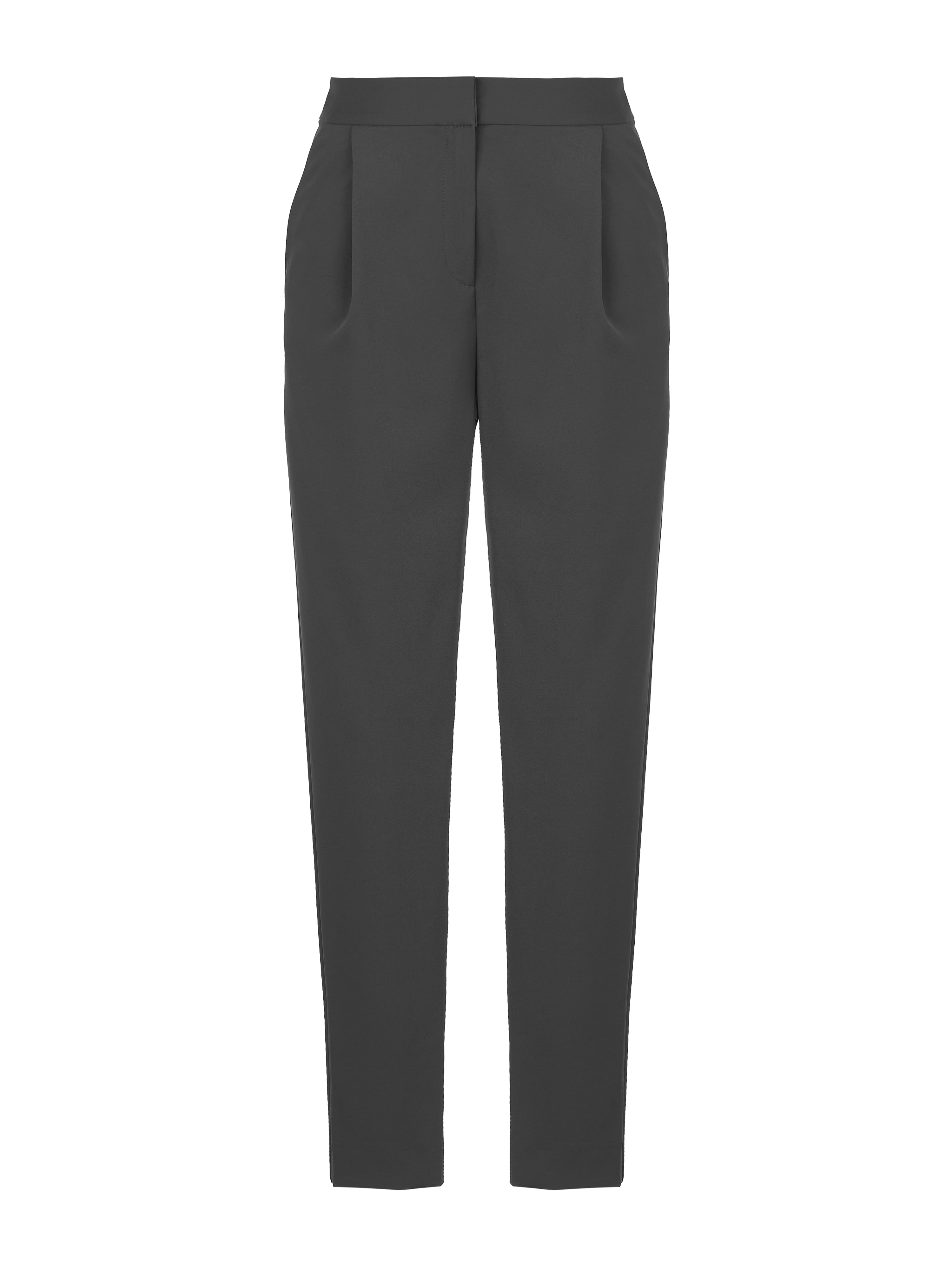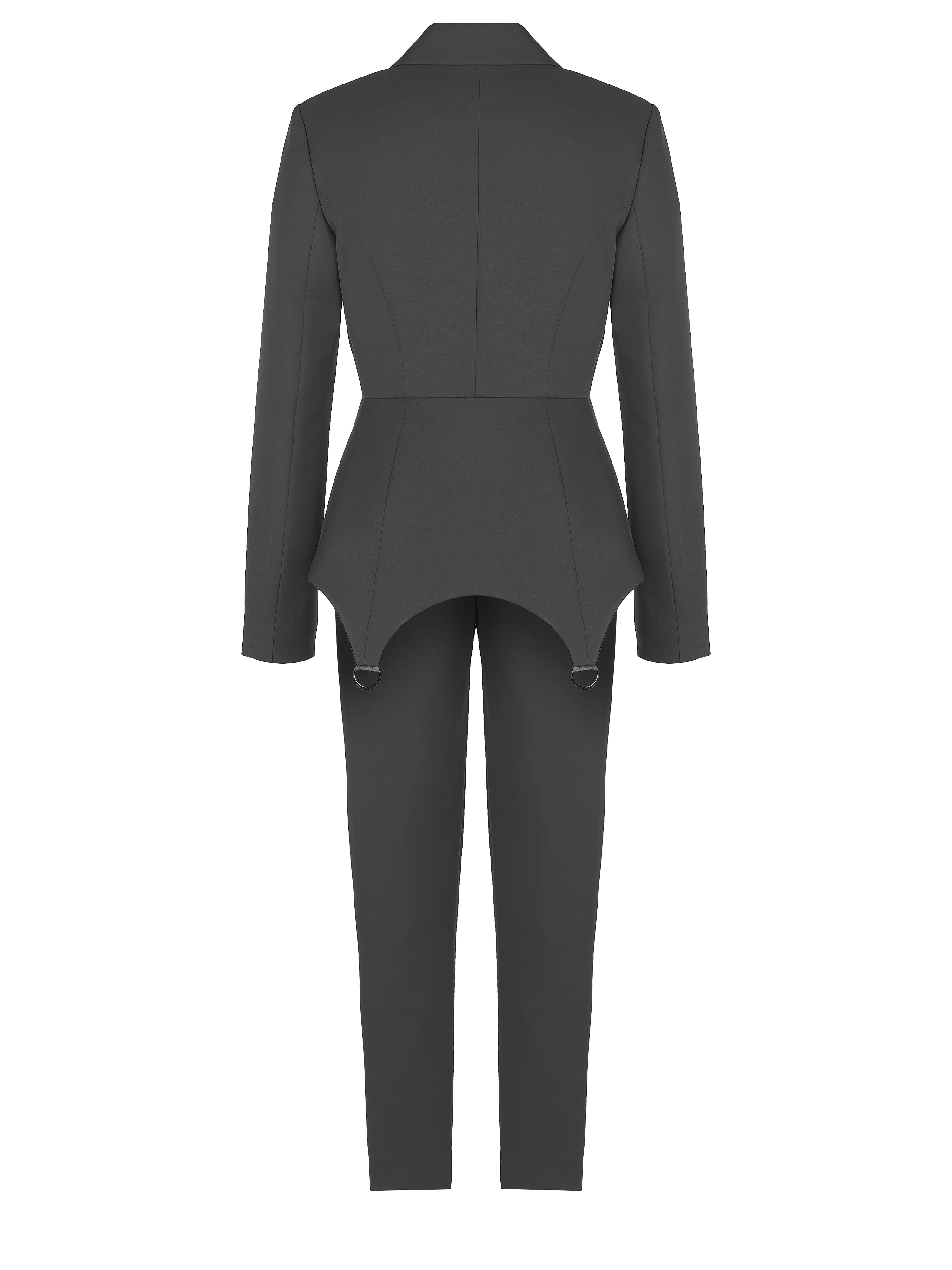 The grey two-piece suit consists of a double-breasted blazer with a shaped hem reminiscent of a garter belt and cropped trousers with side slits. The suit is made of blended viscose.