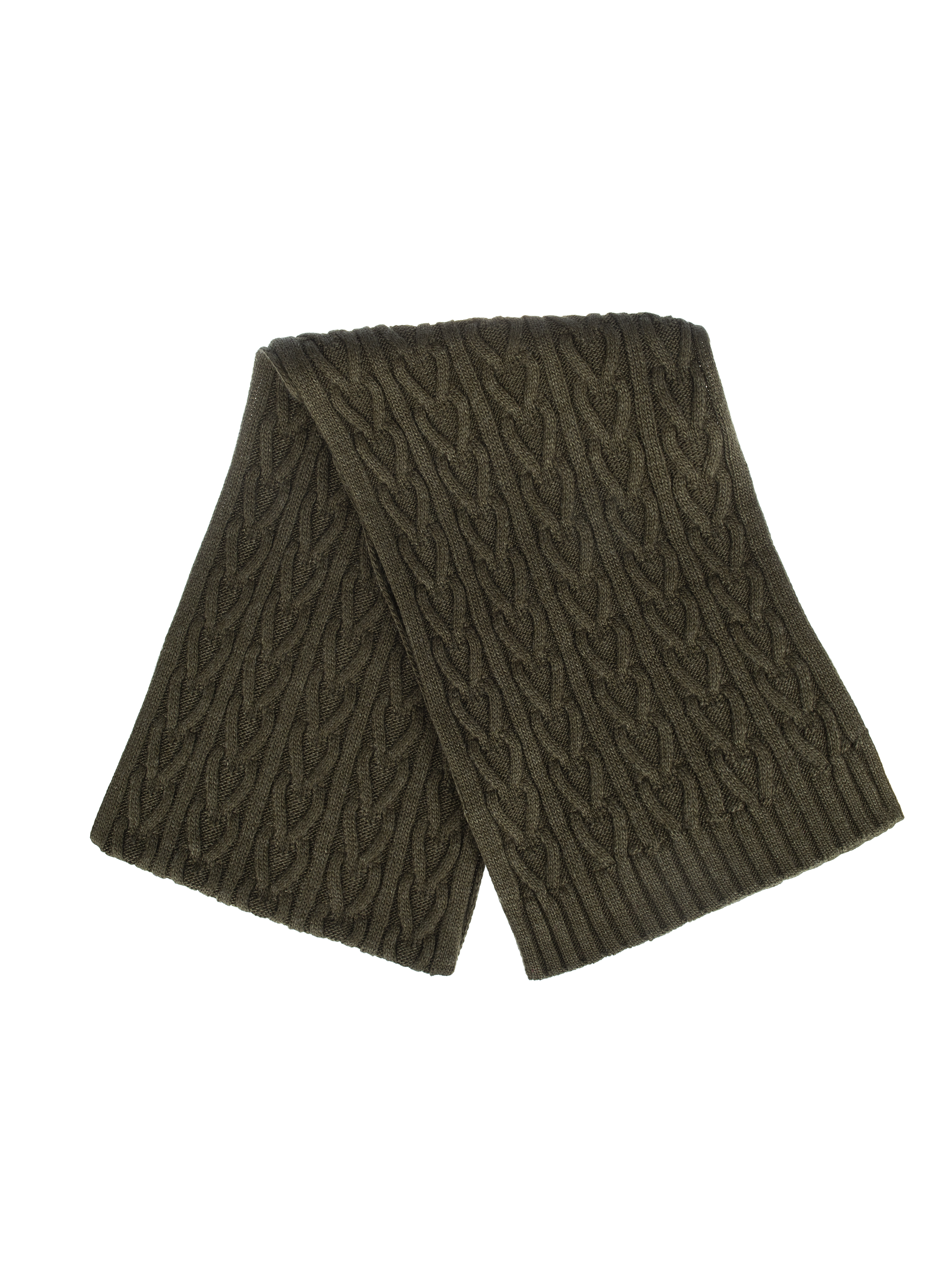 A khaki cable-knit scarf made of blended wool will pair well with all items in the wardrobe and is perfect for knitted pieces from Like Yana. Size: 215 cm x 32 cm.