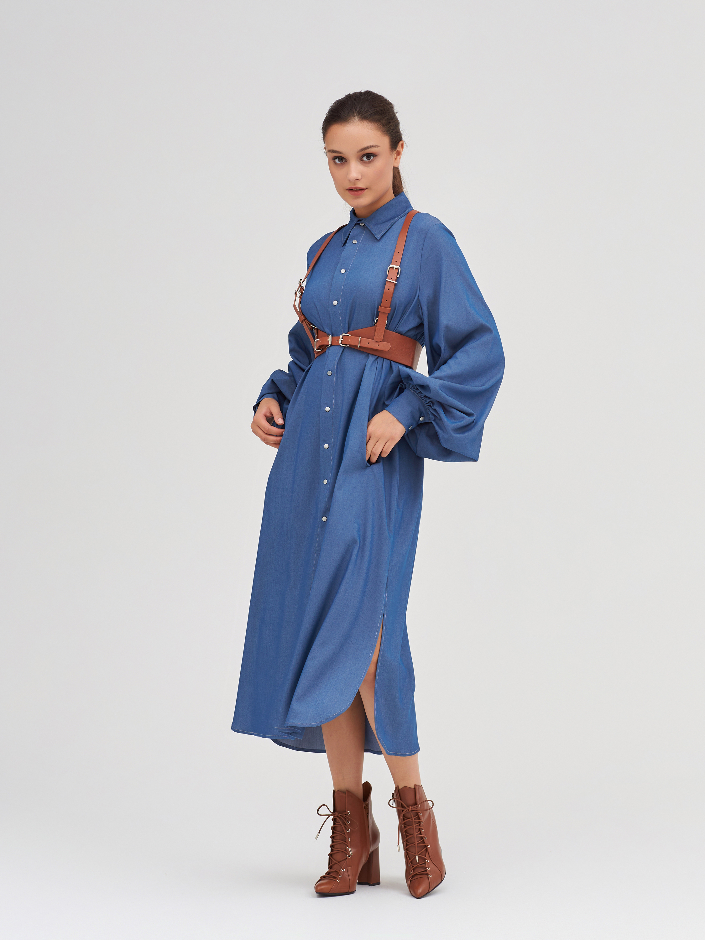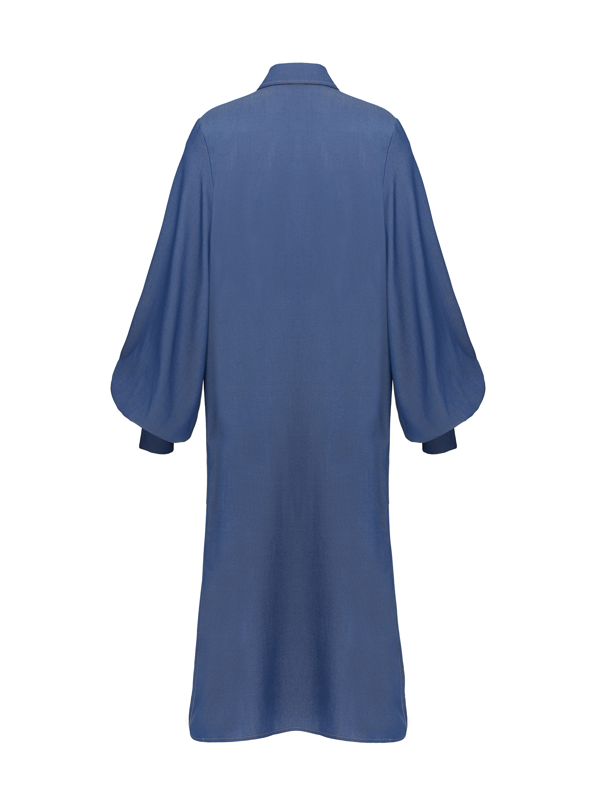 A blue midi-length shirt dress made of cotton turns out both strict and romantic. The key is the voluminous puff sleeves that give the dress an exquisite, aristocratic character. The model is complemented by a turn-down collar and two side welt pockets. Fastens with snap buttons along the entire length.