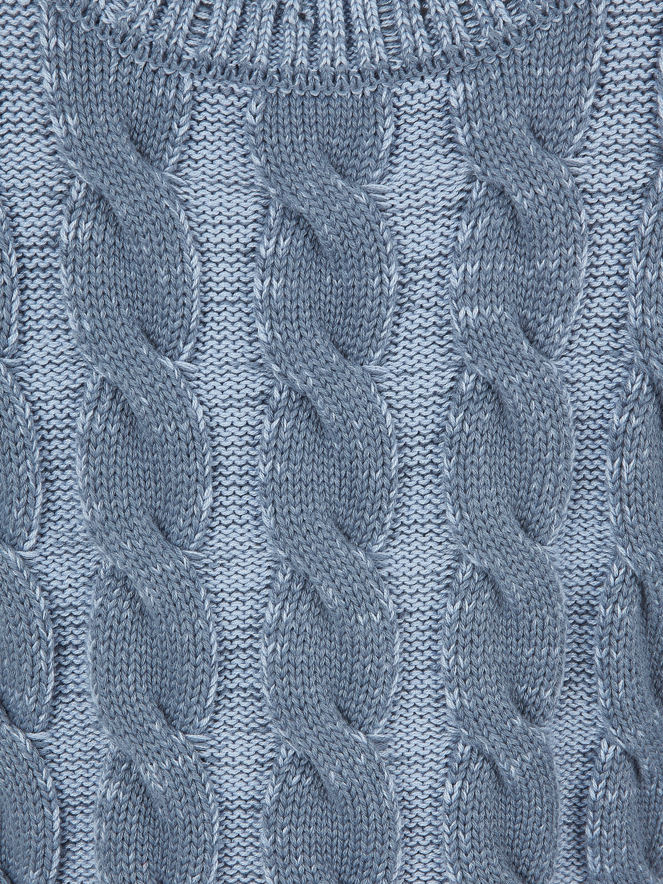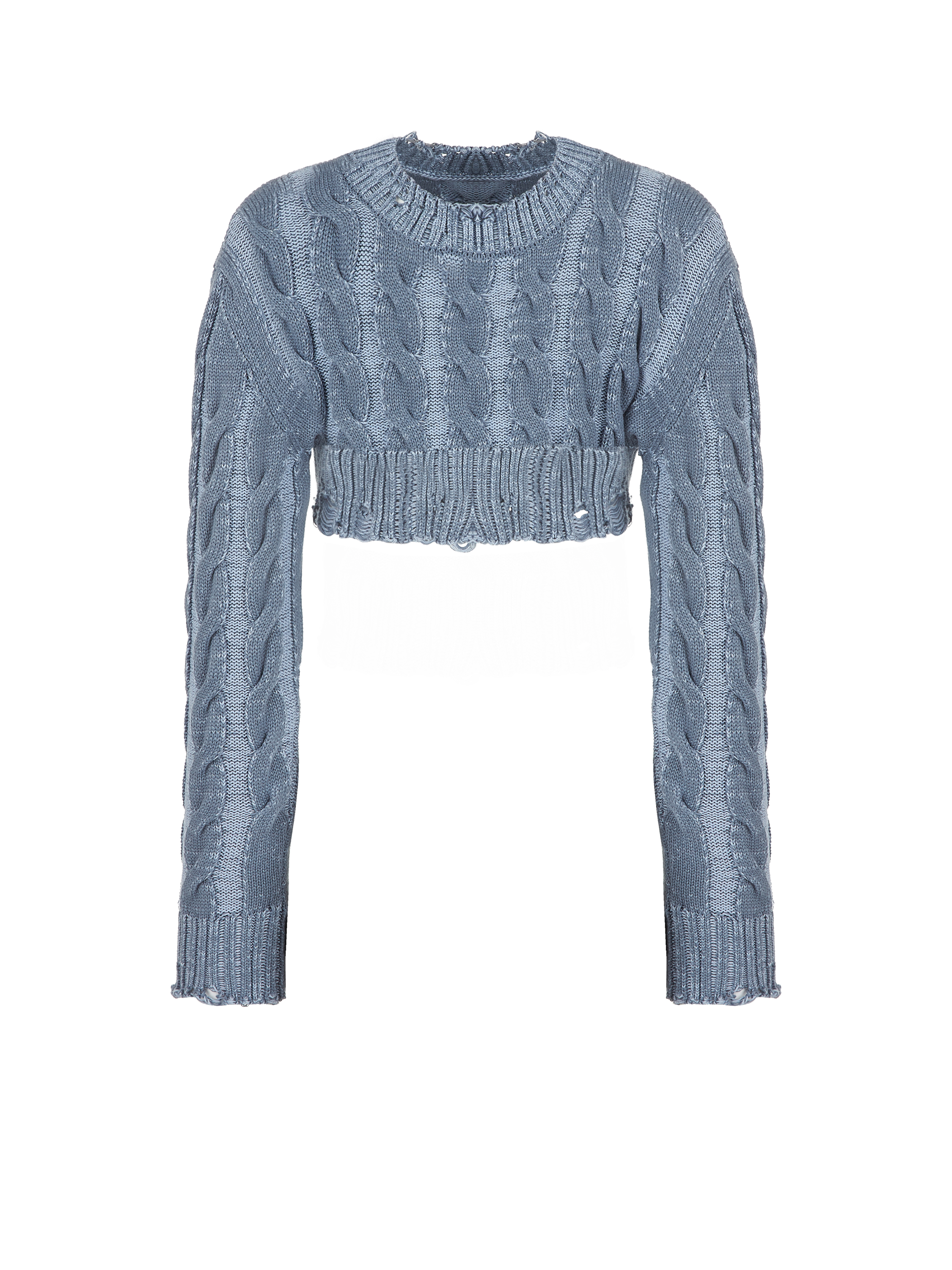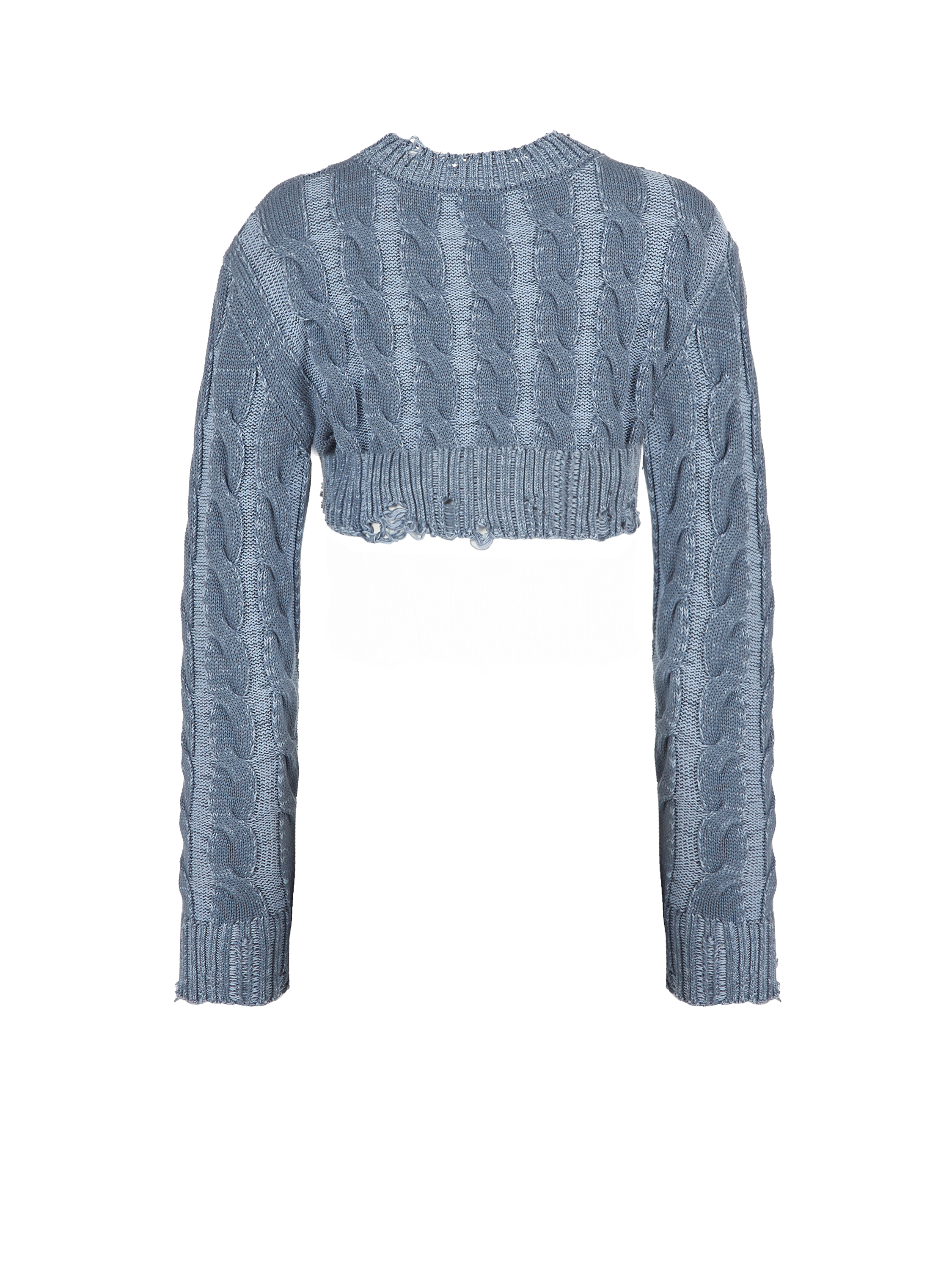 Blue cropped sweater with cables made of a cotton blend. The classic design looks fresh and modern thanks to the use of two shades of yarn and decorative distressing on the neckline, hem and cuffs.