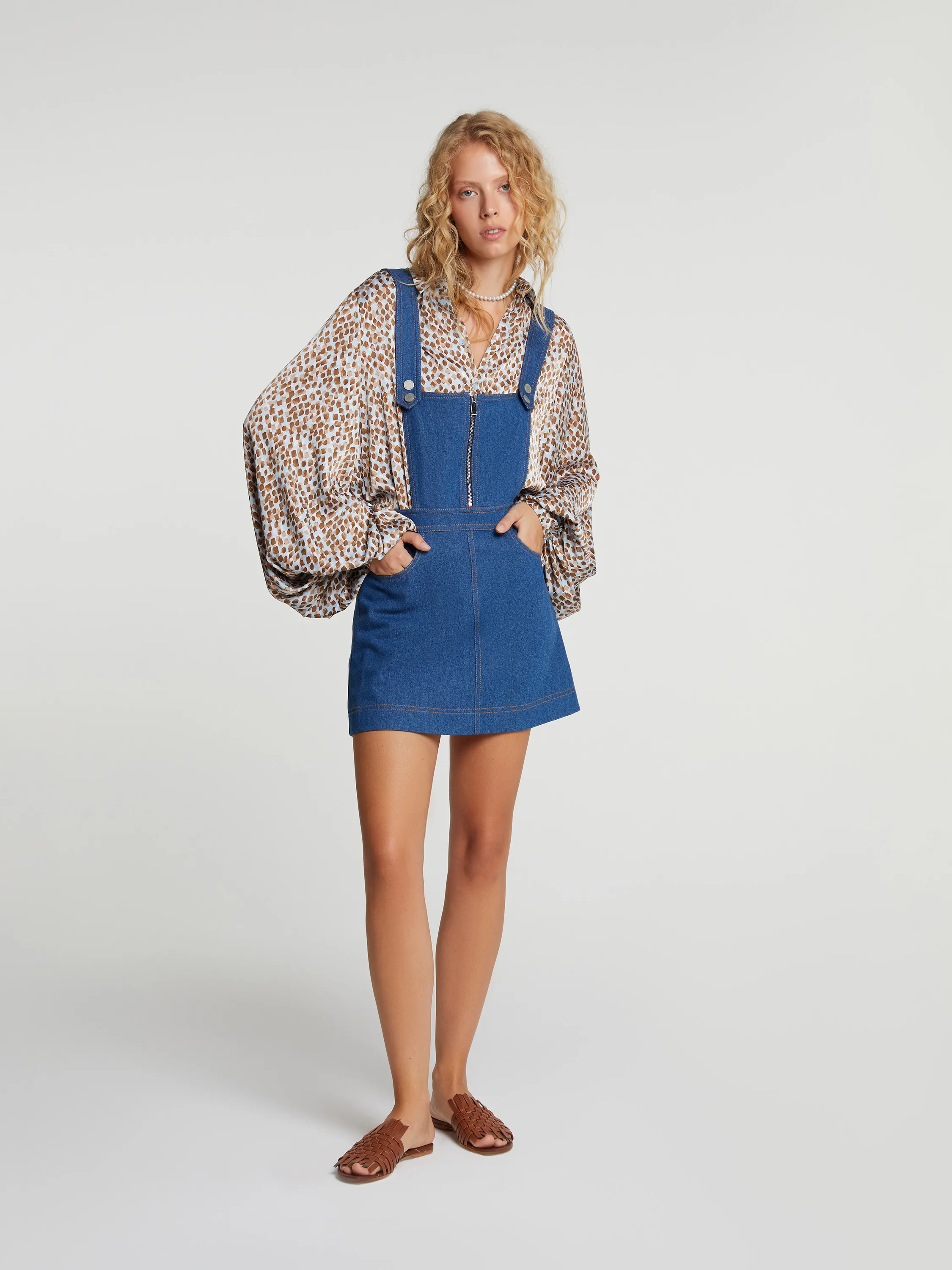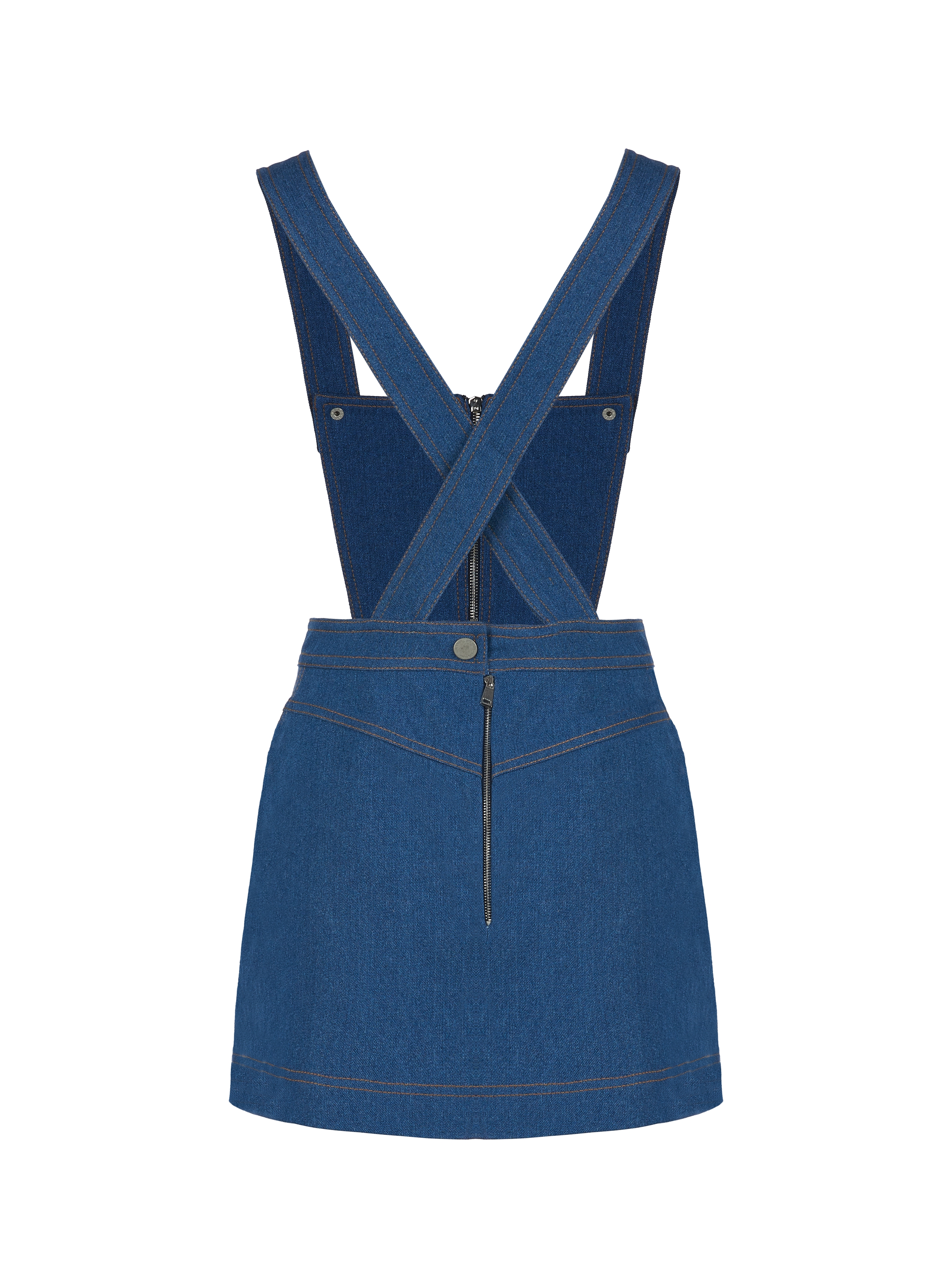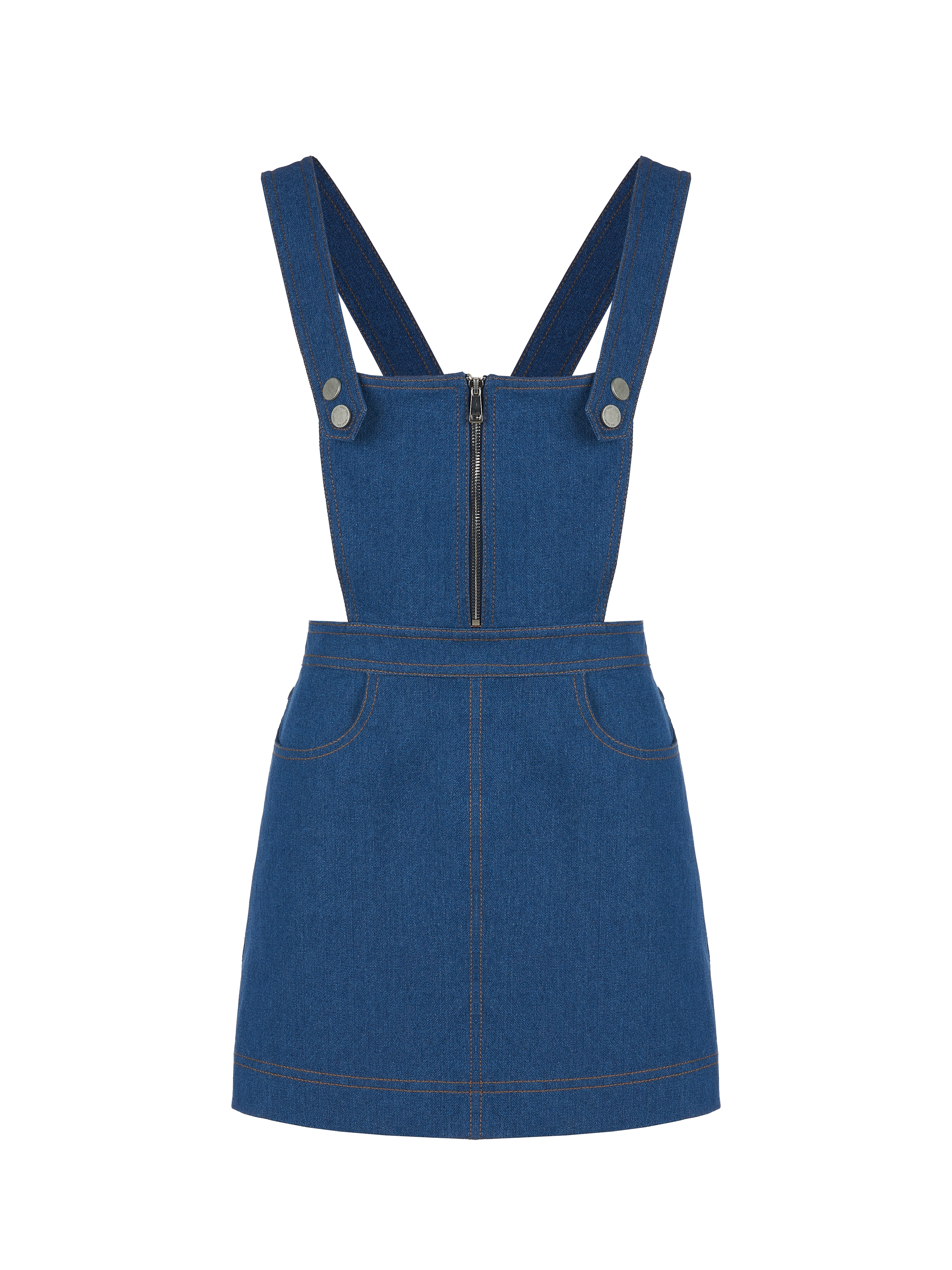 A mini-length sundress with straps is made of blue denim. The model fastens with a zipper at the back, the straps have silver snap buttons, and there is a zipper on the front bodice.