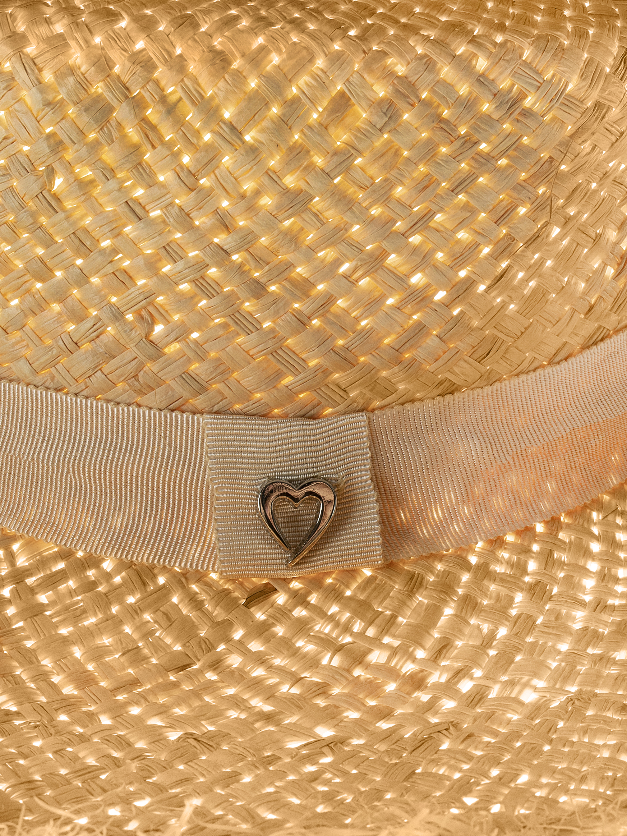 A straw woven hat with a high round crown is decorated with a grosgrain ribbon with a metal buckle in the shape of the Like Yana logo — a golden heart — and “shaggy” brim.