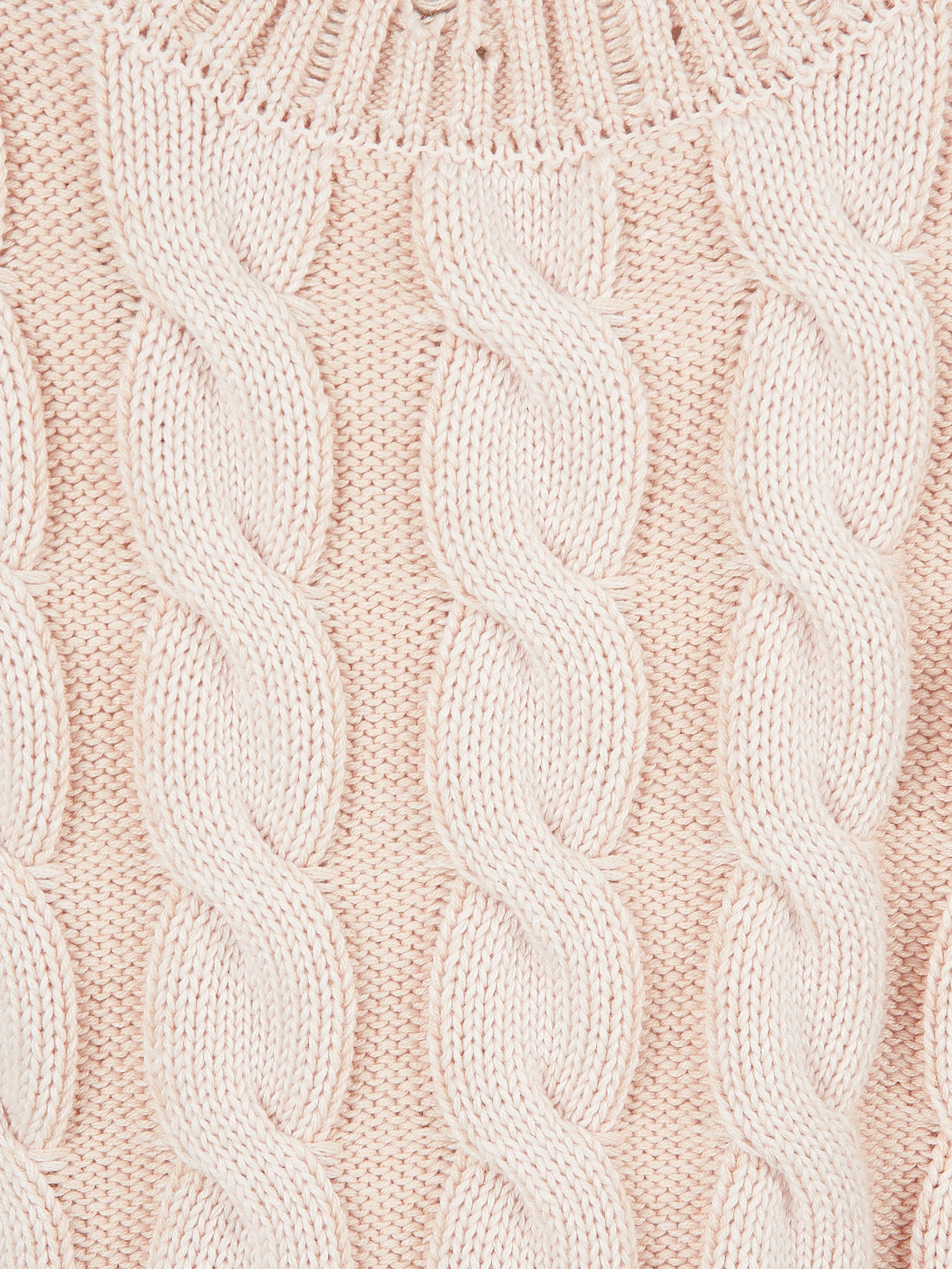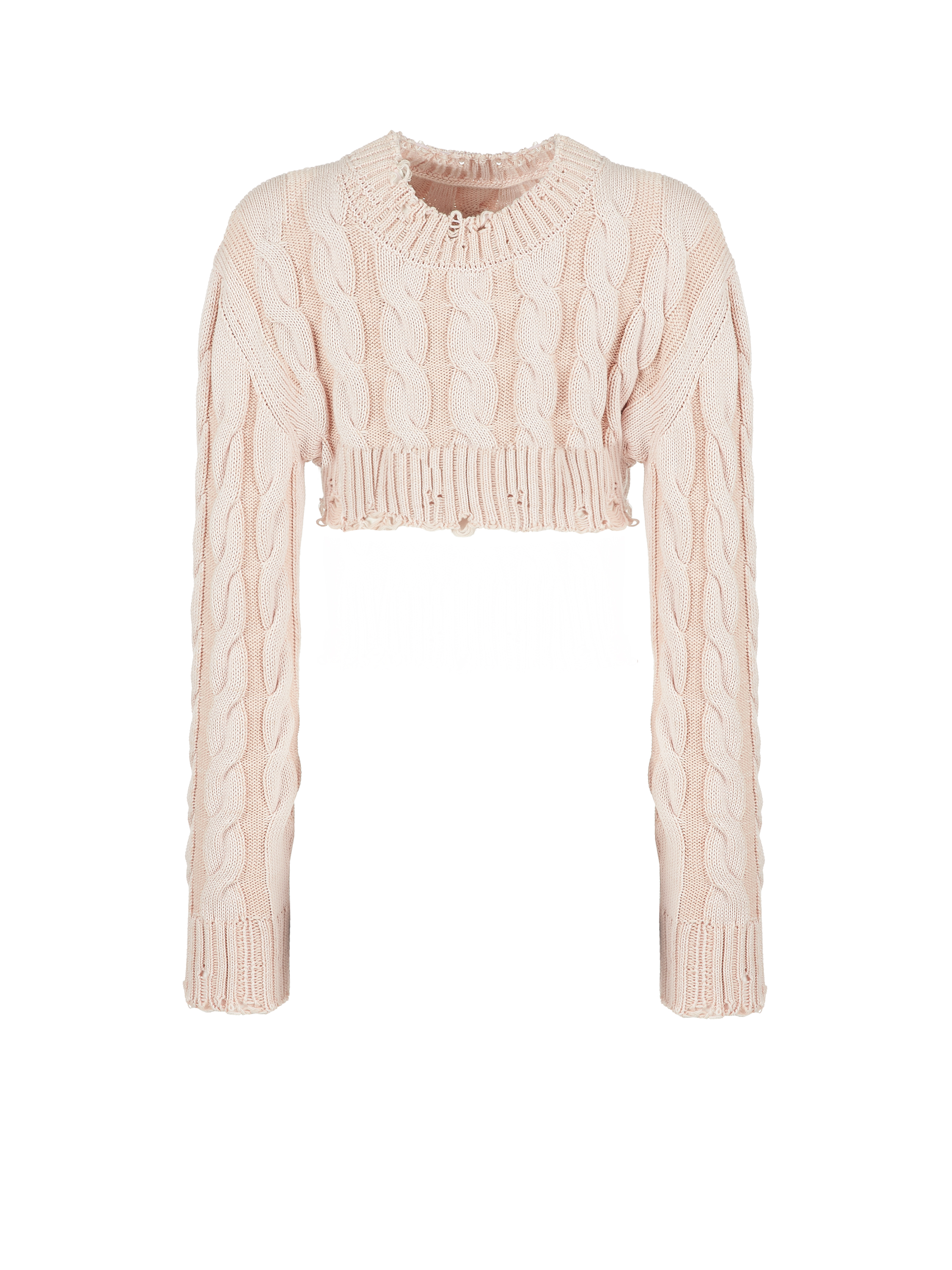 A light pink cable-knit cropped sweater made of cotton blend. The classic design looks fresh and modern thanks to the use of two shades of yarn and decorative rips embellishing the collar, hem and cuffs. Mix with high-waisted jeans or trousers.