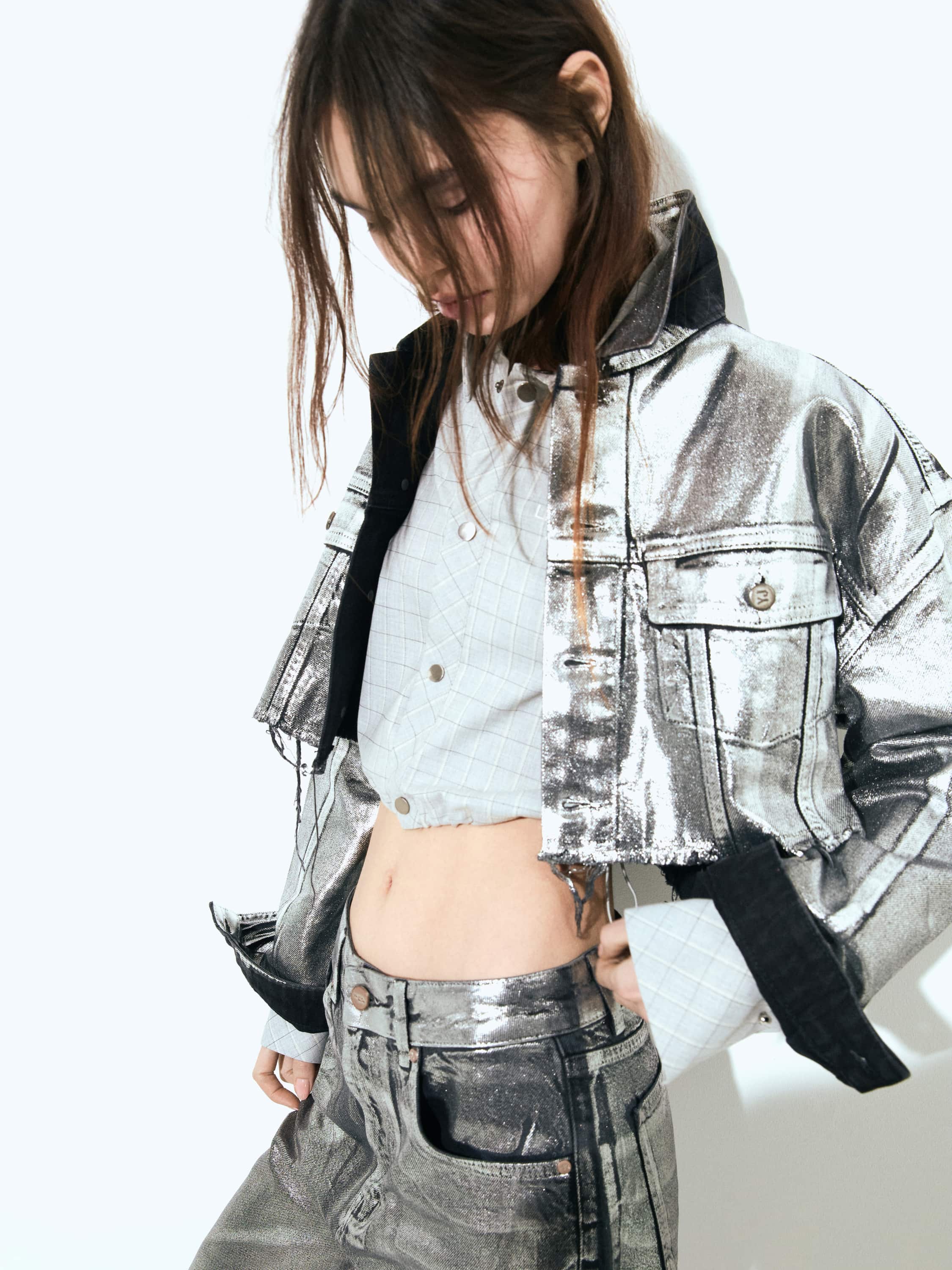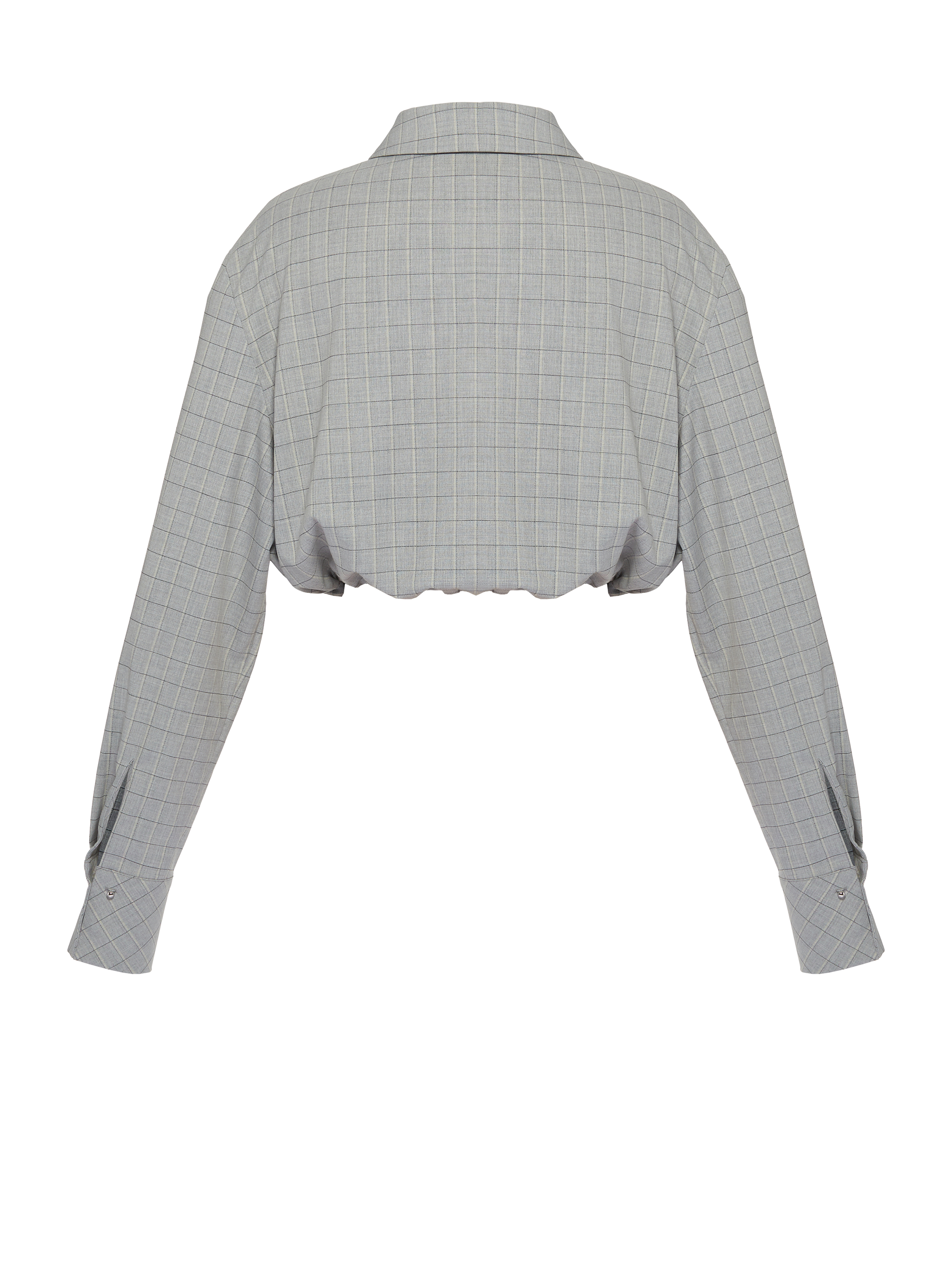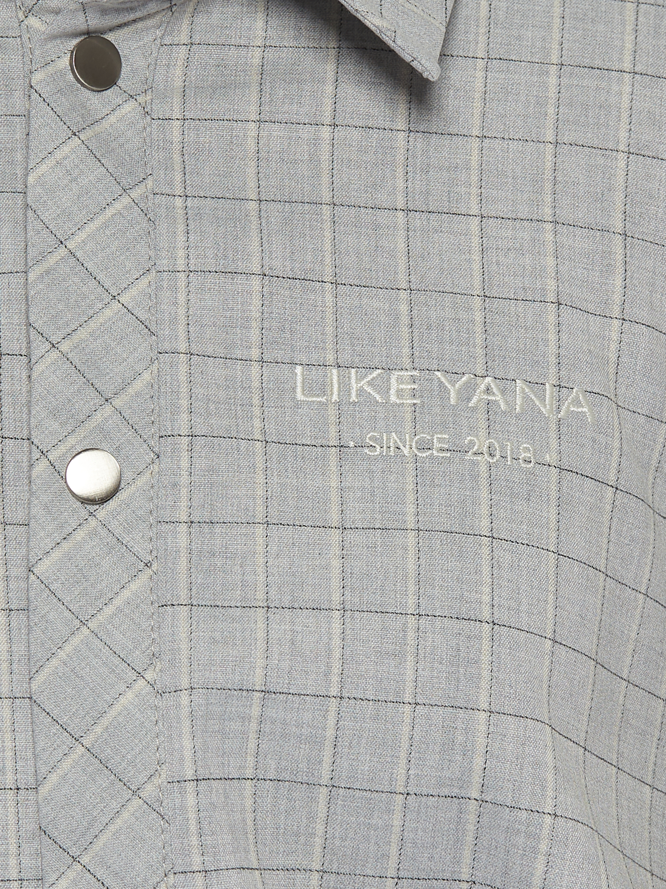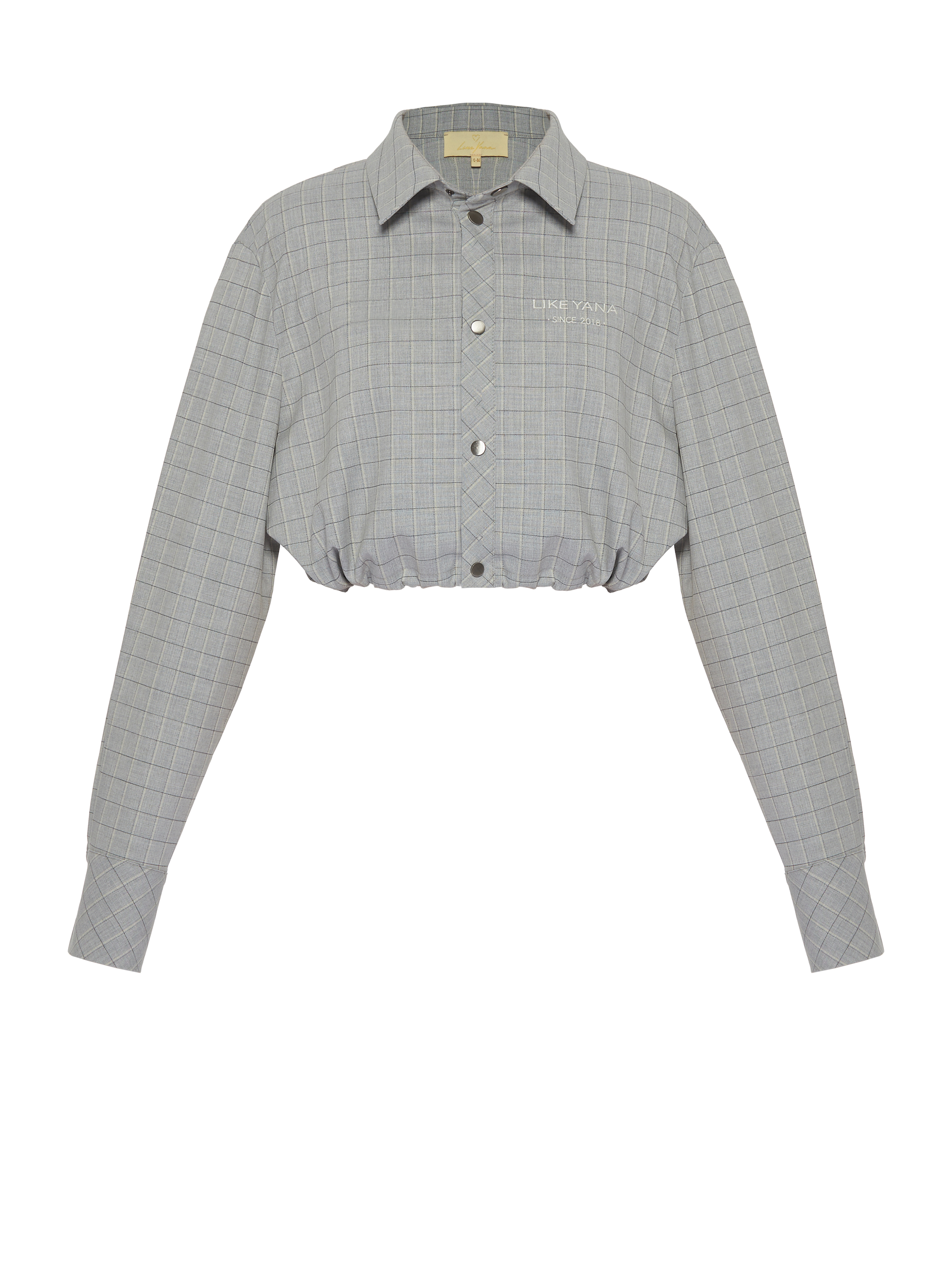 The light gray cropped checkered shirt is made of natural cotton with added elastane. The model is complemented by a drawstring at the hem and Like Yana since 2018 embroidery.