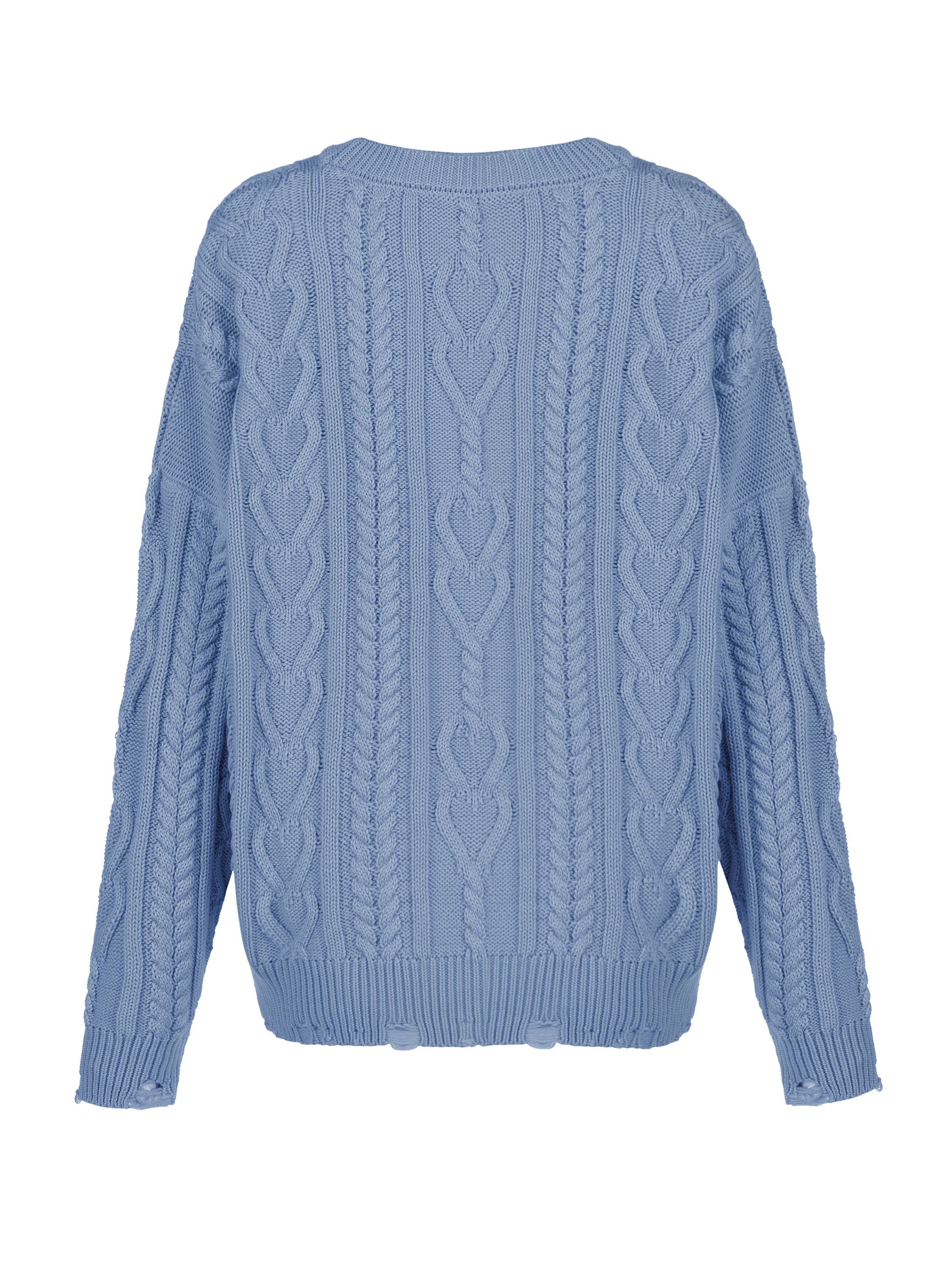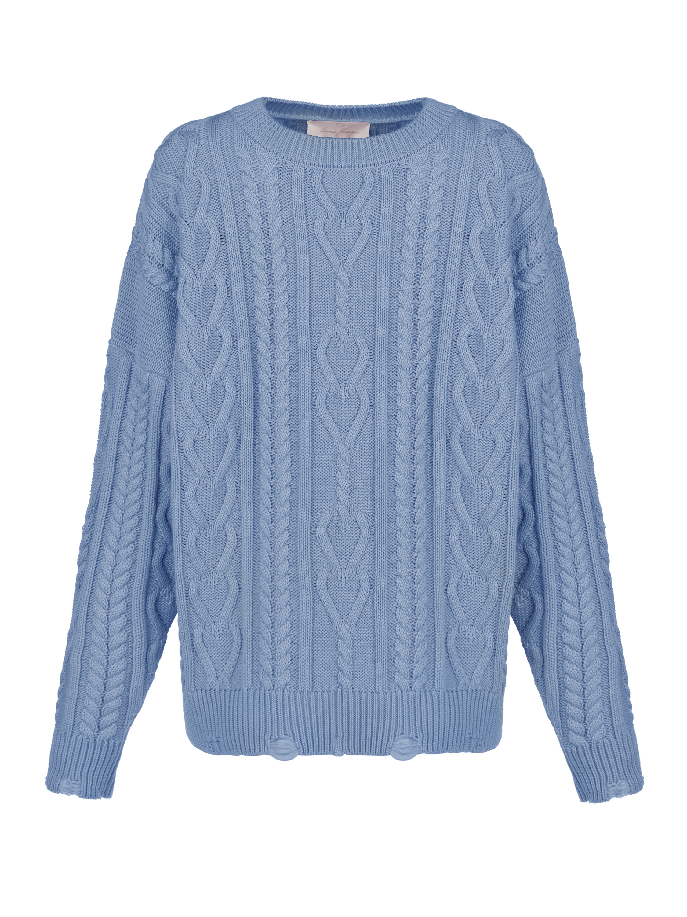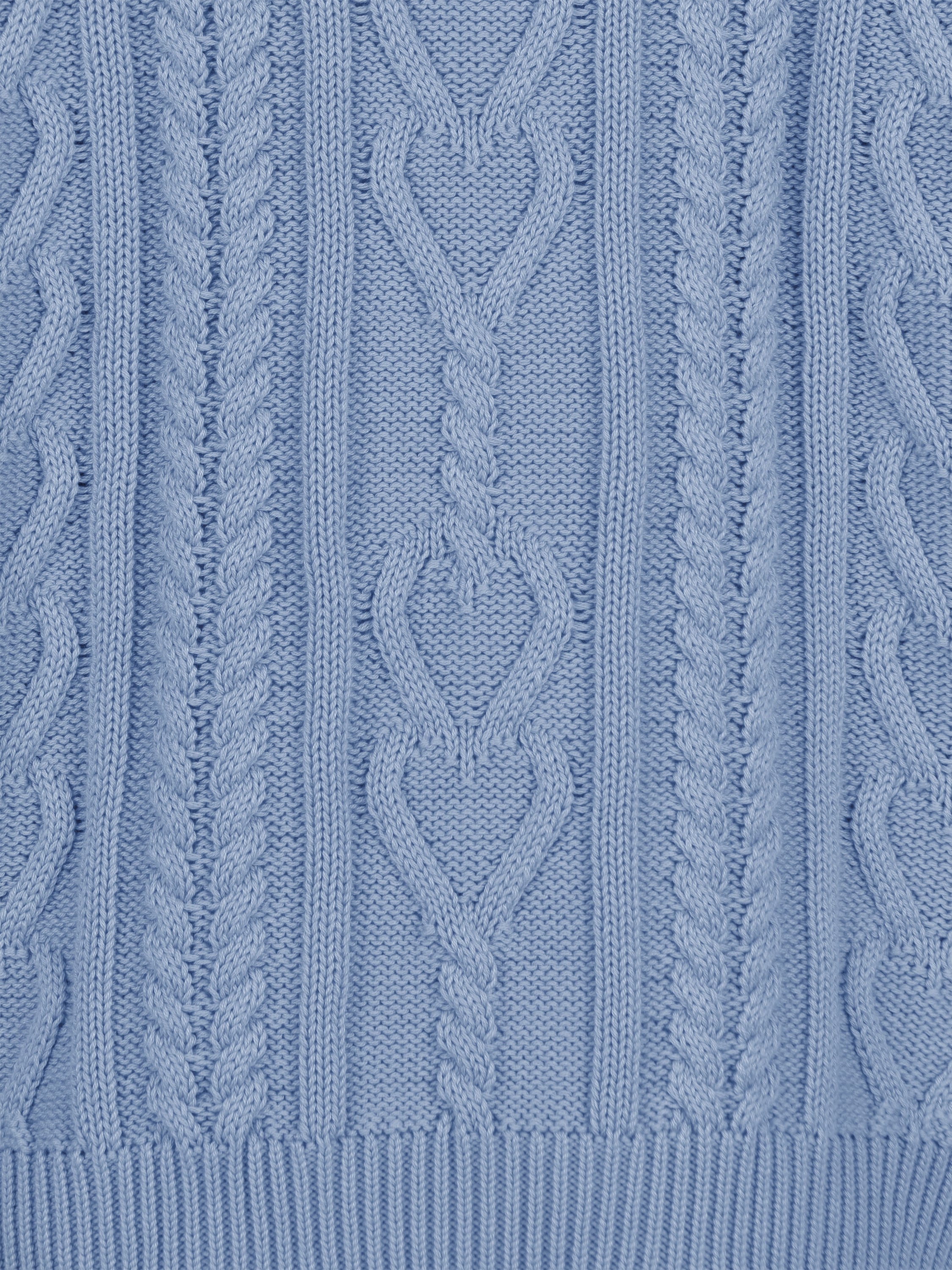 A more voluminous version of our bestseller — the cotton cable-knit sweater. A lightweight unisex light blue sweater made of cotton blend with a cable pattern. The classic design looks fresh and modern thanks to the dropped stitches that decorate the ribbing and cuffs.
