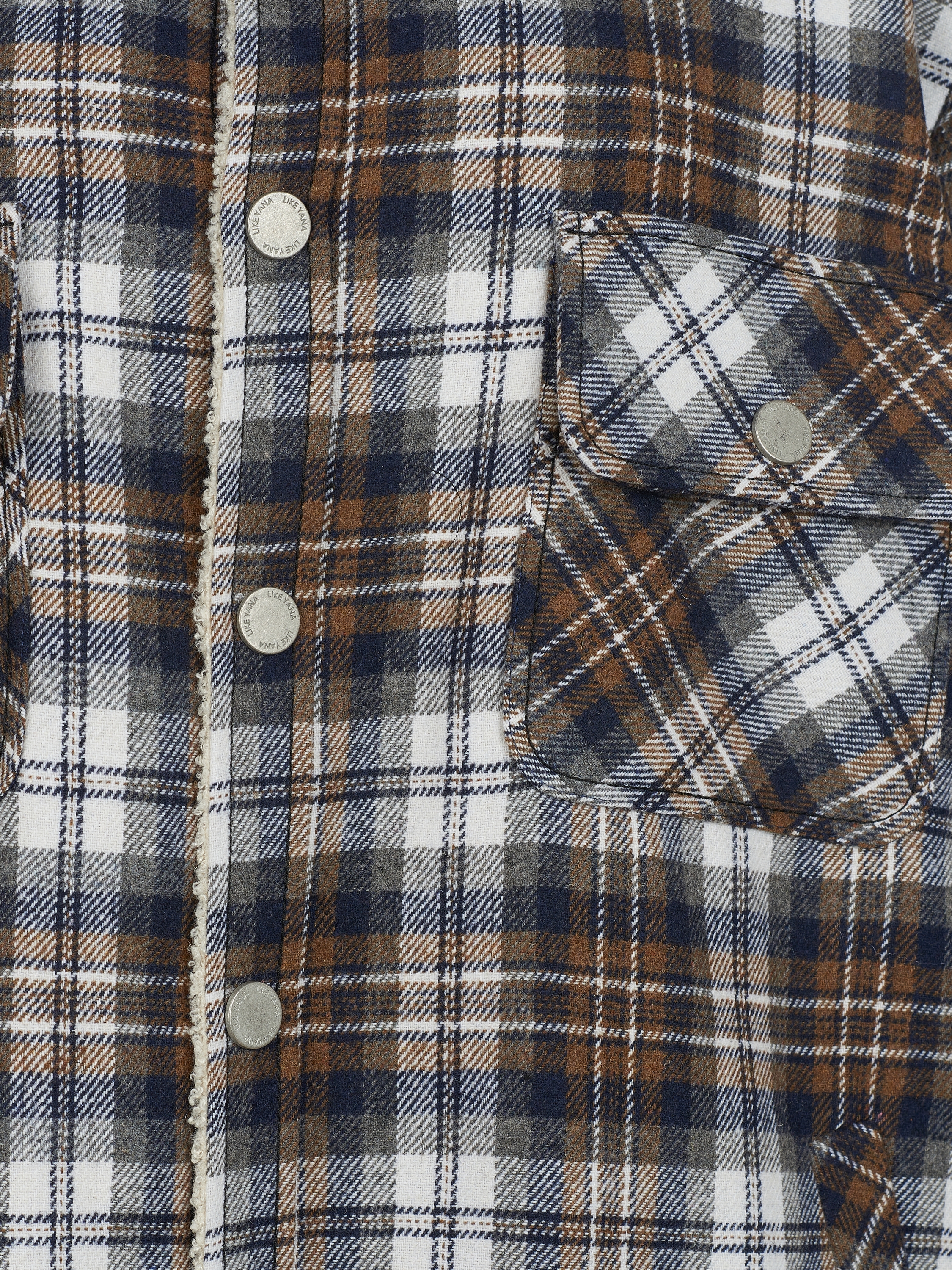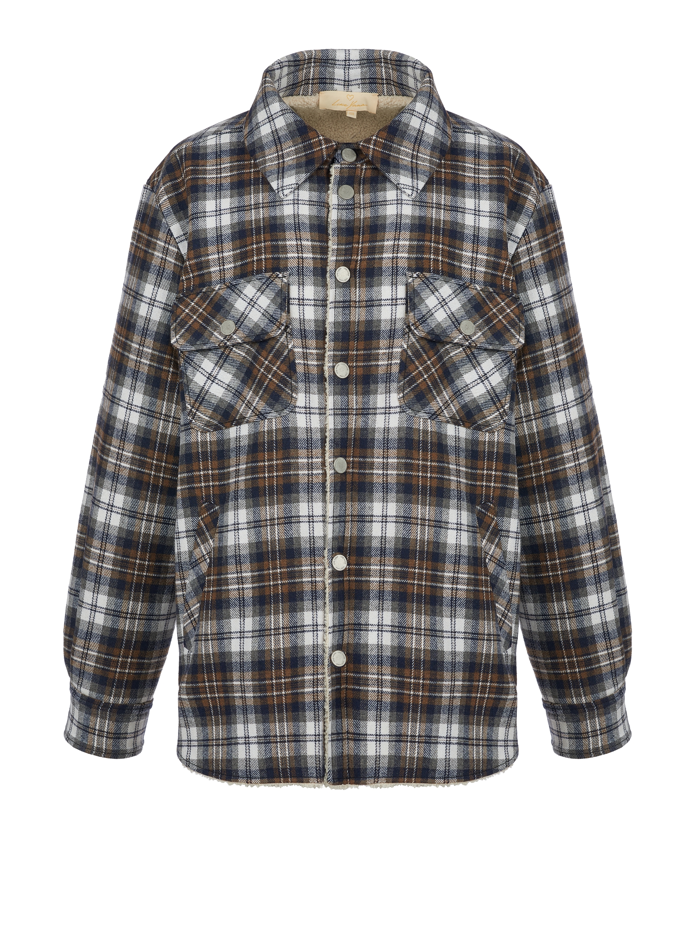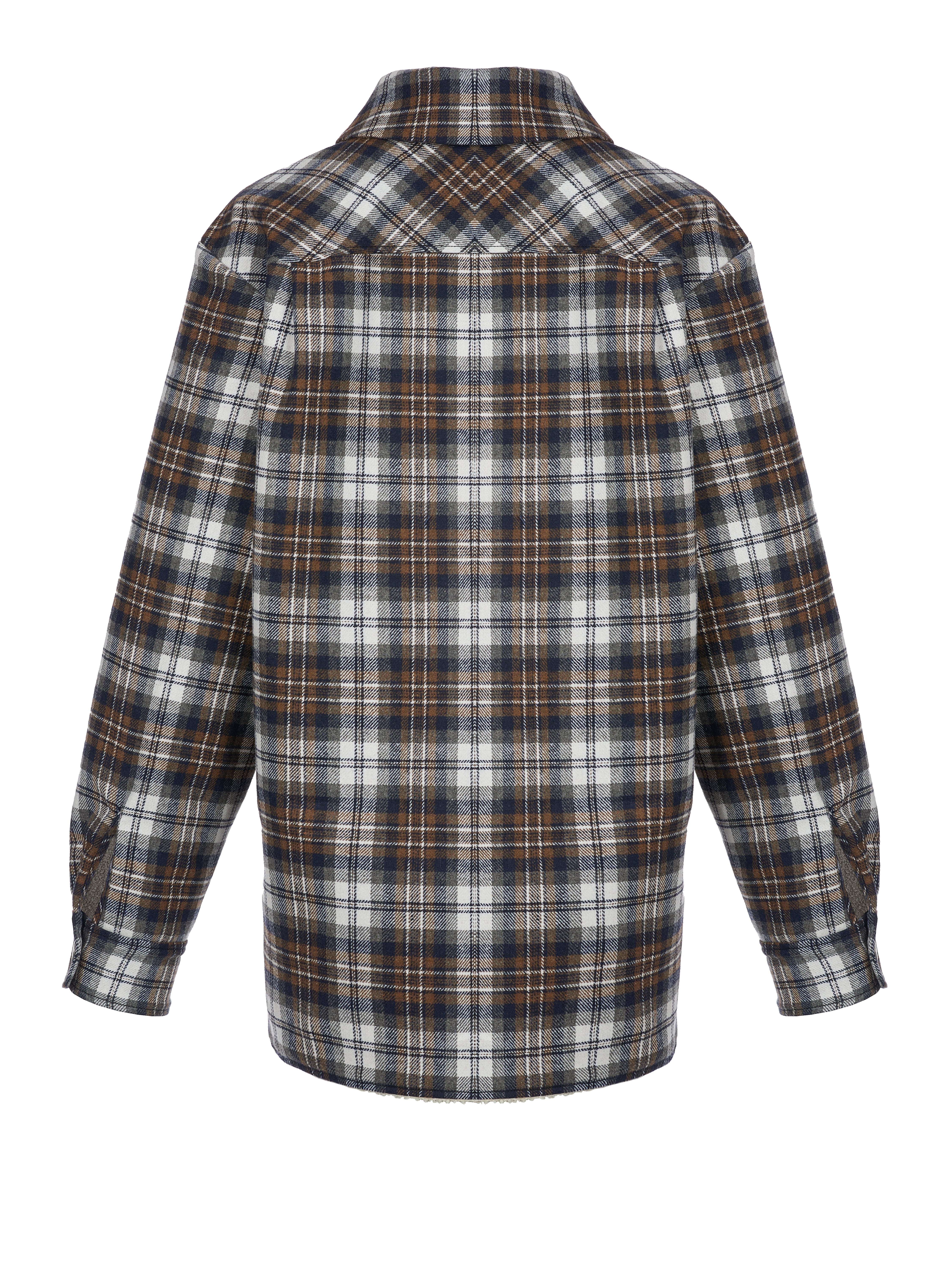 A brown and blue checked shirt is made of wool blend and complemented with a light faux-fur lining. The shirt fastens with snaps at the front and is finished with two patch pockets.