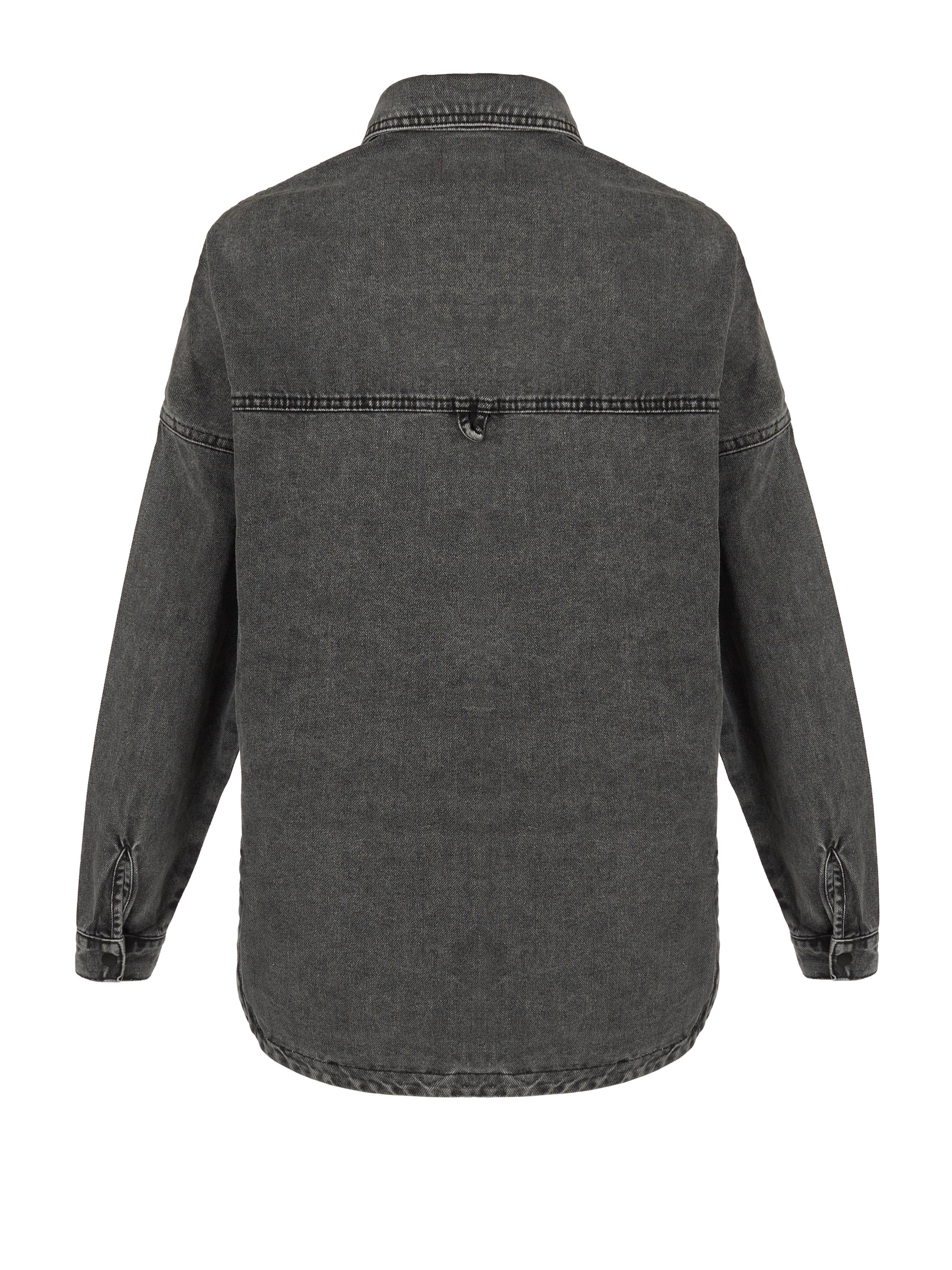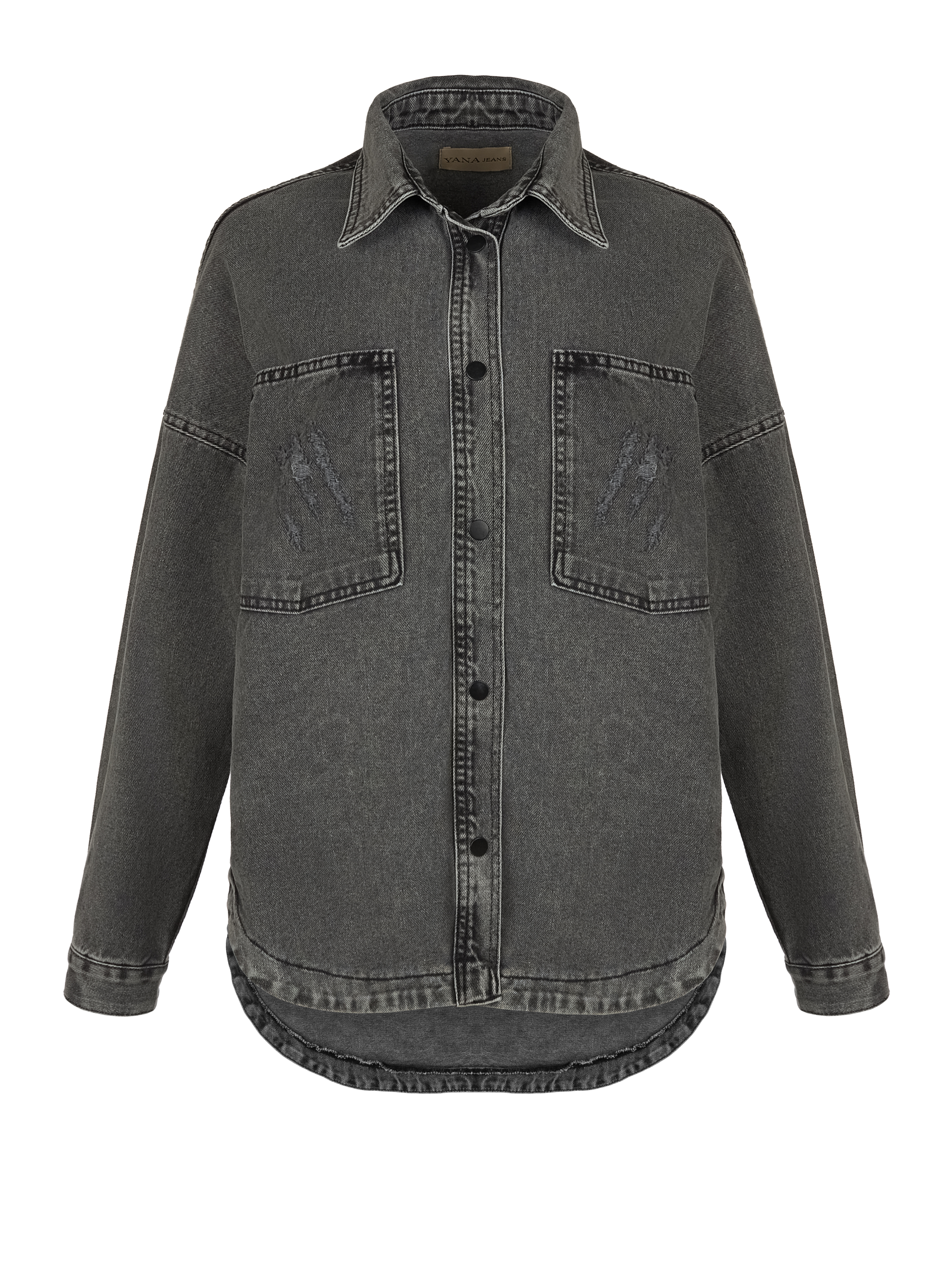 A dark gray shirt made of denim with decorative fading. The model is complemented by two patch chest pockets. Snap-button closure at the front.