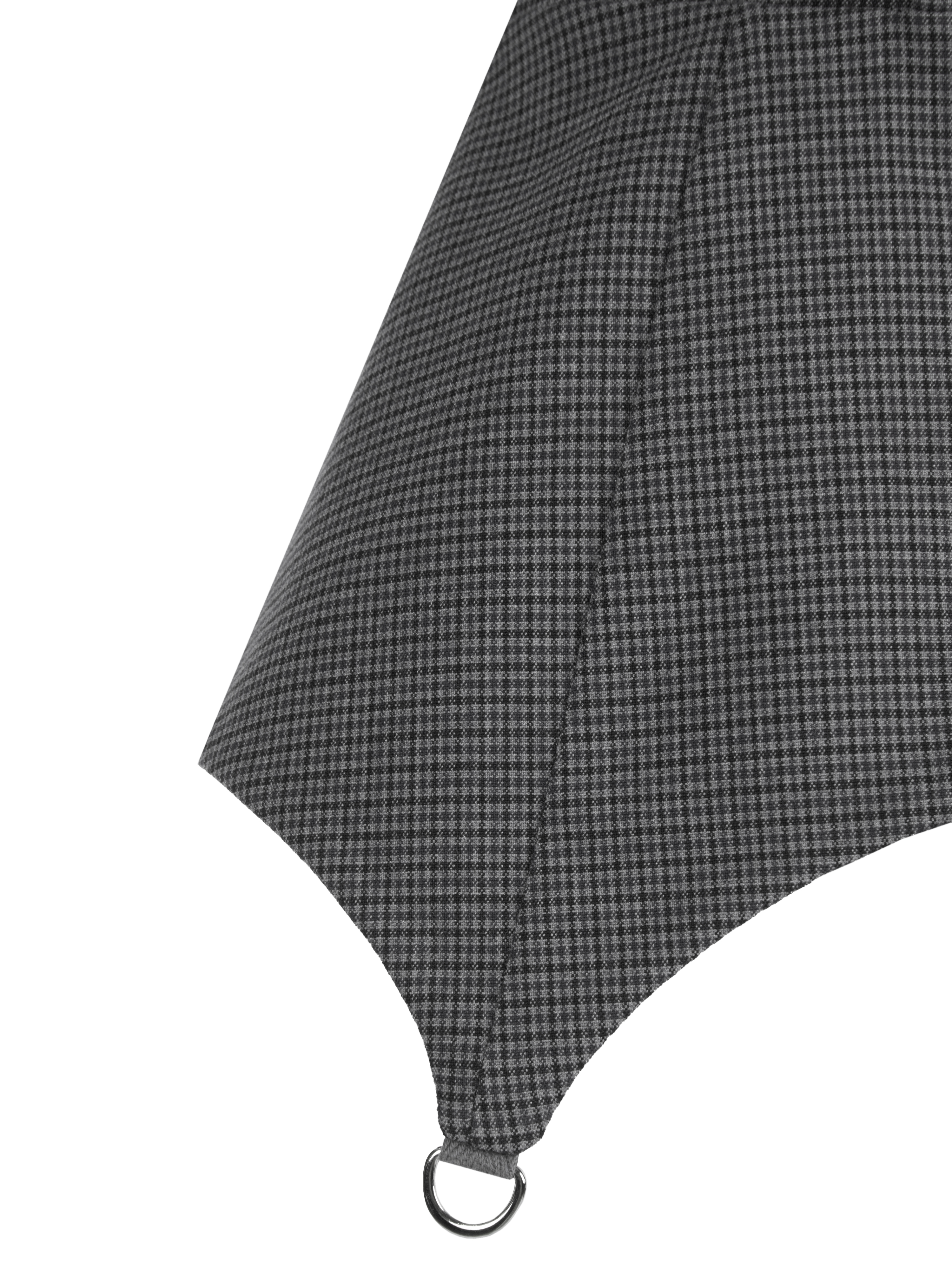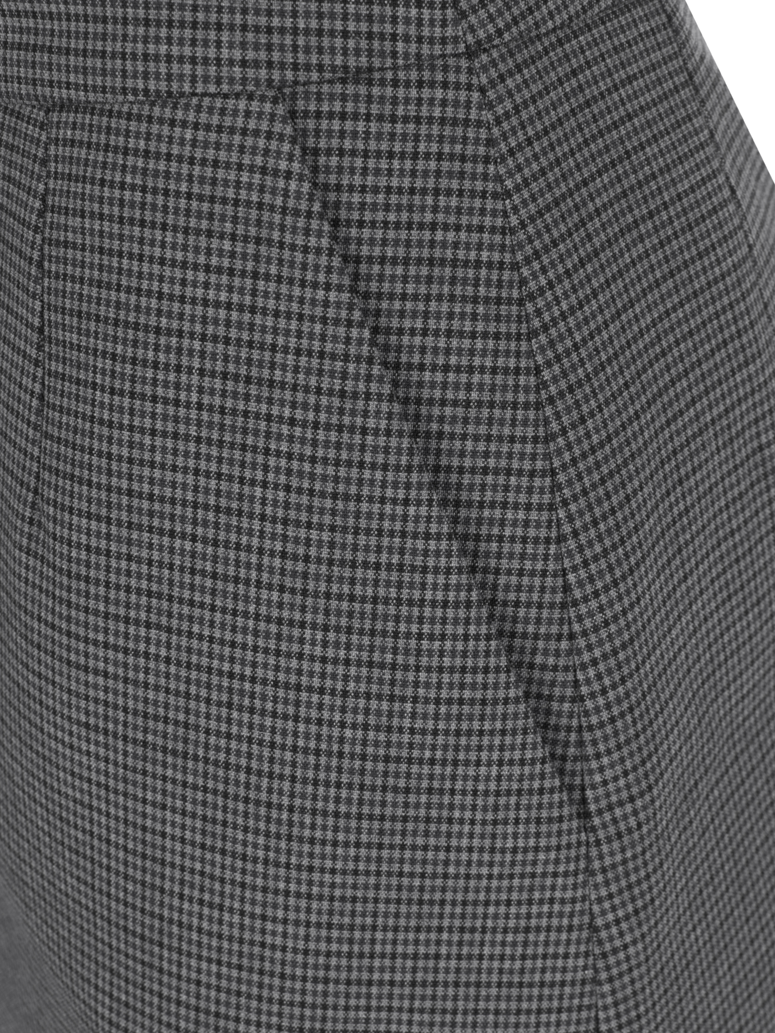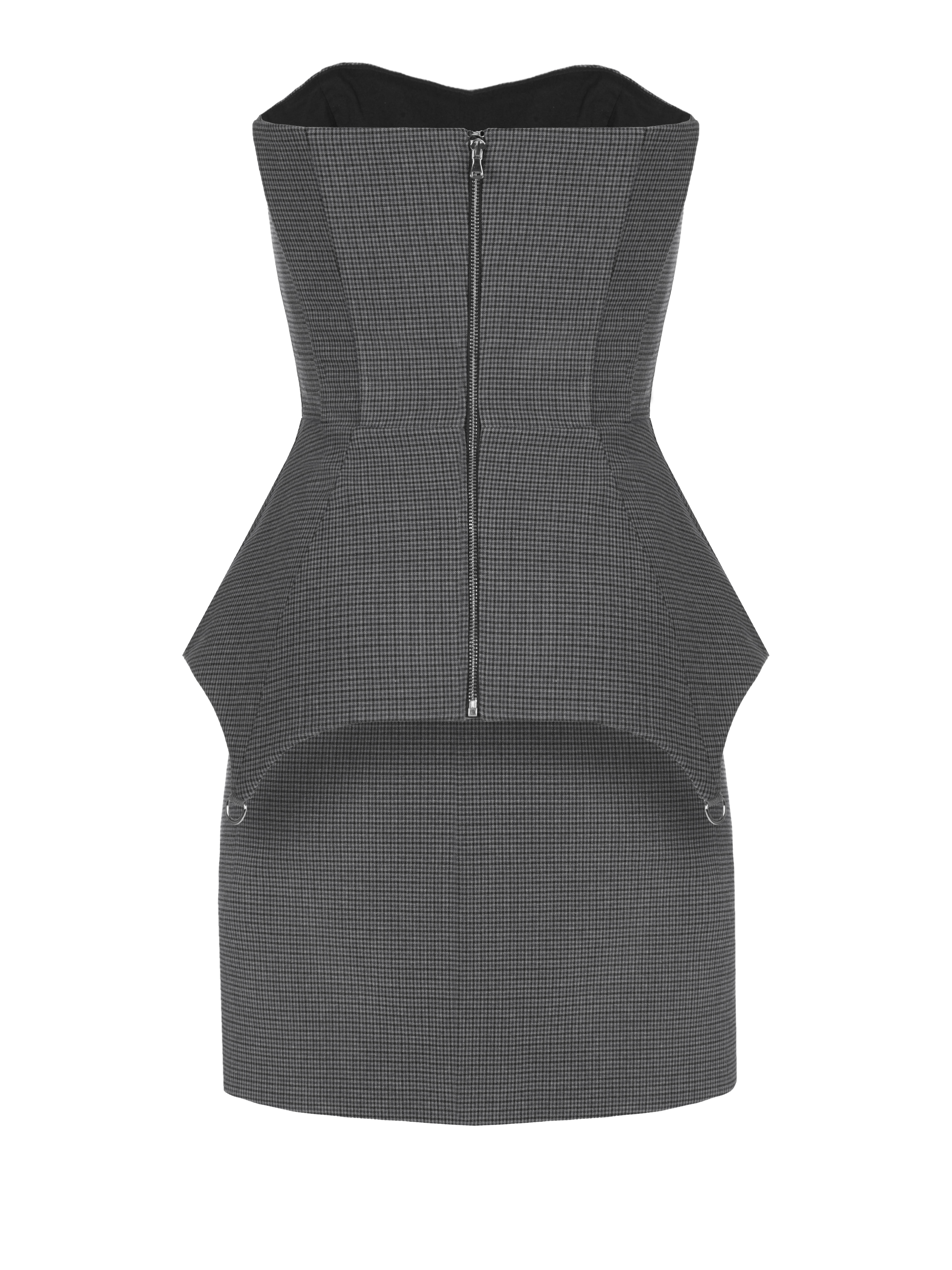 The gray checkered set consists of a peplum corset top and a high-rise mini skirt with a front slit. Pair it with a white blouse for the office, and in the evening swap the blouse for statement jewelry and you are ready for a party.