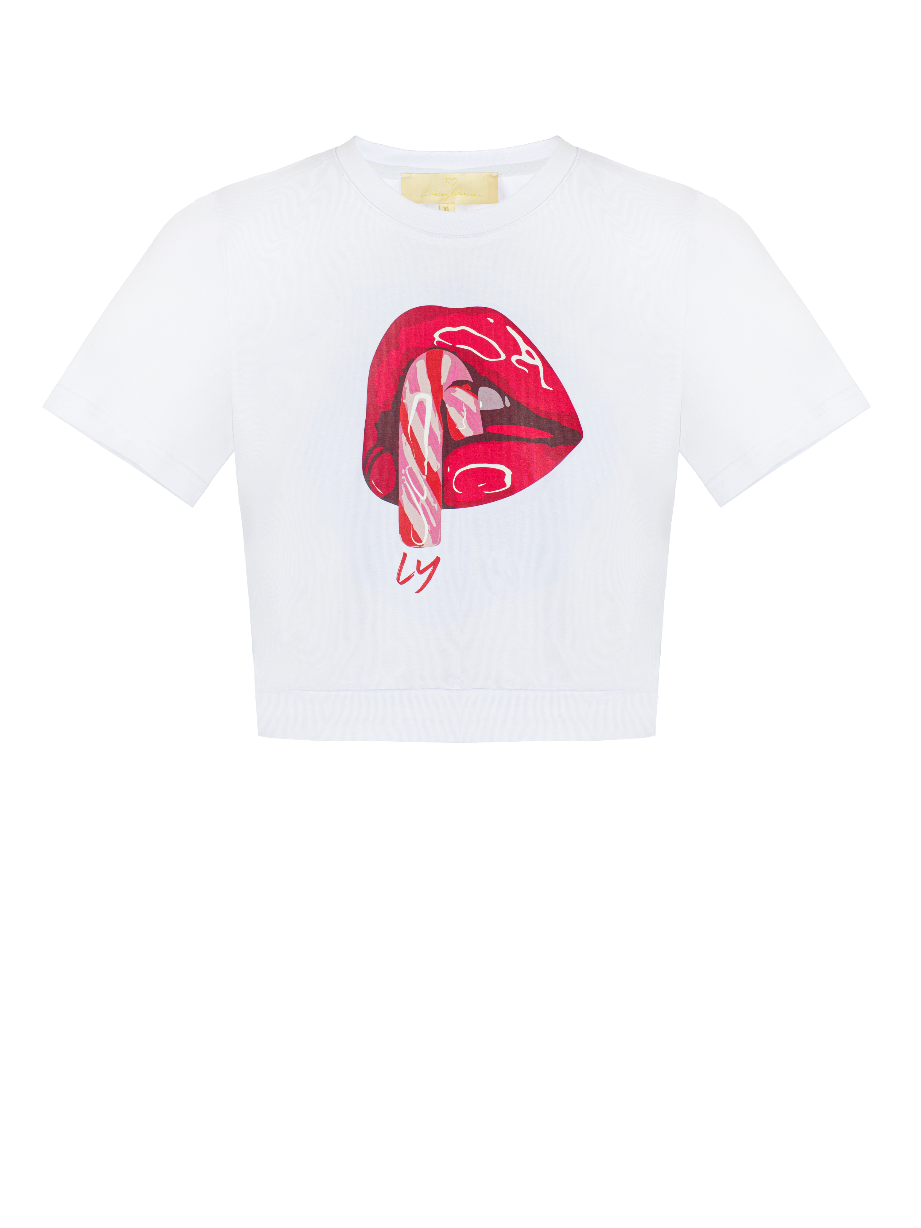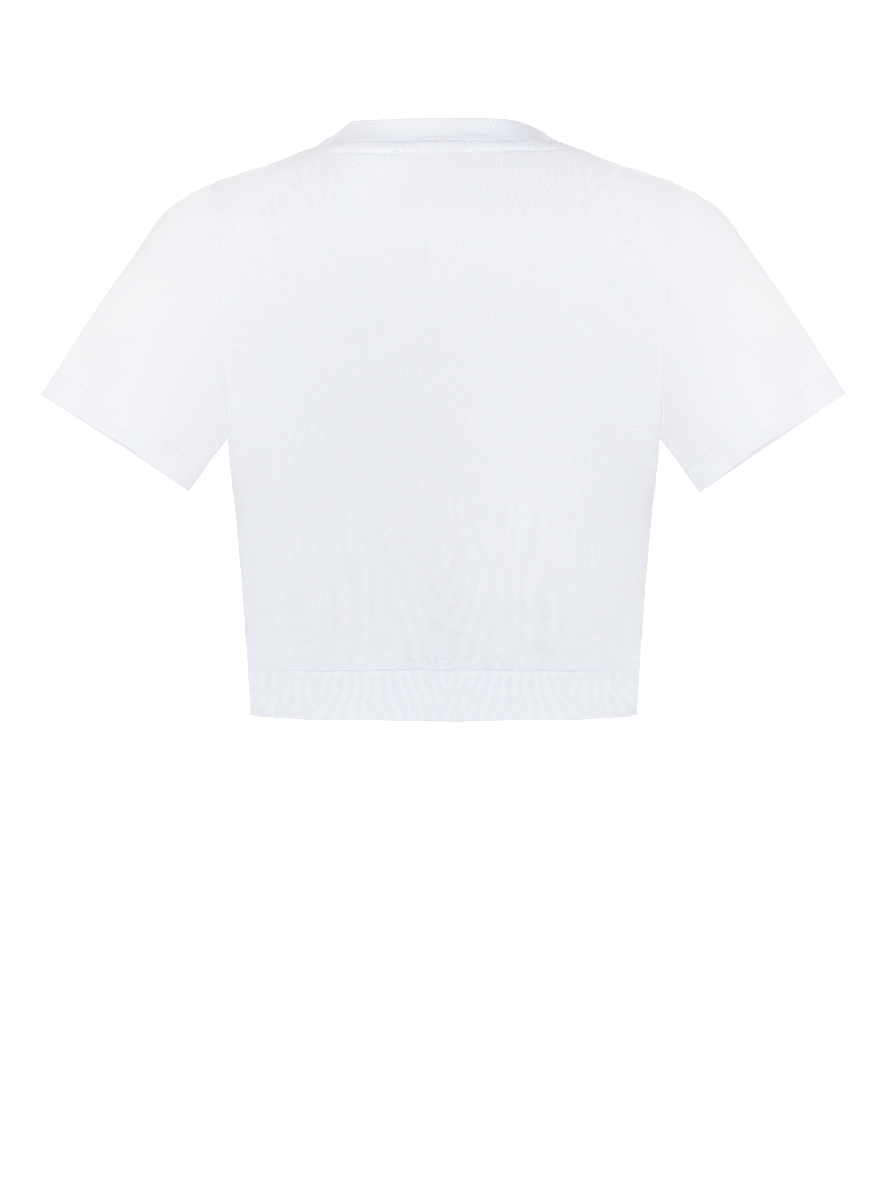Cropped white T-shirt with a sensual print. The body-hugging model is made of cotton with added elastane. Crew neck, short sleeves, wide trim at the hem.