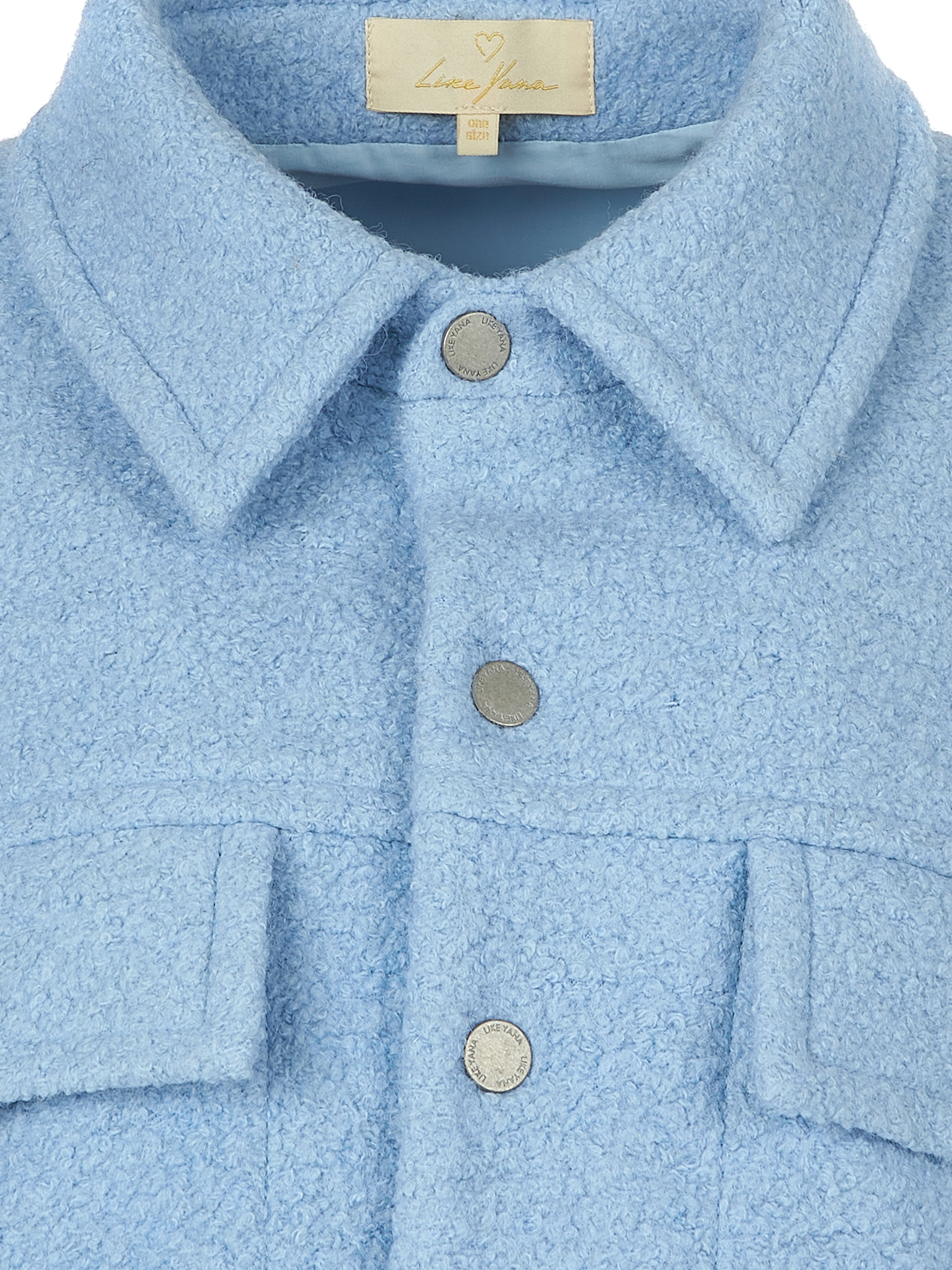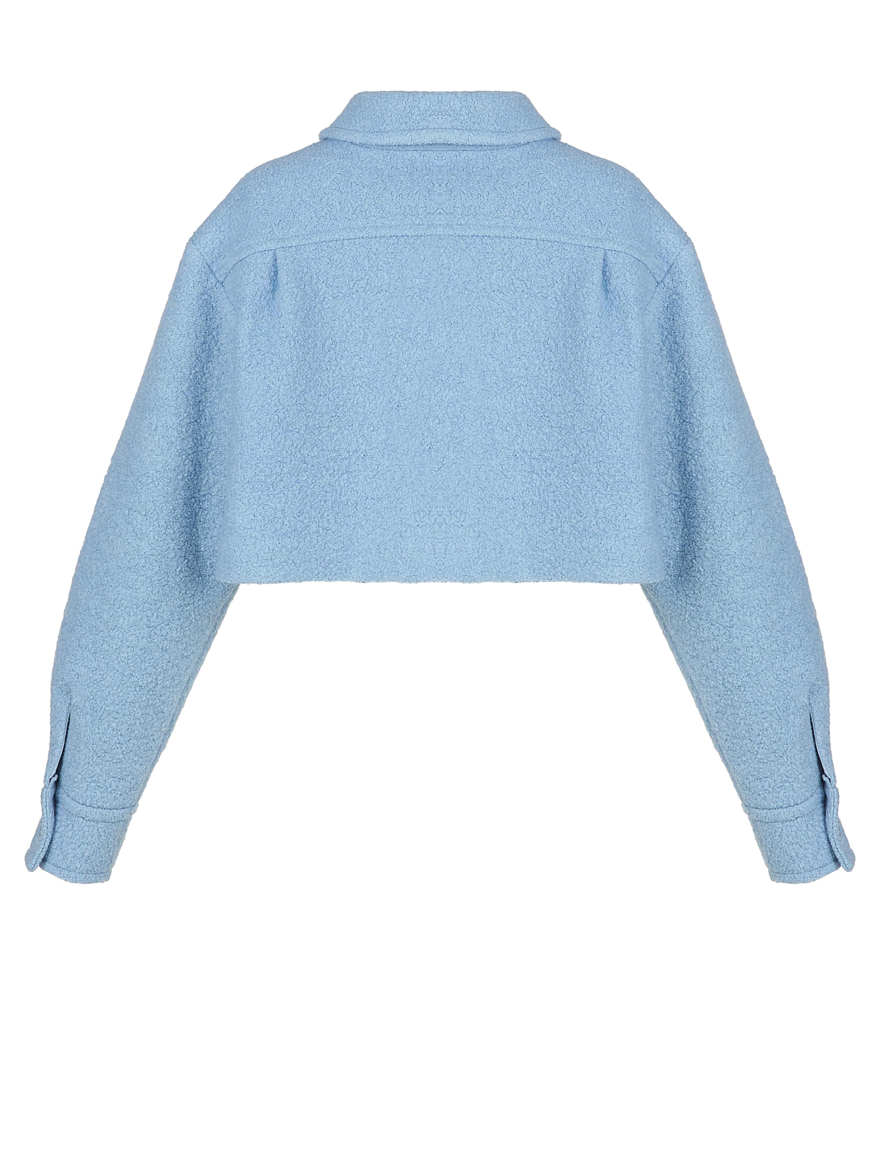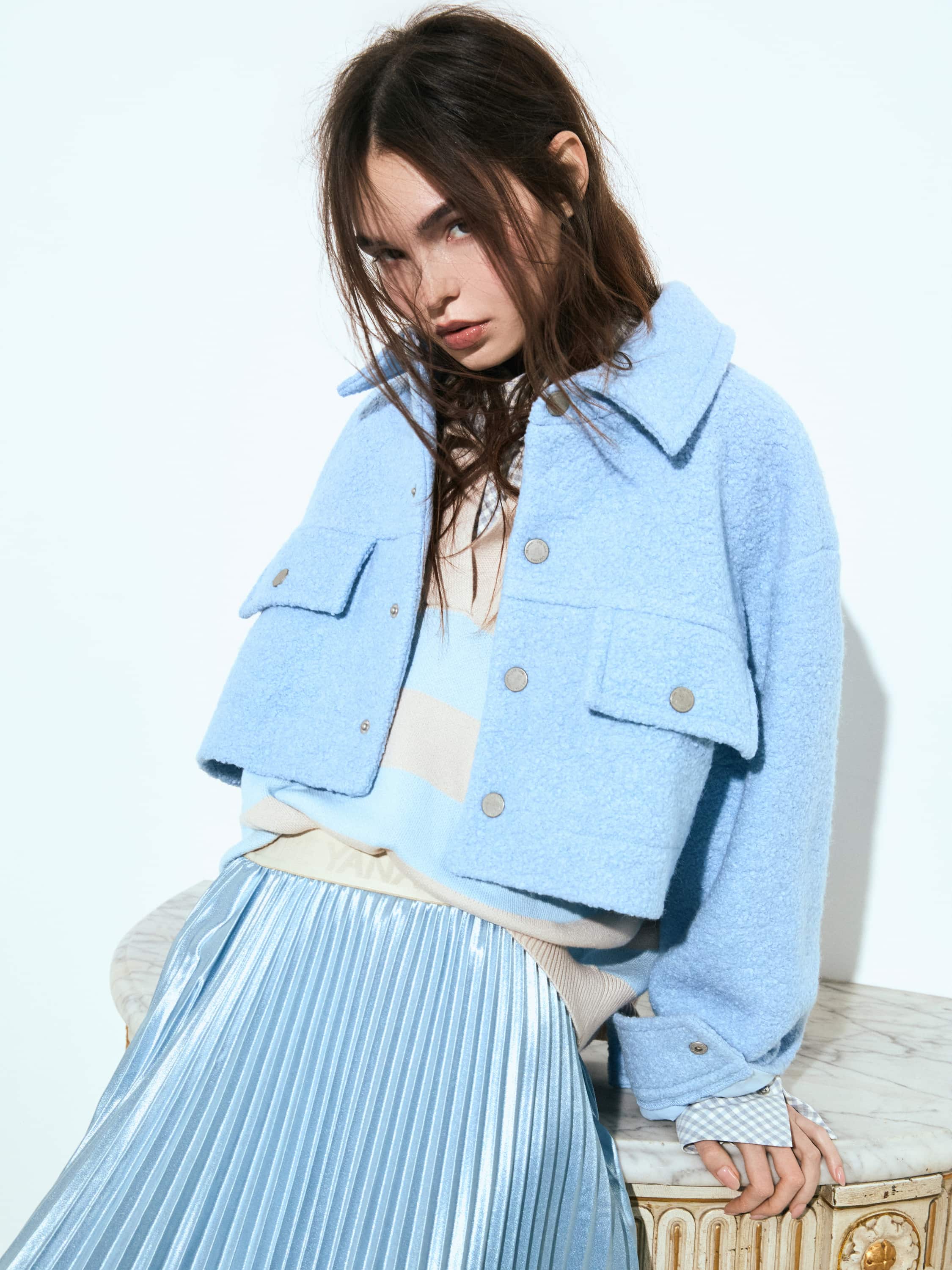 The cropped shirt-jacket with snap buttons is made of light blue bouclé with added wool. This ultra-trendy piece will look great with a fitted bodysuit and fashionable wide-leg jeans. Model’s height: 173 cm.
