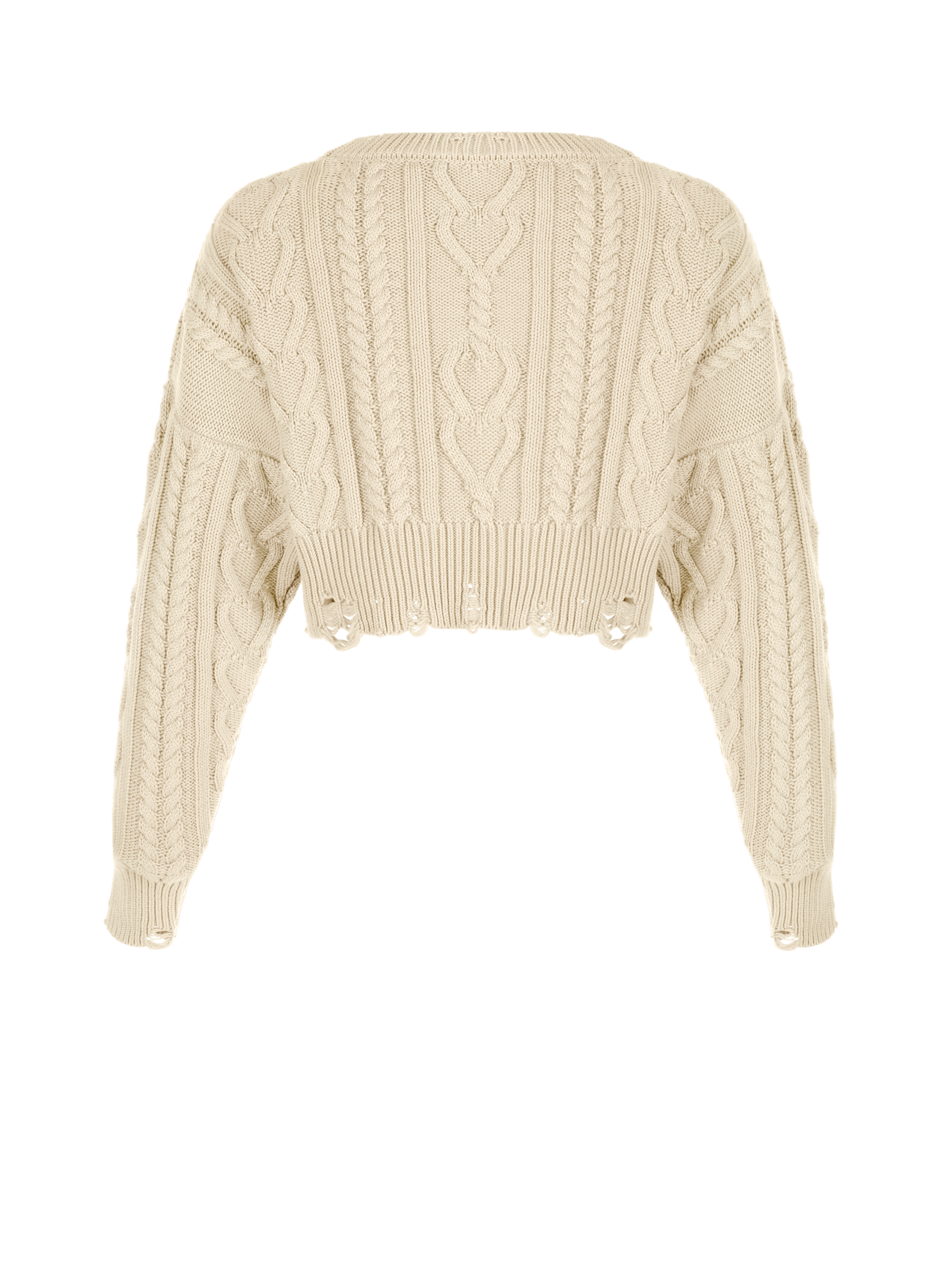 Cropped light beige oversized sweater made of cotton blend with a cable-knit pattern. The classic design looks fresh and modern thanks to the dropped stitches that decorate the hem and cuffs. Mix with high-waisted jeans or trousers.