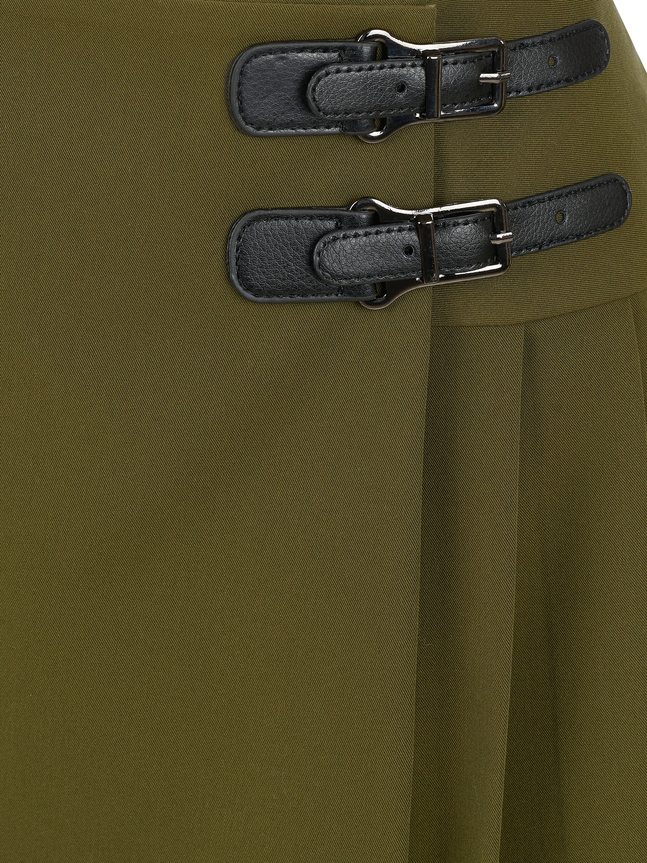 The flared khaki pleated tennis mini skirt is made of a viscose blend. The model is cut wrap-style and complemented by black belts with buckles.