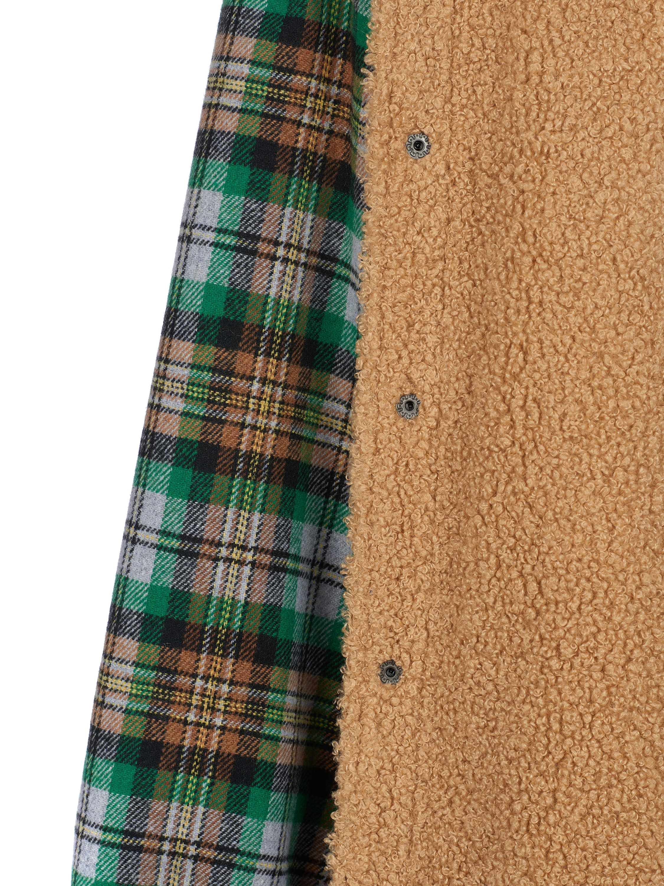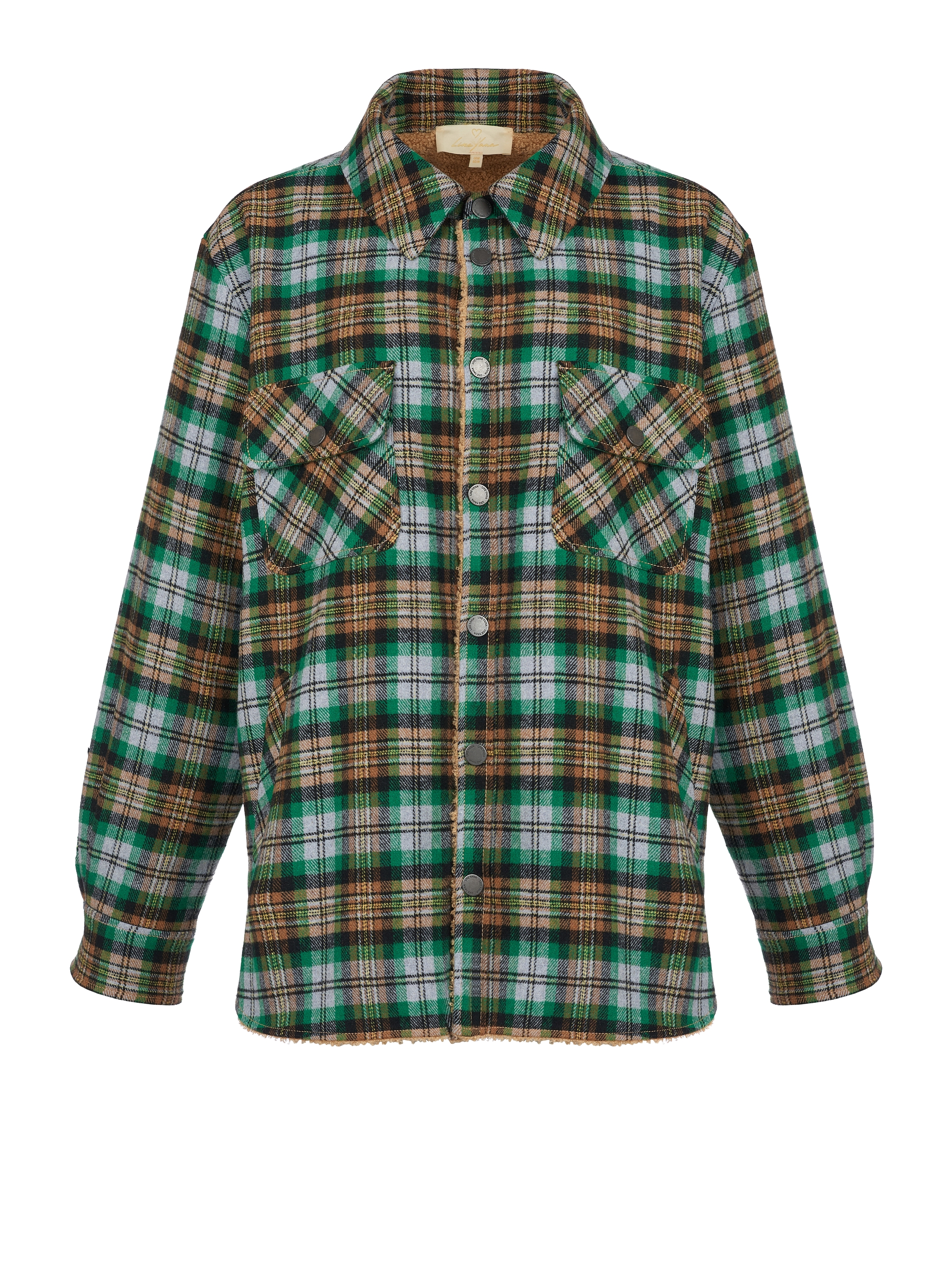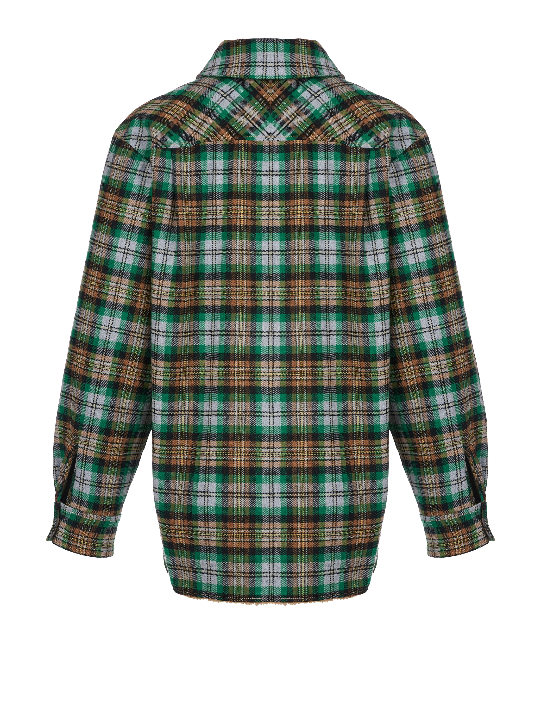 The green and brown checked shirt is made of a wool blend and complemented with a beige faux fur lining. The shirt fastens with snap buttons at the front and has two patch pockets.