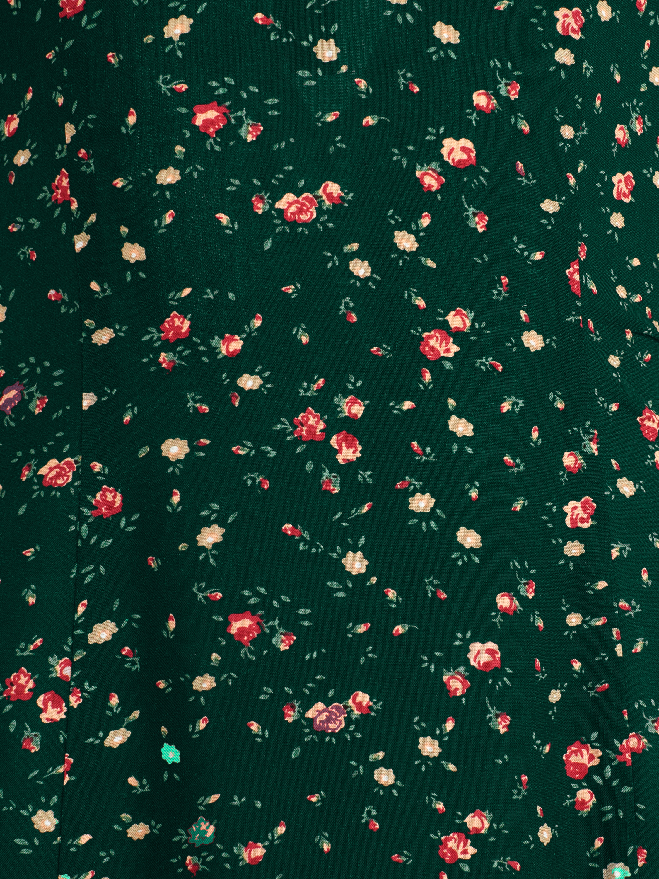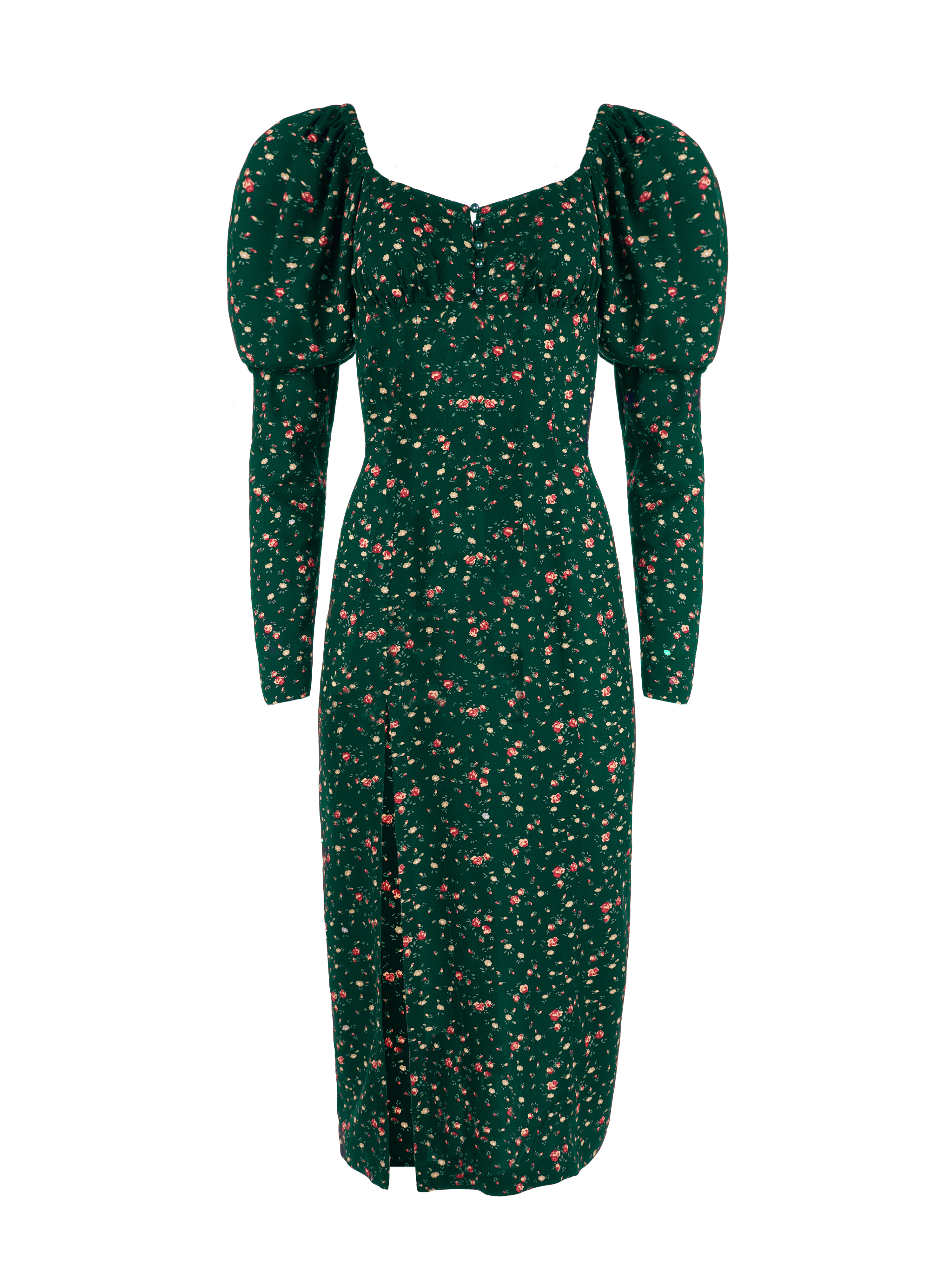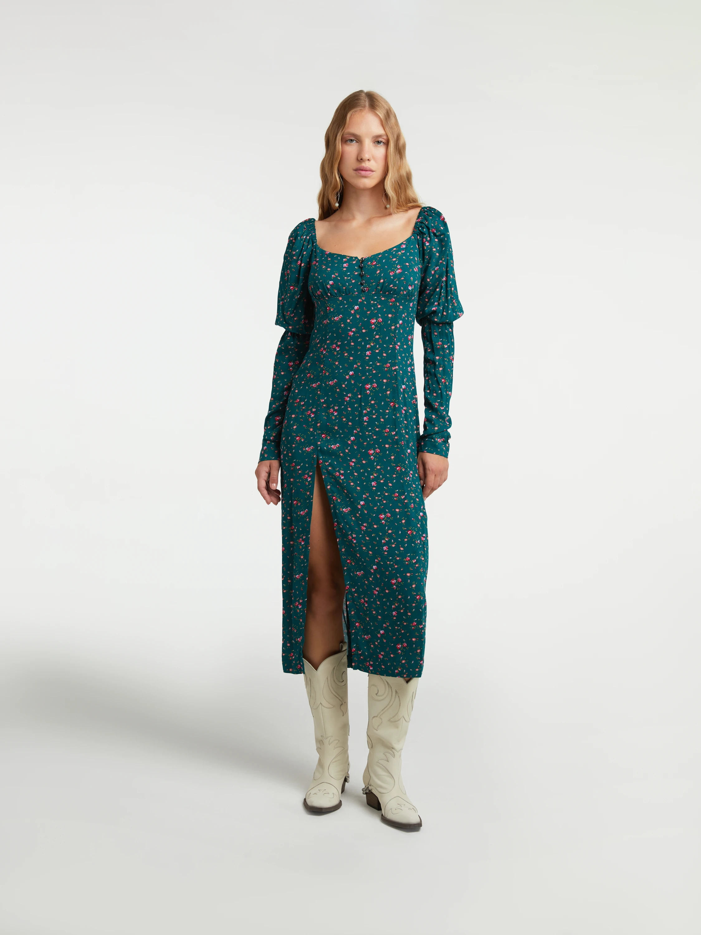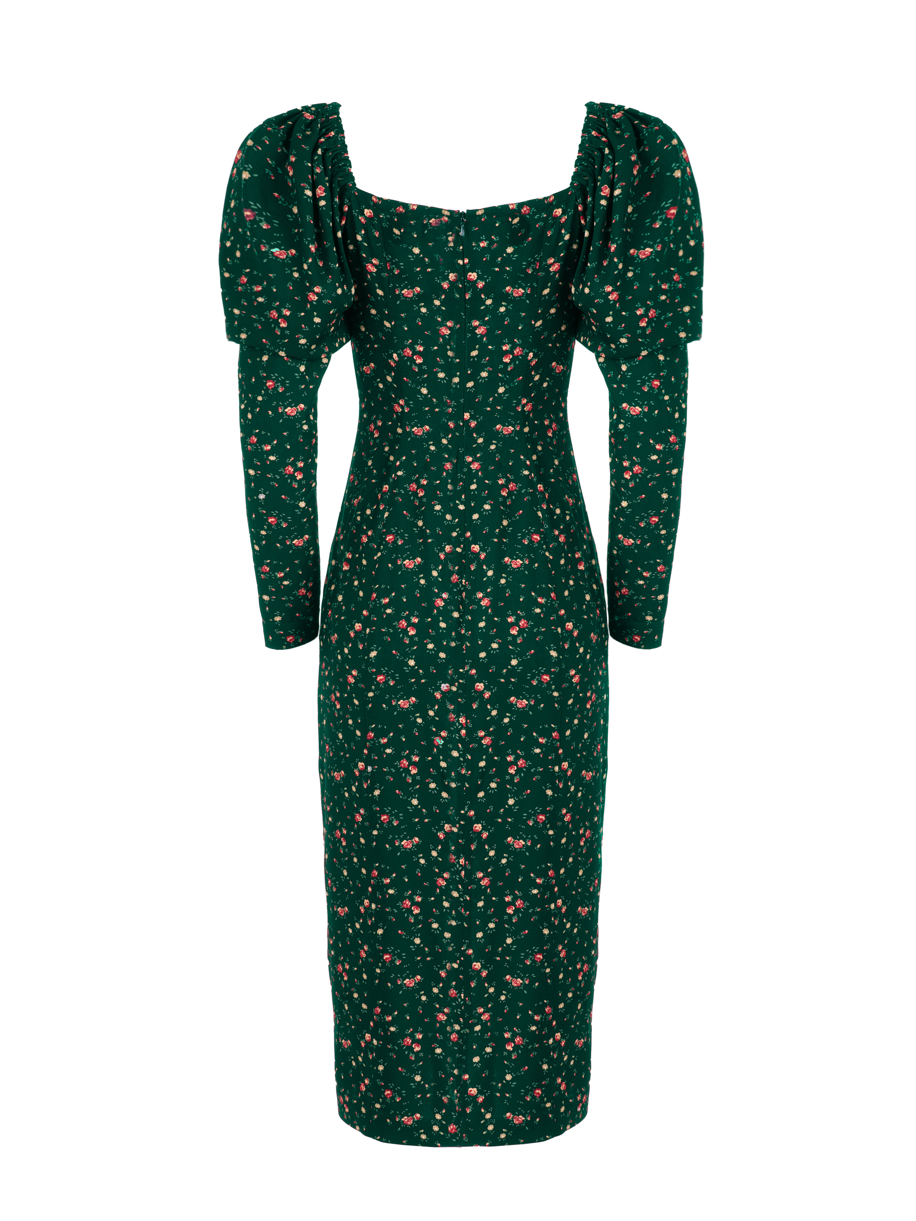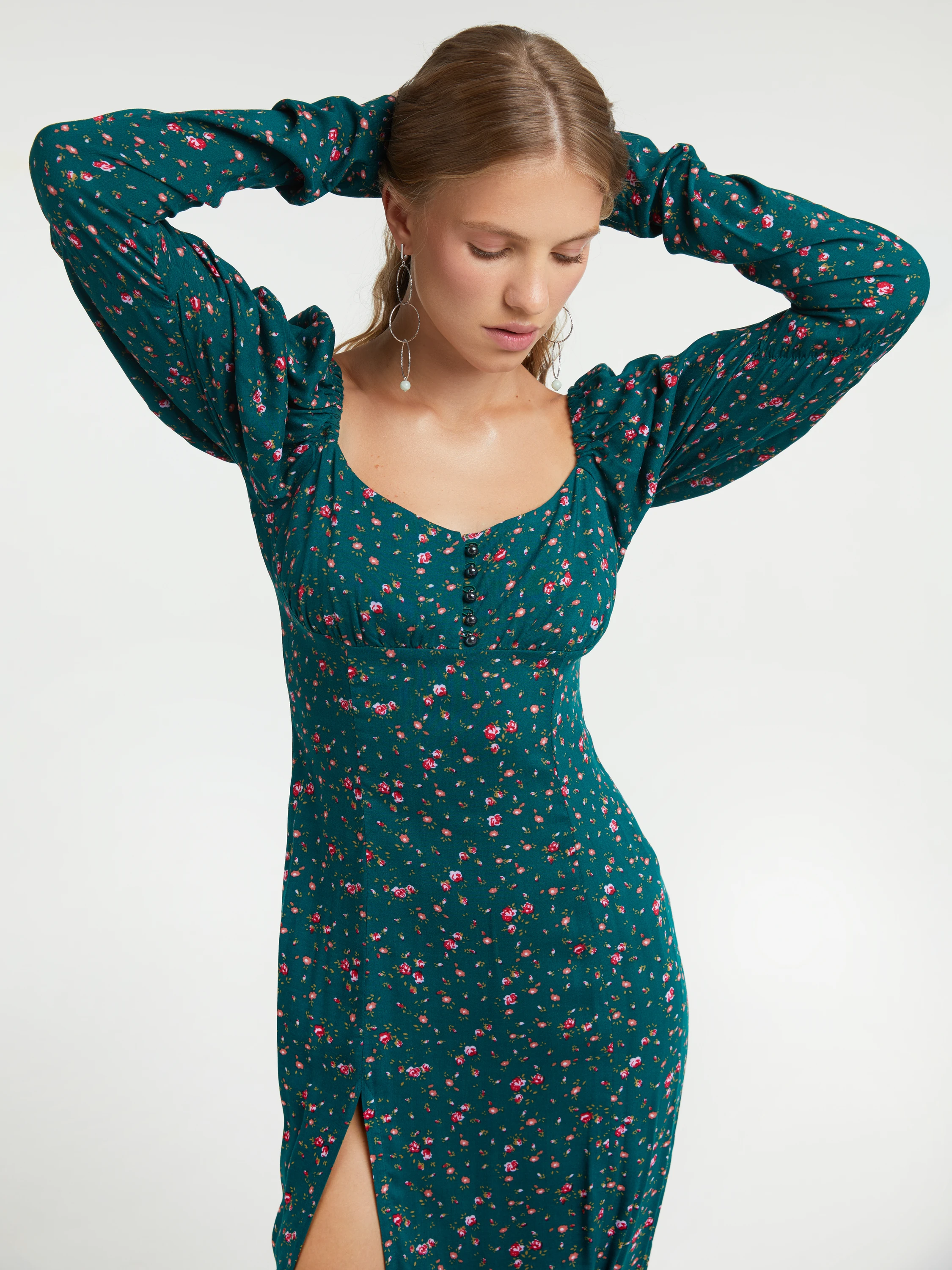 The green midi dress with floral print is made of viscose. The model is complemented by a shaped neckline, long leg-of-mutton sleeves and a high slit at the front. Back zipper closure.