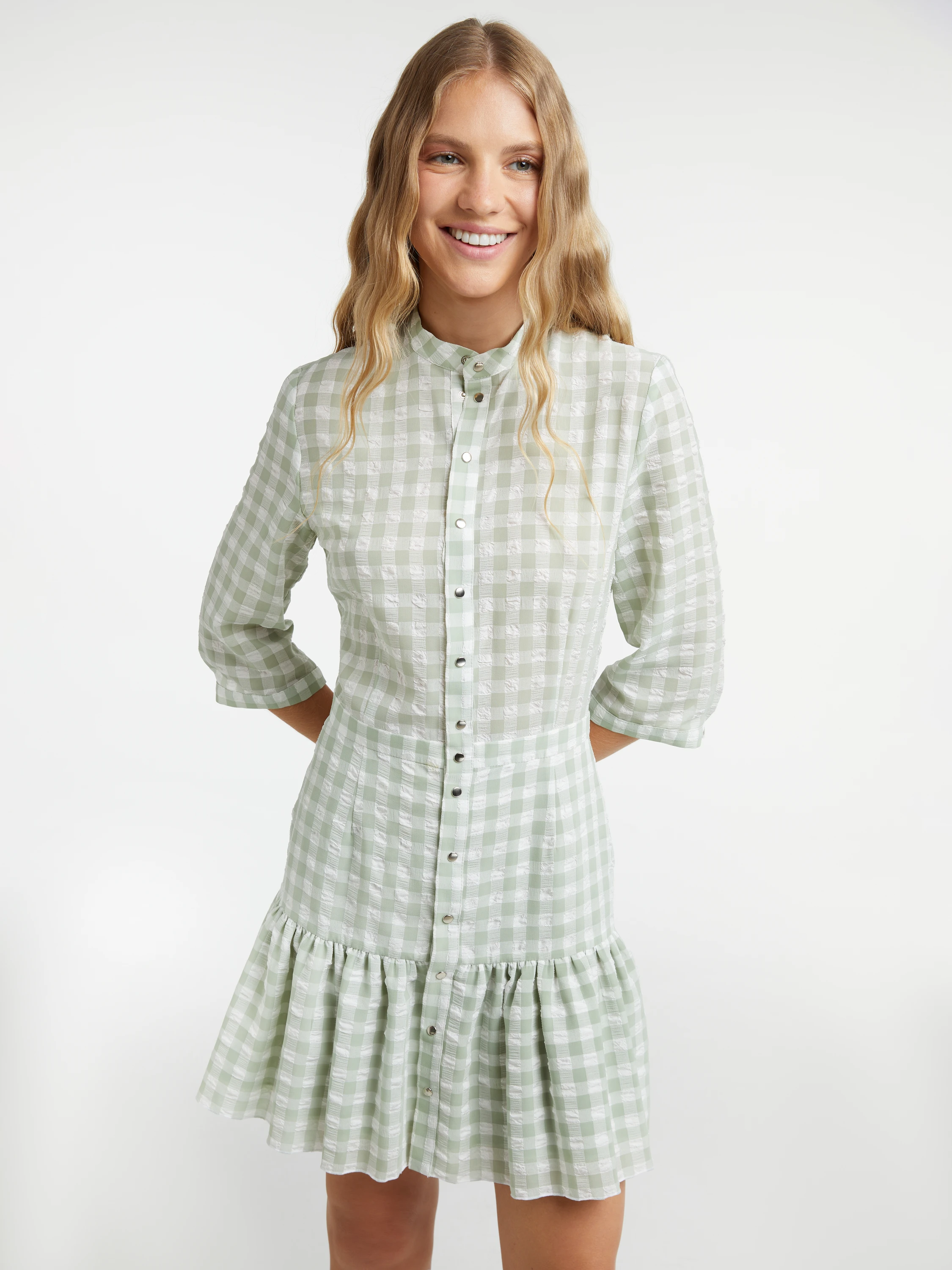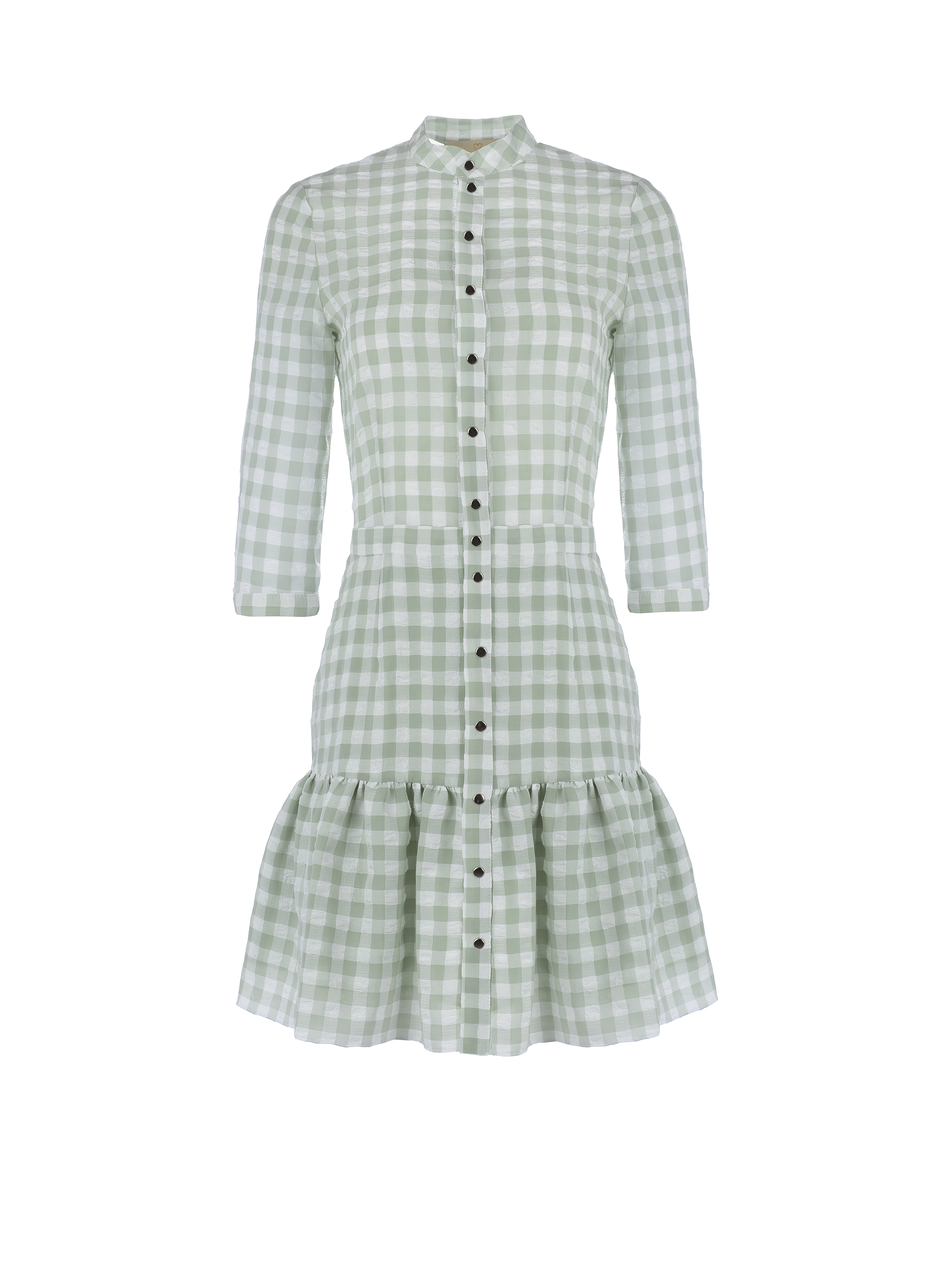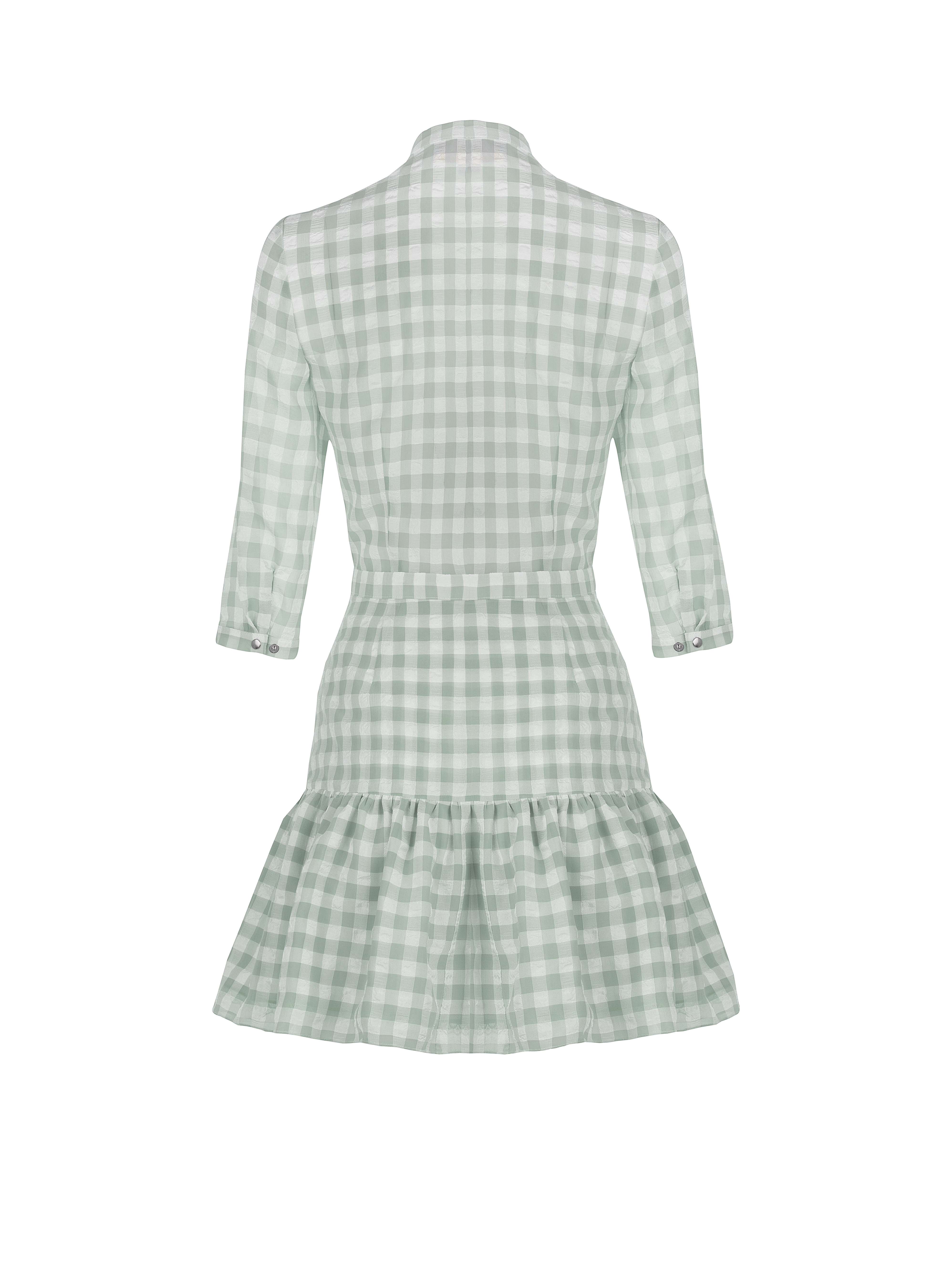 Mini dress made of lightweight white and green checked chiffon. A stand-up collar, shortened 3/4 sleeves, and a hem with one tier.
